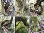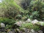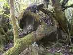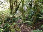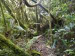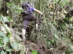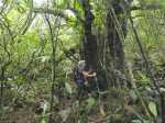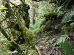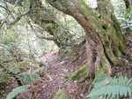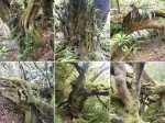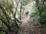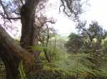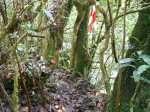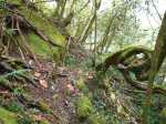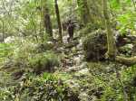 La randonnée débute en rive droite de la Rivière d'Abord en partant du radier sur la route de Notre Dame de la Paix (Photo 1). On circule sur une partie étroite entre la rivière et une barre rocheuse où poussent déjà de beaux tamarins qui ne resteront pas des siècles en raison de l'équilibre instable (Photo 2). Remarquer un peu plus loin les racines de branles verts sur les roches qui se sont recouvertes de terre afin de se nourrir et se protéger. Le sentier est agréable, en pente douce et longe au plus près la Rivière d'Abord (Photo 3). On parvient au premier gué qui passe au plus près d'une cascade dont on aperçoit le bassin dans le fond (Photo 4). Dès la traversée du gué sur de gros galets, les premiers escaliers de marches en rondin apparaissent. On monte doucement vers une zone recouverte de fougères (Photo 5). On profite ensuite de beaux points de vue sur les prairies et champs du côté de la Petite Ferme depuis les deux tamarins des Hauts poussant dans les fougères (Photo 6). Plus loin, c'est un autre tamarin couché qui, comme souvent, réussit à vivre dans cette position (Photo 7). Les montées et les descentes vont se succéder sur tout le trajet, jamais très longues mais parfois assez raides. Les marches de plus de 50 cm sont très fréquentes et impliquent un entraînement correct ; rien à voir avec la portion du Bassin Samuel, presque plate. On passe parfois au plus près de la gorge verticale de la Rivière d'Abord (Photo 15). On aperçoit à travers la végétation les bassins d'eau noire où les randonneurs maladroits qui auraient glissé du sentier pourraient tomber. Heureusement, les plantes de toutes sortes créent une barrière naturelle. Les falaises abruptes des cascades à sec laissent imaginer le spectacle lors des forts épisodes pluvieux (Photo 10). Les panoramas sont inexistants depuis les deux tamarins mais le spectacle est au sol, à trouver le plus beau spécimen. On serpente horizontalement au gré de la rivière et verticalement au gré du relief. S'arrêter à chaque arbre significatif implique de prévoir une bonne heure supplémentaire pour effectuer ce trajet mais il faut en profiter car la concentration de belles racines est exceptionnelle. Certains arbres sont à demi-couchés, d'autres forment des arches et en cherchant bien, on découvre des espèces différentes qui ont soudé leurs branches après des années de vie en commun. D'autres vivent depuis des décennies sur des rochers qu'ils ont emprisonnés de leurs racines (Photo 16). On traverse plus loin une végétation plus serrée où le sac s'accroche facilement mais on ne coupe surtout pas ces branches d'arbres, endémiques pour la plupart. Une zone, sans doute plus humide que les autres, est composée d'arbres de toutes tailles recouverts de mousse (Photo 14). Ce ne sont que les feuilles qui permettent de les nommer. Certains passages sont assez larges pour ne pas avoir à se poser de questions sur le sentier (Photo 13). D'autres sont vraiment étroits et il est bon de ne pas se précipiter ; guetter les rares rubalises en place sur les branches (Photo 25). Plus nous serons nombreux à effectuer cette magnifique trace et plus le sentier se fabriquera naturellement. Après une bonne heure de montées, descentes, traversées de futaies ou photos d'ancêtres, on parvient à un gros acacia noir au tronc rougi par les minuscules lichens. Tout près, avec un peu d'attention, on remarque la trace ronde laissée par un alambic qui siégeait à 5 mètres d'un abri dont il ne reste plus que la maçonnerie basse (Photo 28). La cuve, photographiée en 2013 a disparu sans qu'on en connaisse la destination. Toutes les prairies qui entourent cette zone étaient couvertes de géranium au siècle dernier mais la production a été arrêtée depuis longtemps. Poursuivre vers l'aval devient très sportif par rapport à ce qui vient d'être effectué aussi est-il conseillé de faire demi-tour et compléter par le tour de la Forêt Avril si les jambes sont encore en forme et si l'heure du pique-nique n'a pas encore sonné.