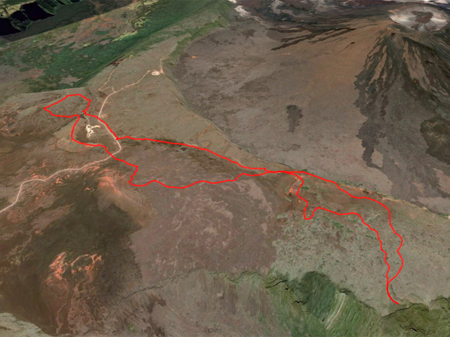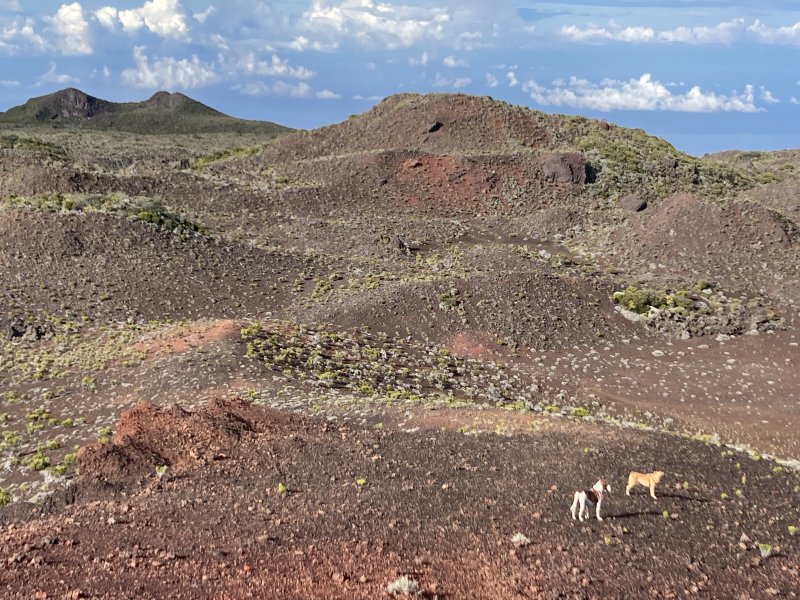 Cette magnifique randonnée s'effectue en grande partie en hors sentier mais permet, en moins de 15 km, d'escalader 5 pitons de la région de la Plaine des Sables ainsi que le magnifique et très photographié Demi-Piton. Il donne également l'occasion de fouler du pied les énormes cratères Aubert de la Rue, trop peu visités alors qu'ils sont très proches de la route du volcan. Les deux tiers du parcours s'effectuent hors du GRR2 qui mène au Tremblet. On se laisse donc guider par les particularités du sol recouvert de branles verts et autres plantes d'altitude, de cailloux de lave, de vieux troncs calcinés ou de sable. Le circuit donné sur la carte ci-dessous n'est donc qu'indicatif puisqu'on a la possibilité de passer où c'est le plus facile. On a toujours devant les yeux le prochain piton et il est impossible de s'égarer. La meilleure manière de marcher, quitte à rallonger le parcours, est de suivre les places vierges fabriquées par les millions de ravinements de l'eau de pluie qui a toujours empêché la végétation de s'installer. Ceci explique le caractère non rectiligne du tracé ci-dessous. En calculant bien, il est impossible de se griffer les jambes hormis l'arrivée au Piton Rond de Langevin où il faut traverser une dizaines de mètres de végétation plus dense.