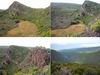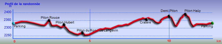 La randonnée débute au parking du GRR2 en direction du Tremblet. La piste ou le sentier sont larges et faciles jusqu'à la première ascension de la boucle. La marche est en descente très légère sur ce circuit le plus classique pour assister aux éruptions situées au sud de la Fournaise. On passe près d'un oratoire original fait de l'empilement de plaques de lave et on parvient sans effort au pied du Piton Rouge (Photo 1). Pas de sentier visible mais il s'escalade sans trop de difficulté si on prend le soin de monter à la manière des mules (c'est à dire en créant de courts lacets). Cette méthode présente l'avantage de laisser les cailloux en place. En fonction de la position du soleil, on comprend très bien pourquoi il se nomme ainsi (Photo 2). Une fois la courte escalade terminée, on aperçoit devant soi les Pitons Cambar et Hubert. La traversé ne pose aucune difficulté dans une végétation très pauvre, constituée de minuscules branles verts et de quelques touffes d'herbe rase (Photo 3). Le premier rencontré, le Piton Cambar s'escalade facilement. De belles natures mortes laissées par de très anciens incendies traînent au milieu des plaques de sable (Photo 4). Le cratère est tout en longueur, bordé de rochers dont certains hauts et pointus (Photo 5). Après avoir bifurqué sur la gauche pour contourner une faille, la descente est un peu plus sportive au milieu de ces rochers, mais sans danger (Photo 6). Nouvelle traversée entre les branles qui tentent de survivre à cette altitude froide et sur un sol pauvre (Photo 7). Le Piton Hubert est très proche et se rejoint en quelques minutes. De ce nouveau sommet, on peut évaluer le trajet emprunté pour arriver ici depuis le Piton Cambar (Photo 8). On aperçoit aussi de mieux en mieux le Piton Rond de Langevin (photo 10) pour repérer le point blanc qui se remarque sur la droite. La descente s'effectue par le sud en longeant le bord du cratère au fond recouvert de joncs (Photo 9). C'est la preuve qu'il y a de l'eau qui reste en cas de fortes pluies. La traversée est toujours aussi aisée sur le sable (Photo 11), dans des ravines de 30 cm de large ou sur l'ancien sentier qu'on remarque aux vieilles taches de peinture blanche qui n'est pas encore effacée. Garder un œil sur le point blanc au pied du Piton Rond de Langevin qui est en réalité un gros caillou peint (Photo 12). La végétation s'intensifie un peu à l'approche de ce piton qui dépasse d'une quarantaine de mètres. Viser le caillou blanc et traverser au hasard une dizaine de mètres un peu plus touffus que le reste. En montant sur l'arête, on comprend également l'origine de son nom dû à la forme ronde de son cratère comportant également une petite prairie au milieu (Photo 13). On peut, sans trop de danger, parcourir la totalité de la lèvre du cratère pour bénéficier de plusieurs panoramas sur ses faces rocheuses (Photo 14). Du sommet de ce piton, on profite de panoramas splendides sur toute la région du volcan, du Piton des Neiges, de la côte vers Saint-Joseph et surtout du Morne Langevin (photo 15). Repartir jusqu'au caillou blanc et rejoindre le sentier du Piton de Bert en partant vers l'est. On retrouve à nouveau des bribes du vieux sentier en traversant une végétation identique à la précédente. Au sentier officiel, cesser pour un temps le hors sentier et revenir vers le Piton Rouge. Le dépasser et obliquer aussitôt vers la gauche pour aller à la rencontre des cratères Aubert de la Rue. La montée s'effectue presque en droite ligne sur des coulées anciennes en peau d'éléphant fissurées (Photo 17). Quelques traces blanches sont peintes sur les rochers mais bifurquent vers l'ouest après 200 mètres ; sans doute un parcours rejoignant à l'époque celui du Piton du Rond de Langevin. On peut admirer tout au long de la montée de magnifiques tunnels de lave, entiers ou effondrés, des grottes ou des crevasses (photo 18). Il faut marcher sur les parties épaisses et peu friables car une cassure du sol ne peut être exclue. On arrive très vite au premier cratère dont on atteint le fond par quelques acrobaties (Photo 19). Le traverser pour rejoindre le plus grand d'entre eux qui permet d'avoir une très belle vue sur le centre du cratère (photo 20). Comme la descente dans le cratère peut être dangereuse, partir vers la route du volcan en passant entre le Chisny et les cratères. On passe près de petits tunnels de lave (Photo 21) et surtout d'imposantes crevasses qui peuvent inquiéter (Photo 22). Attention tout de même à ces crevasses qu'il faut parfois enjamber. En arrivant à la route, il n'y a aucune difficulté à repérer le Demi-Piton et à l'escalader en suivant toujours la ligne de crête. Un sentier discret existe et longe les parties basaltiques non érodées (photo 24). La marche s'effectue sans hésitation, sans danger et sans vertige malgré certaines pentes verticales (Photo 24). On a, de ces divers points, d'excellents panoramas sur la région volcanique. La descente est un peu raide mais sans danger jusqu'au Sentier Josémont. Il ne reste plus qu'un piton pour terminer cette randonnées toute en dents de scie. Le Piton Haüy s'escalade calmement à travers la végétation rabougrie ou inexistante (Photo 25). Là-haut, de grandes failles coupent le sommet en plusieurs parties. On peut marcher sur le bord ou au fond pour certaines (Photo 26). On peut profiter également des panoramas sur la région, le Cassé de la Rivière de l'Est et la Plaine des Sables (Photo 27). Le clou de la boucle se situe en fin de parcours quand on tombe nez à nez avec cet adorable petit cratère rond au milieu du grand (Photo 28). La descente et le retour ne sont qu'une formalité après toutes ces ascensions.