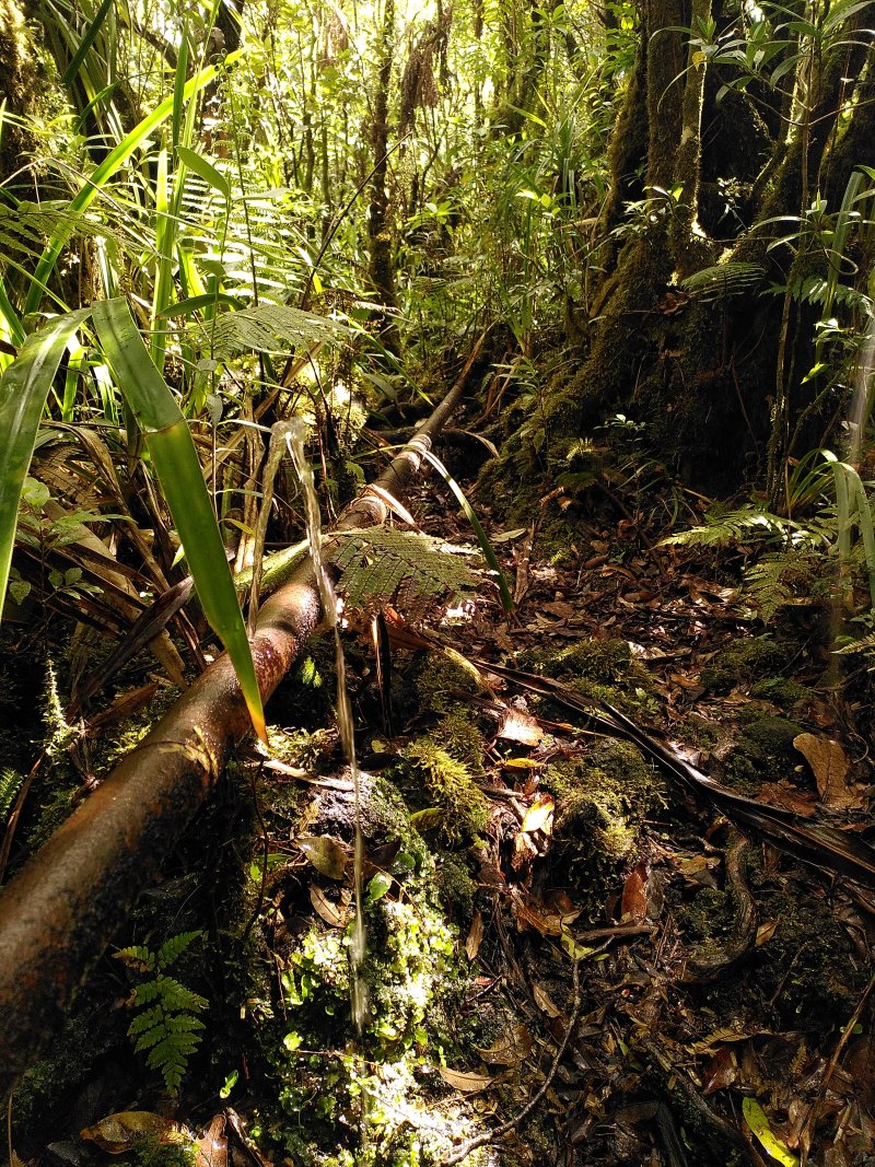 En effet, ce sont des centaines de mètres de canalisations qui ont été portés et soudés dans une végétation hostile mais surtout sur une pente de plus de 50% de dénivelé (voir profil). Les derniers mètres avant la source s'effectuent à quatre pattes et en s'aidant des branches ou arbustes. Un coup de chapeau aussi au découvreur de la source qui ne disposait pas à l'époque d'un hélicoptère pour la reconnaissance.