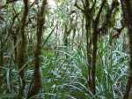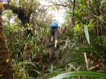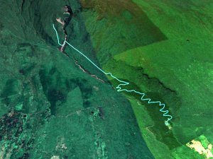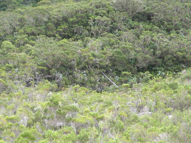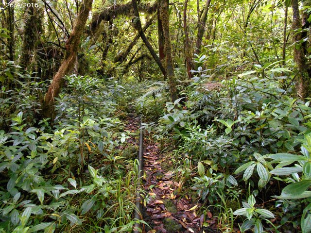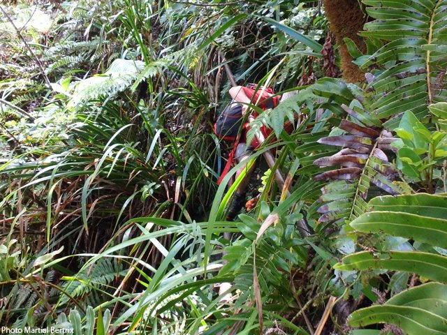 La randonnée débute au Gîte de Basse Vallée qu'on rejoint après une longue montée sur la petite route à double sens (Photo 1). La Route Forestière du Rond passe devant le gîte et pénètre sous les cryptomerias (Photo 2). Marcher sur cette très agréable piste recouverte de cailloux ou d'herbe jusqu'à son terminus en longeant des aires de pique-nique abandonnées, démontées ou dans un triste état car la piste, très chaotique, décourage sans doute les familles qui n'ont pas le temps de marcher depuis le gîte (Photo 1). Cette partie de mise en jambe s'effectue facilement et rapidement. La piste se termine d'un seul coup par une zone de demi-tour et il faut chercher un peu des yeux le sentier qui se poursuit le long de la canalisation. Des ruches sont installées sous les grands conifères mais on laisse travailler les ouvrières (Photo 4). On remarque depuis quelques temps une petite canalisation posée au sol. Une fois sur le sentier, impossible de se perdre le long de ce long tuyau, totalement rectiligne (Photo 5). Le sentier effectue un court virage avant de repartir sur la droite. Dans l'angle, le sentier qui menait à la Ravine de Basse Vallée est de plus en plus bouché par des milliers de sabres marrons (Photo 6). On pouvait encore, il y a quelques années, se balader plus facilement dans le fond de cette rivière rocheuse et remonter jusqu'à la cascade en amont mais il faut désormais y mettre beaucoup de bonne volonté. Poursuivre sur un tracé très rectiligne dans les bois de couleurs et quelques vignes marronnes (Photo 7). Difficile, au début, de perdre de vue le sentier étroit car il est encore bien tracé (Photo 8). En période pluvieuse, les sabres mouillés trempent les vêtements (Photo 9). Inutile pourtant de les éviter car ils sont si nombreux et serrés par endroits qu'on ne peut les éviter (Photo 10). Quelques trouées dans la forêt permettent de voir le rempart de la Vallée Heureuse et les premières pentes en direction de la source (Photo 12). Quelques courtes pentes se grimpent sur de hautes marches et les mains sont parfois utilisées (Photo 13). Le tuyau épouse la forme du terrain, descend vers les ravines et remonte de l'autre côté en servant de rampe d'escalier (Photo 14). La portion qui peut sembler difficile aux marcheurs peu habitués à la brousse prend fin bientôt quand on aperçoit devant la vallée du Bras d'Alix (Photo 15). On marche alors dans une superbe végétation de bois de couleurs, de branles verts couverts de mousses, d'épiphytes, de fougères (Photo 16) ou d'orchidées (Photo 19). Le sentier est toujours aussi étroit dans les branles et fausses osmondes (Photo 17). Il devient très pierreux, voir rocheux par endroits (Photo 18). On arrive ainsi au Bras d'Alix et sa canalisation qui l'enjambe (Photo 22). Le Bras d'Alix est un torrent sans eau, très rocheux, offrant en amont une belle vallée qu'on peut visiter en fin de descente, au retour (Photo 23). Trois solutions sont alors possibles à partir de la ravine. La solution facile consiste à remonter le bras jusqu'à la cassure de la Cascade (non prévue sur la carte). Il suffit de faire attention où poser les pieds sur les innombrables galets. Le détour revêt un peu plus d'importance s'il y a de l'eau dans la cascade (rare). Si on manque d'habitude de ces milieux, faire demi-tour par le même sentier. Une solution plus sportive consiste alors à redescendre le Bras d'Alix par rapport au tuyau et retrouver plus bas et en rive droite le petit cairn (Photo 4) et le sentier qui repart vers l'amont et ne tardera pas à remonter de manière totalement abrupte jusqu'au captage de la source. Cette partie est à réserver aux sportifs qui n'ont pas peur de se salir les mains en les posant au sol ou en agrippant les branches, seule manière de remonter le long du tuyau sans chuter ou glisser vers le bas. La canalisation, toujours visible, sert de guide et de corde à nœuds ; l'effort économisé pour trouver le passage sert à la poussée jusqu'au captage. Les points de vue sur la vallée sont nombreux dans la montée (Photo 26) et (Photo 27). La modeste source est plus un suintement qu'une cascade et l'eau est récupérée par un minuscule barrage avant d'être canalisée (Photo 28). La descente est beaucoup plus scabreuse mais les arbres sont assez nombreux pour servir de rambardes naturelles. Sortie pédagogique sur les métiers des poseurs de tuyau qui doivent avant tout être de bons randonneurs. Quand le mal de cuisse est trop fort, il suffit de penser aux deux ouvriers qui tenaient le tuyau pour le monter toujours plus haut et l'ajuster aux autres posés là les jours précédents. Ils devaient maintenir l'équilibre, grimper les mêmes pentes tout en travaillant simultanément alors que le randonneur est en plein loisir. Le retour s'effectue par le même sentier et comme l'effort est terminé, on a tout le temps de chercher la plus belle orchidée.