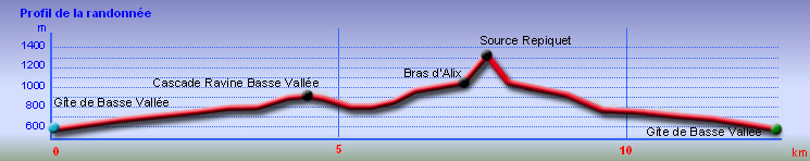 Se rendre à Basse Vallée, entre Saint-Joseph et Saint-Philippe - A l'église, remonter la route forestière jusqu'au Gîte de Basse Vallée - Garer son véhicule au gîte - Remonter la Route Forestière du Rond jusqu'au terminus constitué d'un rond-point rudimentaire - Le sentier débute sous les cryptomerias et rejoint un peu plus loin une petite ravine - Prendre à droite dans la ravine sur 5 ou 6 mètres vers la Source Repiquet - Le sentier suit le tuyau de transport de l'eau - Arrivé à une ravine profonde et rocheuse, le Bras d'Alix, affluent de la Ravine de Basse Vallée, traverser la ravine et laisser le tuyau pour bifurquer sur la gauche sur une vingtaine de mètres - Le sentier reprend vers la droite et rejoint la canalisation en rive droite - Suivre à nouveau le tuyau jusqu'à la source - Attention, la piste est extrêmement raide et les glissades possibles à tout moment, surtout à la descente - Le retour s'effectue par le même itinéraire. Avant de rentrer, suivre la ravine du Bras d'Alix jusqu'à une cascade à sec qu'on atteint au bout d'un bon quart d'heure d'escalade de rochers et de galets.