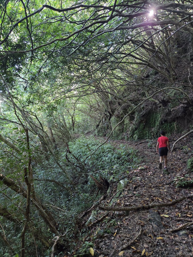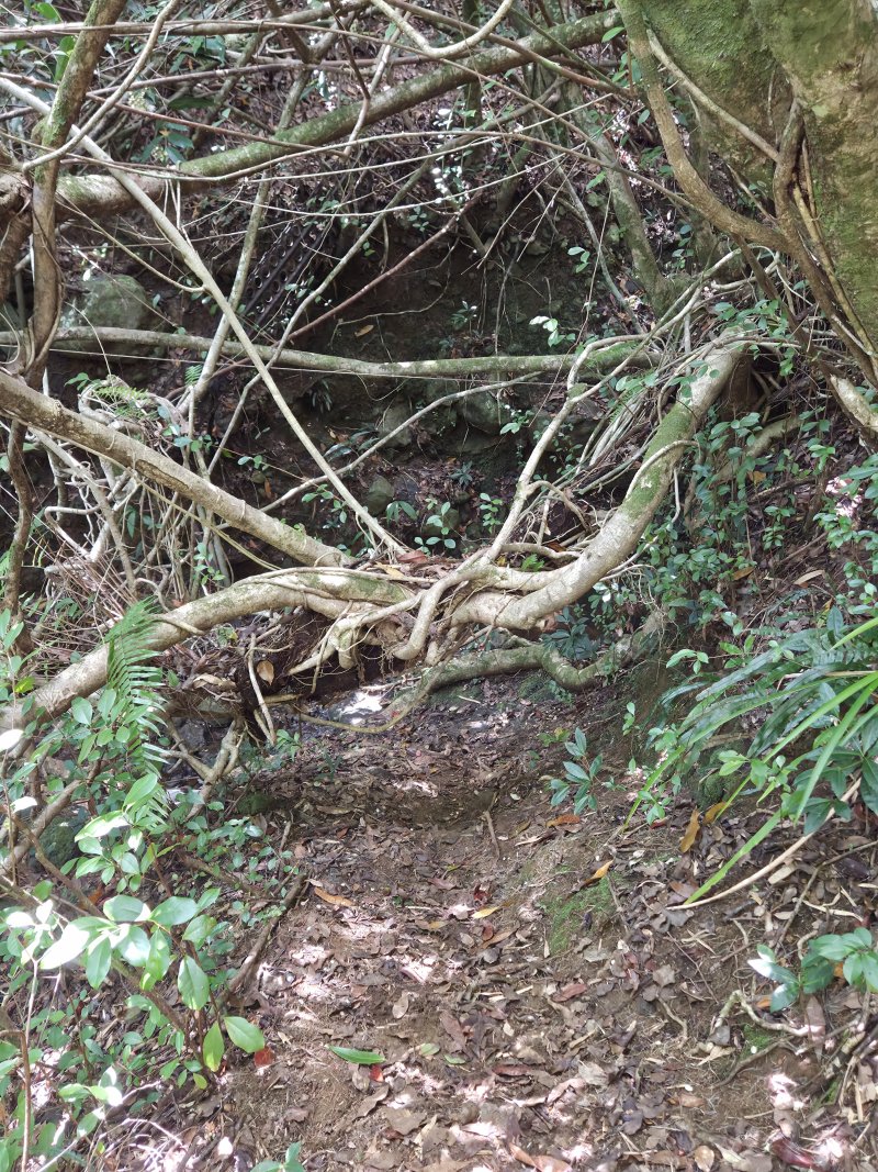 La randonnée débute au terminus du bus 37 (Arrêt Montée Sano) qui emprunte la Route de Bellevue en venant de Ste-Marie. Attention de ne pas stationner là où le bus effectue sont demi-tour. Emprunter la route étroite depuis le virage de la Racine Coco et marcher jusqu'au château d’eau sur la droite, dont la grille n’est jamais fermée à clé (Photo 1). Le sentier, large au départ, commence à plat en direction des bois qui entourent le village et la vallée de la Rivière Ste-Marie (Photo 2). Il se rétrécit et se rapproche de la Ravine du Bernica surmontée d'une passerelle rouillée. On peut encore passer par l'ouvrage vieillissant mais il est préférable d'emprunter le gué (Photo 3). On entend couler une cascade sur la gauche. Avant de poursuivre, il est conseillé de trouver le sentier en rive gauche qui se divise très vite en deux. Partir à droite sur une forte pente constituée de nombreuses marches en terre (Photo 4). Se rapprocher du petit bassin et de sa belle chute avant de remonter vers la passerelle (Photo 5). Traverser le gué sur des galets glissants avant de pénétrer dans un tunnel de végétation créé par des jamrosats bordant une ancienne piste (Photo 6). Le cheminement est très facile dans une végétation clairsemée de plantes envahissantes dont de nombreux goyaviers (Photo 7). Le sentier longe le bord de la pente qui domine la rivière, ondule en fonction du relief, traverse une nouvelle ravine qui coule en mince filet (Photo 8). On rejoint très vite le Bassin Bleu qu'on ne peut pas totalement voir depuis le sentier qui le domine d'une cinquantaine de mètres (Photo 9). On est frappé par le peu d'eau qui coule de cette haute chute. On comprendra pourquoi en arrivant au sommet de la prochaine cascade. Un minuscule sentier, difficile à discerner dans les fougères, débute près du point de vue (Photo 10). Tout le monde ne pourra pas le pratiquer en raison de multiples difficultés (Photo 11). La pente est raide et comporte quelques très hautes marches (A). Il est souvent difficile à suivre des yeux dans une végétation touffue (B). On doit, à un moment, contourner un arbre tombé au sol pour reprendre la plongée vers la rivière (C). Si on ne le contourne pas rapidement, on se retrouve sur une magnifique racine de camphrier imposant de faire demi-tour (D). La difficulté est oubliée avec l'arrivée au grand bassin (Photo 12). L'endroit est sauvage. Une minuscule cascade coule près d'une grotte en rive gauche (Photo 13). Cette grotte issue d'un ancien tunnel de lave est peu profonde (Photo 14). La cascade, quant à elle, est rarement exceptionnelle malgré sa hauteur (Photo 15). La remontée, très sportive, permet de retrouver le point de vue sur la cascade. En profiter pour voir également le panorama sur la côte et la vallée de la rivière (Photo 16). La végétation en direction du Piton Charpentier est très touffue (Photo 17). Le sentier poursuit sa balade en sous bois, très sombre parfois, en longeant la ligne de courbe et en coupant de petits ruisseaux qui laissent présager d importantes chutes d’eau en période pluvieuse. Le passage est creusé dans la falaise et les parties étroites sont équipées de mains courantes (Photo 18). Il n'y a pourtant aucun danger depuis que les goyaviers ont envahi le ravin et qu'il est impossible d'y tomber. Ce câble, parfois très long, sécurise les barres rocheuses enlevées pour faire passer la tuyauterie qu'on devine à peine au sol sous les feuilles mortes. Certaines portions d'un ancien canal apparaissent par endroits mais ne pourraient pas retenir 10 litres d'eau. On arrive enfin au début de la passerelle. Elle permettra d'atteindre la cascade qu’on aperçoit à une centaine de mètres. Le sol est constitué d'une grille recouverte de feuilles diminuant les sensations de vertige (Photo 19). Sous la passerelle, on remarque une grotte, qui, lorsqu'on s'en approche, n'est pas extraordinaire mais est aussi un lieu de prière (Photo 20). Poursuivre le long de la falaise sur une pente presque nulle (Photo 21). On arrive très vite au bassin en longeant cette muraille (Photo 22). La chute d’eau est faible en raison du captage mais le cadre très agréable (Photo 22). On peut s'approcher du bassin par le lit rocheux de la rivière à la fin de la passerelle. Il est profond mais n'encourage guère à la baignade. On remarque un petit tunnel avant d'entamer la montée. Avec une lampe, on peut y pénétrer pour étudier l'ingénieux système de récupération de l'eau (Photo 23). Presque à la fin, une fenêtre donnant sur le vide permet de voir la cascade sous un autre angle (Photo 24). Entamer ensuite la rude montée sur de hautes marches renforcées par des contre-marches en alu (Photo 25). Le câble mis ici pour protéger est surtout utile pour s'aider à escalader ce rempart. On profite de belles vues sur le bassin durant l'ascension (Photo 26). Au sommet de la cascade, la vue est encore plus impressionnante (Photo 27). On rejoint plus loin le captage reconnaissable à sa grosse grille qui empêche des galets de tomber dans le tuyau mais qui a bien souffert des assauts du dernier cyclone (Photo 28). Vu le principe de collecte de l'eau, on comprend que lorsque le niveau de la rivière est faible, les cascades sont très fines. La canalisation est prioritaire sur l'alimentation des bassins. Le sentier officiel s’arrête au captage mais la remontée de la rivière est possible sur les gros rochers assez peu dangereux. Le retour s'effectue par le même sentier.