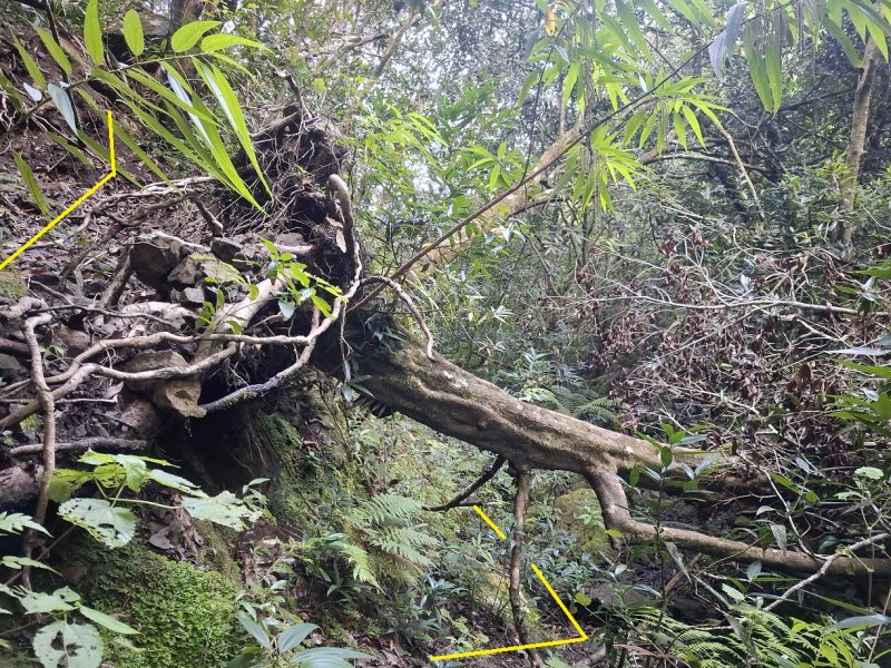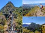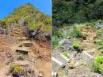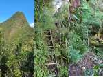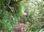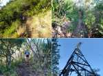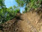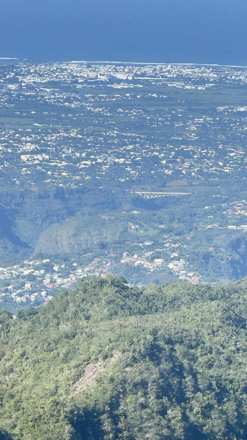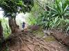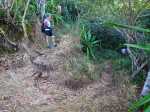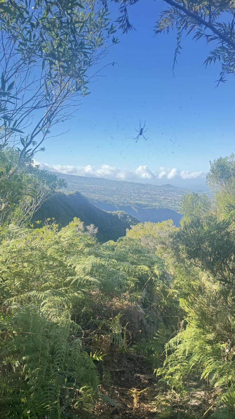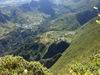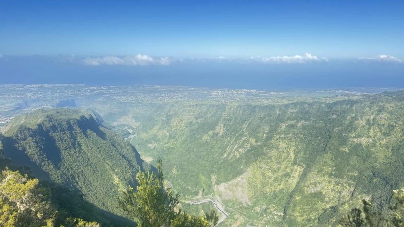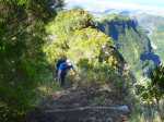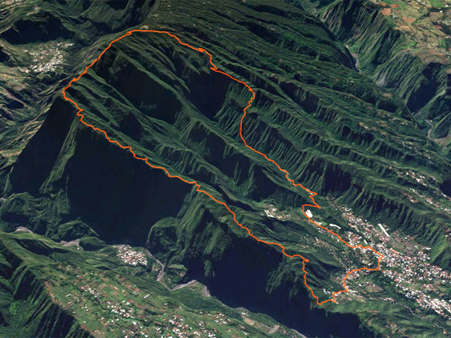 La randonnée débute à l'école primaire de Bras Long, en face de l'EHPAD. La jonction avec le sentier Bayonne, par quelques montées sur route, permet de s'échauffer avant d’entamer la très longue montée vers le Dimitile. Le quartier de Grand Fond Extérieur est assez peu urbanisé et la marche s'effectue sereinement même s'il faut se pencher vers l'avant dans les parties les plus pentues (Photo 1). Au parking pouvant accueillir une demi-douzaine de véhicules, il n'y a plus de départ pour le sentier Bayonne car il a été déplacé plus au Sud. Emprunter alors le sentier du Coteau Sec qui débute par une pente très forte dans les pierres et restes d'escaliers effondrés avec de très hautes marches (Photo 2). Pas de crainte à avoir même si l'on peut penser s'éloigner du Bayonne. On le débusque un peu plus loin sous les filaos. Partir à droite en longeant une rambarde en bambou (Photo 3). Il est moins large que le sentier du Coteau Sec, comporte peu de difficultés et chemine à flanc de falaise ou en ligne de crête jusqu'à un pylône électrique situé au bord du sentier historique (Photo 4). Partir à gauche et entamer la montée de plusieurs heures en prenant dès le départ un rythme adapté à l'effort. Le sentier, assez fréquenté malgré sa fermeture officielle, est large dans une végétation peu entretenue. Les lacets sont fréquents et permettent de diminuer un peu la pente (Photo 5). On arrive facilement, en une demi-heure, au Plateau Raisin, aisément reconnaissable à son sentier passant sous les jamrosats qui poussent si serrés que la lumière du jour a beaucoup de mal à pénétrer. Plus on s'élève, plus les panoramas s'agrandissent de tous côtés. On aperçoit la côte, les coteaux parallèles au sentier, la région des Makes vers la Fenêtre et les remparts des Bénares mais surtout les pointes en direction du Dimitile qui donnent très vite le ton de ce que sera le reste de la montée (Photo 6). Le sentier est toujours correct même s'il n'est pas très large par endroits. On rencontre à peu près tous les types de terrain : zones herbeuses, caillouteuses, terreuses, moussues, humides, bordées de fougères en passant des jouvences aux longoses ou dans les éternels goyaviers ou jamrosats (Photo 7). La pente est constante et les portions de plat très rares (Photo 8). Le sentier est autant en corniche qu'en ligne de crête (Photo 9). Les araignées se plaisent sur le bord des remparts où de grandes toiles peuvent accrocher le vêtement si on est le premier à passer. Ne pas hésiter à se retourner pour profiter des magnifiques panoramas allant jusqu'à l'océan (Photo 10). Le sentier passe souvent le long de l'arête proche du précipice dominant le Petit Serré dont on aperçoit les maisons à l'ombre en regardant vers le Bras de Cilaos. Les sensations de vertige sont rares en raison de la végétation toujours présente (Photo 11). Quand on peut voir la moitié du Cirque de Cilaos, les cryptomerias de la Fenêtre des Makes en face ou une grande partie de la route sinueuse qui rejoint Cilaos, le plus gros de la montée directe est terminé. En revanche, débutent alors une série d'une demi-douzaine de descentes et remontées successives. On utilise souvent des lignes de crêtes dénudées où la trace est de très bonne qualité (Photo 12). Les branles de petite taille facilitent les panoramas qu'on ne quitte jamais (Photo 13). Après 2h50 de montée constante, on atteint un passage un peu vertigineux mais qui a été récemment protégé d'une rambarde (Photo 14). Le sentier quitte parfois l'arête pour emprunter le flanc du rempart mais les montées ne disparaissent pas pour autant. Les points de vue sur Cilaos se multiplient. Il faudra pourtant remonter encore pour redescendre avant la dernière ascension menant au Dimitile. On rencontre quelques éboulis dont un important qu'il faut délaisser et poursuivre sur le sentier de plus en plus difficile à deviner (Photo 15). Les belles portions creusées dans le sol et maintenues par des marches souffrent de plus en plus (Photo 16). Quand on peut voir le Bonnet de Prêtre et le Sommet de l'Entre Deux, il ne reste plus que deux fortes montées où des échelles permettent de passer les pentes les plus abruptes (Photo 17). Les points de vue grandioses sur Cilaos méritent quelques haltes pour se régaler du paysage et souffler un peu (Photo 18). Les premiers tamarins des Hauts annoncent enfin l'arrivée proche du sommet. Quand on profite des panoramas sur Cilaos on est impressionné par la verticalité du rempart en direction de l'Îlet à Calebasse (Photo 20). Quelques barrières protègent du vide avant de se diriger vers le point de vue classique (Photo 21). Après un arrêt à la table d'orientation pour situer les principaux sommets ou îlets, la jonction avec le sentier de la Grande Jument ne prend que quelques minutes. Les jouvences sont plus fréquentes et plus touffues que lors de la montée mais le sentier reste visible. Plus bas ce sont les sabres qui bordent le sentier (Photo 22). Ne pas marcher le nez en l'air car le sentier est étroit et le précipice très vertical. Heureusement la végétation est assez touffue pour freiner une éventuelle chute hormis à la verticale des sources du Grand Bras. On traverse de longues portions recouvertes de branles verts sur un sol rouge et glissant (Photo 23). On atteint rapidement la jonction des Sentiers du Zèbre et de la Grande Jument. Celui du Zèbre est plus boueux et comporte plusieurs lacets dans les bois de couleurs avant d'arriver au départ du Sentier Marron (voir § ci-dessous pour le trouver sans difficulté). La plongée sur ce sentier est immédiate et violente (Photo 24). Le sentier n'est pas très visible mais instinctif. Les marches dépassent le mètre de hauteur et les racines ou arbustes sont indispensables (Photo 25). Après une centaine de mètres très techniques, le sentier devient presque de bonne qualité et le reste 
