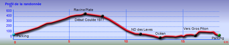 Se rendre à Bois Blanc entre Saint-Philippe et Sainte-Rose - Se garer au Camping Jeune de Bois Blanc en roulant vers les aires de pique-nique aussitôt avoir passé la Ravine Ferdinand en venant de St-Philippe - Remonter à la RN2 par le même itinéraire et marcher en direction de Piton Sainte-Rose - 500 m plus loin, bifurquer à gauche et prendre le Chemin Touzet vers les radiers - Passer tous les lacets et une dizaine de radiers puis marcher jusqu'à la Coulée de 1977 et à la Ravine Mangassaye - 20 mètres avant la ravine, prendre à droite une des deux pistes qui descendent dans la Coulée de 1977 - Descendre jusqu'à Notre Dame des Laves - A l'église entourée de laves, prendre à droite la RN2 et marcher 100 mètres avant de tourner à gauche dans l'aire de pique-nique de Piton Sainte-Rose - Traverser toute la zone en suivant la piste qui mène à la mer - Bifurquer à droite sur le sentier en direction de l'Anse des Cascades - Après la Pointe Rouge tourner à droite sur le discret sentier du Quai de Sardine et rejoindre la route de l'Anse des Cascades - Marcher en descente sur 200 m et prendre le sentier de droite qui grimpe au Gros Piton - Suivre le sentier de gauche qui longe le rempart et redescend à l'aire de pique-nique de Bois Blanc, point de départ.