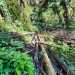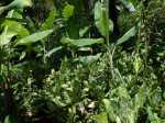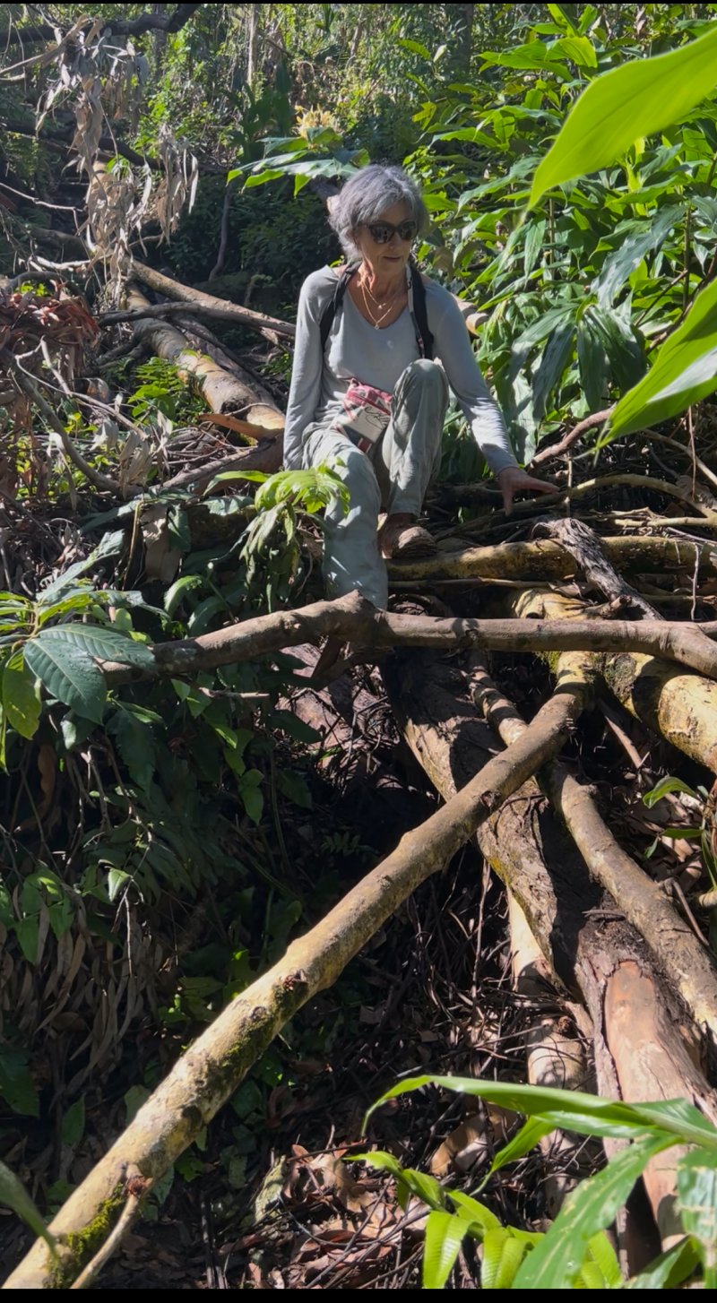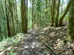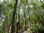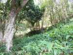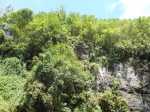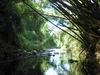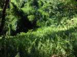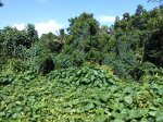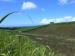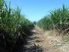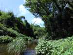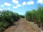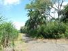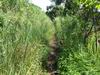 Avant de rejoindre le bocage, on peut s'éloigner du sentier pour en trouver un autre, plus discret qui débute à la première touffe de bambous (Photo 20). La végétation est luxuriante (Photo 20). Le sentier est étroit et difficile à suivre mais on peut se rapprocher de la petite rivière aux calmes (Photo 21). La trace se poursuit vers l'aval mais la végétation a beaucoup trop envahi les lieux et on perdrait du plaisir à poursuivre. Au retour, après avoir remonté le sentier, il est également possible de partir sur la gauche et de suivre la piste laissée au début pour effectuer une boucle dans les cannes (circuit violet sur la carte de la photo 26). Cela rallonge en créant une boucle mais attention tout de même aux chiens à moitié fous qu'on trouve à la première case : le bâton s'avère même nécessaire. On retrouve sur la totalité du rajout ces grands champs de canne à sucre sur des pistes faciles et presque plates (Photo 25). Ce supplément, pourtant agréable, n'a pas été intégré au profil ci-dessous.