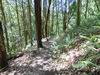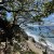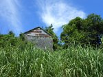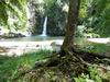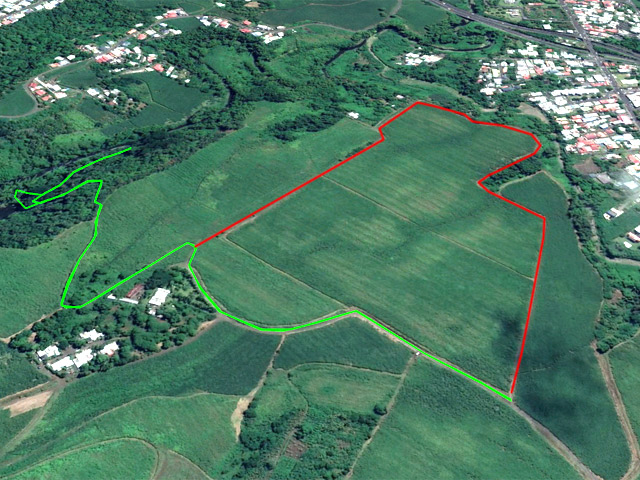 La randonnée débute sur le bord de la route du Bocage où une grande propriété entourée d'un parc semble avoir été un peu remise en état. Si on décide de poursuivre au retour par les champs de canne, se garer après le croisement vers le Lotissement Bocage New York (voir carte). Cette option est conseillée car il est plus facile de stationner qu'au plus près de la propriété où des roches ont même été mises sur le côté pour dissuader, tout comme des pancartes de propriété privée. On est dans les cannes depuis un bon kilomètre et on ne les quittera plus jusqu'à l'orée du bois qui pousse sur les rives escarpées de la Grande Rivière Saint-Jean. Se rapprocher du portail de la propriété. Une route part sur la gauche (Photo 1), une autre, sur la droite. Prendre celle de droite et longer la clôture de la propriété. Plusieurs pistes partent ça et là (Photo 2). Rester au plus près de l'enceinte et filer sur la gauche pour contourner une petite ravine par un lacet dans les hautes herbes (Photo 3). Il passe au plus près de bâtiments délabrés du Bocage avant de partir sur la droite (Photo 4). Plus loin, la piste file tout droit et on a envie de rester dans ce champ qui procure quelques panoramas vers la mer (Photo 6). C'est pourtant celle de gauche qui amènera plus sûrement à la lisière (Photo 7). Ne pas longer cette lisière mais chercher tout de suite le départ. Le sentier qui descend vers la cascade est assez bien marqué et ne peut se manquer, près d'une vieille tôle ondulée. La descente est courte et alterne parties un peu raides et plates sous de grands arbres qui procurent de l'ombre (Photo 8). Prendre tout son temps pour les admirer même si le sol est parfois recouvert de longoses (Photo 10). Certains spécimens ont atteint des tailles très respectables (Photo 11). On entend le bruit de la chute avant d'arriver à de grosses touffes de bambous (Photo 13). Le bassin qu'on devinait déjà du haut du sentier se présente (Photo 14). Le bruit de la chute, lui, était perceptible depuis les champs de cannes. La cascade n'est ni très haute, ni très forte mais le cadre rocheux qui l'entoure est très agréable (Photo 15). L'eau transparente invite aussitôt à la baignade qui peut s'effectuer sans danger à condition de ne pas trop approcher le pied de la chute. Une plage de galets peut même accueillir un pique-nique ou des jeux d'enfants (Photo 16). De hautes falaises bordent l'ensemble (Photo 17). Comme la randonnée est très courte on peut donc rester ici à loisir à admirer ce superbe endroit à quelques encablures de Saint-André. Attention aux moustiques présents une bonne partie de l'année.