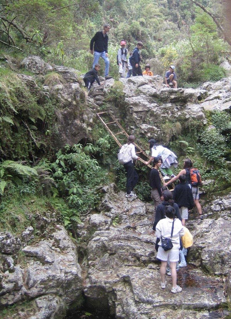 Ils ont bien de la chance ces randonneurs qui ont pu effectuer cette boucle sans se griffer et ont profité pleinement des paysages et surtout des deux curiosités géologiques trouvées au dernier bassin sous la forme d'une arche naturelle et d'une trouée dans le rocher. Mais ces randonnées s'effectuaient au début de ce siècle ; en 2005 déjà on parlait de la végétation qui commençait son envahissement. Hormis quelques arbres bien abrités, il faut de bons yeux pour repérer les traces des balises rouges et jaunes qui étaient régulièrement peintes sur les rochers. Les vestiges de couleurs (voir § ci-dessous) existent encore et permettent de se rassurer lorsqu'on se pose la question de savoir si on est dans la bonne direction. Le cheminement est glissant dans la descente du chemin vers la Ligne des Seize Cents mais encore plus sur les rochers humides du fond de la ravine qu'on remonte sur une bonne distance. Pas de panorama, des pestes partout, des sentiers difficiles à suivre et le clou du spectacle uniquement visible depuis le haut du ravin : voici rassemblées quelques excuses pour ne pas aller voir de plus près cette belle ravine. Pour en avoir une meilleure idée, voir le livre de Luc Reynaud, "Les plus beaux paysages de la Réunion en 90 randonnées", édition 2005 à la page 146 et profiter de la journée pour randonner sur un autre circuit. Les aventuriers dotés de l'esprit "randopitons" auront certainement la curiosité d'y aller voir de plus près. Attention : Cette boucle est dangereuse et il ne faut surtout pas y amener des enfants.