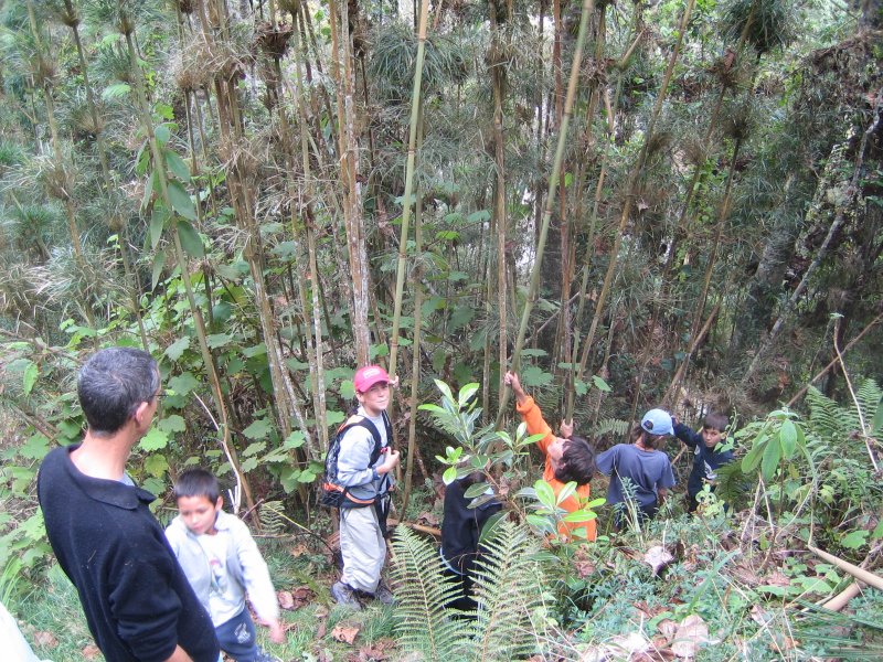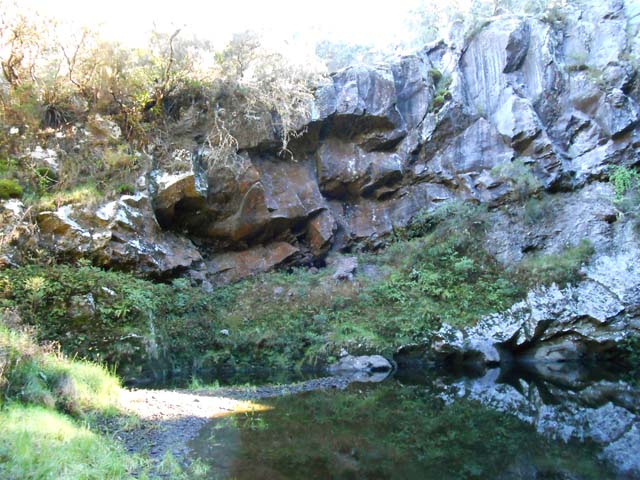 La randonnée débute au grand parking situé à deux pas du croisement des deux routes du Maïdo et du Tévelave où une pancarte rappelle les circuits VTT de la zone. Plusieurs pistes ou sentiers partent vers le bas entre les kiosques et la Ravine Divon. Cette boucle débute ici au plus près des installations de pique-nique. Un sentier discret commence entre deux tamarins et s'élargit un peu plus bas à mesure qu'il descend vers l'Ouest (Photo 1). La fraîcheur du matin est agréable mais l'humidité au sol a vite fait de mouiller les chaussures de marche et de rendre les parties dénudées plus glissantes qu'ailleurs. La piste se transforme en sentier qui se termine sous un grand tamarin servant de rond point aux cyclistes à VTT qui sillonnent les forêts des Hauts. Prendre alors à gauche pour longer le coupe feu de la Ligne des Seize Cents, envahi par les bringeliers sauvages et les fougères qui disputent la place aux calumets (Photo 3). A la courte mais forte pente, on voit très bien quand arrive la Ravine Divon qu'on rejoint en passant à droite dans le petit bosquet de bambous calumets. Les petits bassins et les arêtes rocheuses peuvent se passer aisément pour partir en rive gauche vers le bassin et sa petite plage de galets (Photo 5). La muraille qui le borde est infranchissable depuis le bassin. On revient donc sur ses pas pour retrouver le sentier qui longe la berge en rive droite, grimpe l'arête rocheuse qui domine le bassin et se finit en haut de la cascade à sec. Les traces rouges et jaunes disparaissent dans le fond de la ravine qu'on remonte lentement en faisant attention de ne pas glisser. On retrouve plus loin un autre bassin (Photo 8) qu'on contourne en rive gauche sur un sentier devenu invisible mais dont les traces au sol sont demeurées. Ne jamais trop s'éloigner du bord sauf pour contourner la végétation qui peut avoir envahi des portions. Une descente abrupte amène à un troisième bassin qui lui se contourne par la rive droite. Le sentier est très difficile à repérer mais on devine lors de la montée quelques bribes minuscules de peinture. Hélas, la végétation est trop dense et trop acérée pour poursuivre vers le dernier bassin et l'arche et il faut se décider à passer 7 ou 8 mètres en à-pic en s'accrochant aux branches pour rejoindre le sentier tout proche qui file vers la route dans les fougères (Photo 14). Pas d'arche, pas de bassin ni d'échelles (comme décrit sur les textes de l'époque) sans un défrichement titanesque à entreprendre le long de la ravine. Mais on se rattrape un peu en redescendant la ravine Divon après avoir atteint la route et le pont. On y trouve d'autres bassins et la marche amène sans trop de danger au haut de l'arche naturelle mais avec une visibilité très réduite sur la chute à sec. C'est du haut du rempart herbu où les vaches viennent paître ou se reposer qu'on peut voir mieux le haut de l'arche (Photo 20). Cette petite frustration passée, il ne reste plus qu'à rejoindre l'aire de pique nique et changer les chaussures alourdies par l'eau et la terre transformée en boue.