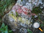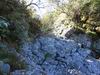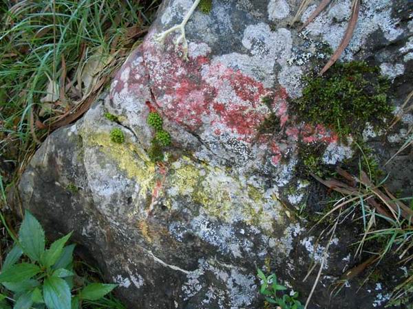 Les balises jaunes et rouges peintes il y a au moins deux décennies sont encore visibles par endroits. C'est comme ici l'ensemble de la balise qui apparaît mais le cas est très rare. C'est plus souvent une trace de la taille d'une pièce de deux euros qu'il faut dénicher sur un rocher recouvert de mousse. Ne pas chercher ces traces dans le fond de la ravine où elles ont été depuis longtemps emportées par les crues. Il ne faut donc pas oublier ses lunettes ce jour là.