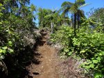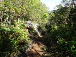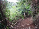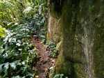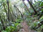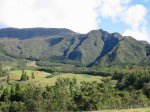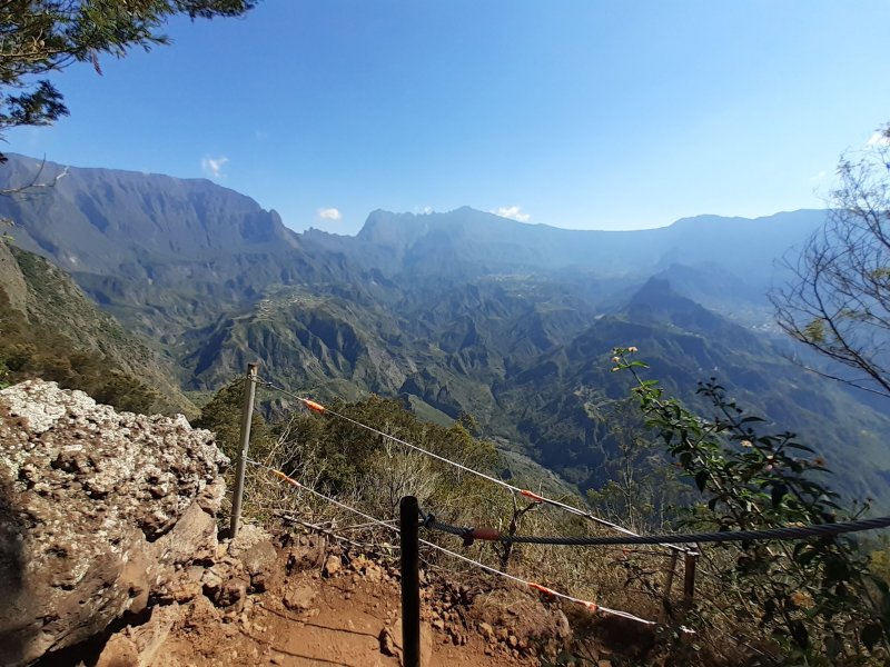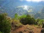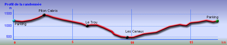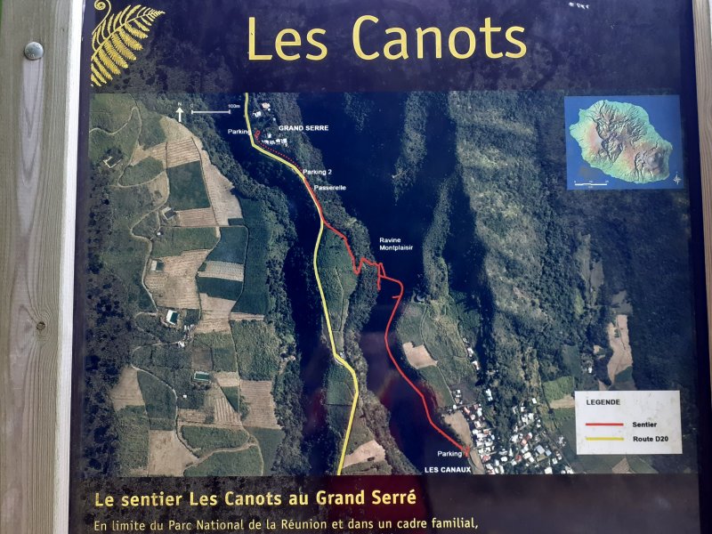 La randonnée débute à la plus belle aire de pique-nique de l'île (Photo 2) traversée par la Route Forestière des Makes en direction de la Fenêtre et emprunte un sentier agréable qui longe les parterres de fleurs pour rejoindre, 500 m plus loin, le début du sentier du Bras Patate. Traverser la ravine en profitant des dernières fleurs et emprunter un agréable chemin qui épouse le relief en longeant des prairies. A la fin d'une route de service qui s'arrête en cul de sac, poursuivre sur un sentier un peu rocheux et en corniche qui rejoint le Bras Patate. Juste avant de traverser la ravine, bifurquer sur la gauche et suivre le Bras Patate en rive droite (Photo 4). Le sentier monte agréablement vers la source du Bras Patate alternant les parties basses habitées par les longoses et les parties hautes dans les bois de couleurs. Il grimpe à peine au départ mais devient plus raide en deuxième partie. La vallée est magnifique sous le soleil. On voit dans le fond une espèce de gorge verdoyante et quelques rochers bordent le sentier (Photo 5). On parvient, après trois quarts d'heure au point de vue sur Cilaos (Photo 6). Le sentier vers la Fenêtre des Makes part sur la gauche et celui du Piton Cabris sur la droite. On pourrait prendre à gauche pour quelques minutes en reliant les cryptomerias et les antennes qu'on aperçoit mais le panorama sur Cilaos n'a rien à envier à celui-ci. Après un petit repos à regarder le Cirque, ses îlets ou la route aux 400 virages, obliquer à droite et attaquer la courte mais sérieuse montée au Piton Cabris. Ne pas se laisser impressionner par la pancarte qui indique que c'est difficile ; elle oublie juste de dire que c'est court. Les marches sont hautes parfois mais c'est surtout les à-pics vertigineux qui peuvent le plus impressionner. Il suffit de faire attention où poser les pieds et surtout de s'arrêter pour admirer le paysage (Photo 8) ou faire une photo. Jamais de nez en l'air en montagne, surtout sur une arête ou près d'un à-pic (Photo 9). Il ne faut pas hésiter à se retourner souvent car les panoramas sur Cilaos sont extraordinaires. Une échelle facilite un passage et on est étonné d'arriver si vite au kiosque édifié au sommet. Le sentier s'élargit puis pénètre sous les tamarins puis sous les cryptomerias (Photo 12). Il propose parfois quelques panoramas sur Saint-Pierre, le Tampon ou le cirque. On poursuit, toujours sous les cryptomerias, tellement serrés les uns aux autres que la lumière a du mal à pénétrer. Par temps sombre, il faudrait presque la lampe frontale. On parvient ainsi à un croisement assez dégagé pour en faire une aire de repos. Laisser à gauche le sentier vers le Tapage et poursuivre vers la droite, toujours sur les racines glissantes des grands conifères qui cessent d'un seul coup à une clairière où l'on récupère le sentier de la Plaine du Bois de Nèfles. Prendre à gauche et traverser une zone habitée et cultivée, principalement de géraniums, sur un sentier large et terreux qui peut être glissant par temps humide (Photo 13). Profiter des magnifiques panoramas vers le Petit Bénare et les Hauts du Tévelave car les points de vue diminueront dans la descente. Plus loin, avant de passer une petite ravine et son mince filet d'eau, tenter de trouver la longue caverne qui sert de passage à cet affluent du Bras Patate (Photo 14). Pour la visiter, il faut avoir prévu sa lampe dans le sac. La partie qui suit est presque plate, bordée de très hautes herbes, de lysandras, de longoses et de beaucoup de vigne maronne (Photo 16) avant d'arriver dans une autre partie cultivée, agréablement fleurie et reposante (Photo 17). Ce repos sera nécessaire avant d'affronter la traversée du Trou sur un sentier boueux et envahi (Photo 18). Avant de retrouver un croisement, il faut affronter une forêt de bois de couleurs sur un sentier étroit, comportant de hautes marches et des racines glissantes. Les 200 mètres qui suivent le croisement sont agréables, presque plats dans les goyaviers et autres pestes. On rencontre de beaux fanjans puis le sentier plonge littéralement sur un sentier sombre et bordé de milliers de bois de perroquets. La descente est raide, glissante, humide le plus souvent et il faut se maintenir au bâton ou aux arbustes. Quelques faux-plats permettent de souffler mais sur de courtes durées (Photo 25) ; la pente n'en finit jamais. On arrive à une piste plus large et couverte d'herbe qui traverse une belle zone de pique-nique abandonnée (Photo 26) et le chant des coqs ou les aboiements sont un soulagement lorsqu'on arrive enfin aux Canaux. Pas de difficulté pour retrouver le sentier qui remonte vers le Trou aperçu il y a plus d'une heure ; il suffit de contourner le village par la route puis de la suivre plus haut dans les cannes à sucre jusqu'à un réservoir qui marque le début du sentier de la Pente Tunnel. Plus haut, un kiosque permet de souffler en profitant de beaux points de vue sur la route des Makes, le Grand Serré et la région environnante (Photo 27). Le sentier se rétrécit mais reste correct jusqu'à une aire de pique-nique abandonnée. Seule une grande case est encore debout et propose table, bancs ou lieu de grillade et semble utilisée à en juger par les ordures laissées sur place malgré une pancarte sculptée demandant le contraire. Après cette aire, le sentier est envahi de jouvences humides, de cailloux et de longoses mais on passe sans encombre (Photo 28). Le sentier monte plus fortement à partir d'un petit bois de cryptomerias. Un dernier raidillon dans les bois de couleurs et les rochers avec de longs lacets permet d'atteindre une zone couverte de pestes de toutes sortes. Seules les fougères arborescentes semblent ne pas avoir été absorbées. On profite malgré tout de quelques panoramas sur le Bois de Bon Accueil et le Haut Tévelave. Une autre longue partie de bois de couleurs envahie de longoses arrive rapidement mais ne présente p