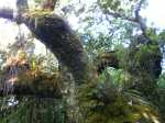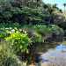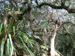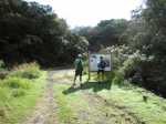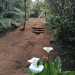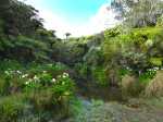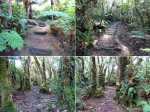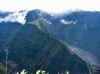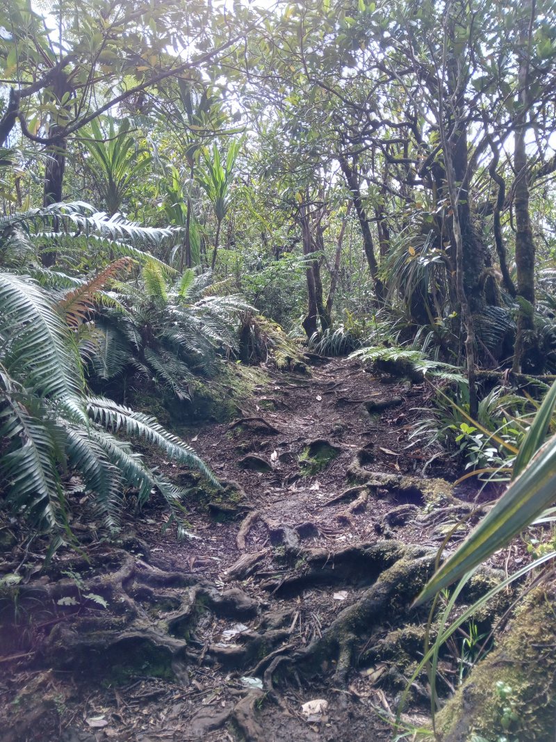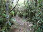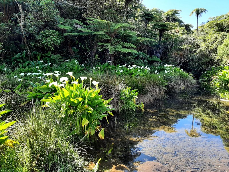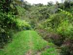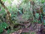 La randonnée débute dans les champs de salades, de choux, de carottes et de courgettes après avoir passé le Piton du Relais, l'aire de pique-nique, la chapelle et le centre équestre du Relais (Photo 1). Pour ne pas manquer le début du trajet, compter 1300 m à partir de la chapelle et garer le véhicule à la piste qui part tout droit dans un virage à droite, près d'une maison en bordure de maraîchage où l'on est accueilli par les aboiements des chiens. Continuer à pied sur la route et obliquer à gauche, 50 mètres plus loin, sur la piste qui démarre dans les champs en direction du nord. Il n'y a pas de balisage et la piste ressemble à toutes les autres pénétrant dans des champs. On suit cette piste le plus naturellement possible entre les maraîchages puis, plus haut, sous les acacias. La piste monte constamment par des lacets pour traverser la forêt communale de Petite Île. Elle alterne des sols herbeux qui se font lentement dévorer par les jouvences (Photo 2). Certaines zones sont entièrement recouvertes de vigne marronne rendant la piste inutilisable par manque d'entretien régulier (Photo 3). Il est d'ailleurs conseillé d'emporter un coupe-coupe dans le sac pour éviter ou atténuer les griffures. La montée régulière comporte quelques parties terreuses glissantes par temps humide. Les portions envahies par les jouvences sont beaucoup plus agréables que celles couvertes de vigne marronne (Photo 4). Les acacias noirs rencontrés depuis les maraîchages laissent petit à petit leur place aux bois de couleurs et fougères arborescentes. La piste se transforme plus loin en un superbe sentier qui pénètre dans la forêt primaire. Le contraste est saisissant au milieu des troncs noueux et des épiphytes (Photo 5). Il comporte quelques pentes faciles à négocier et beaucoup de portions plates qui retiennent la boue après la pluie (Photo 6). On le suit jusqu'aux alentours du Piton La Mare sur de belles portions bordées de magnifiques arbres dont les racines viennent parfois obliger à lever le pied (Photo 7). Cette belle forêt aux arbres moussus recouverts d'épiphytes et d'orchidées est par endroit en meilleur état que celle, plus classique, de Bélouve (Photo 8). A la fin, le sentier est de plus en plus envahi de jouvences, mouillées le matin par la rosée, sans gêner pour autant le cheminement. On arrive par une courte descente à la clairière de la Mare, fin du sentier et début de la piste qui relie la route de Notre Dame de la Paix. La Mare porte bien son nom ; c'est une petite étendue d'eau claire surtout retenue par les travaux qui ont permis le passage de la piste. Elle est entourée de hauts fanjans, de bois de couleurs, de joncs et d'arums du plus bel effet au moment de la floraison (Photo 9). Des troncs posés au sol permettent de passer la zone humide sans se mouiller les pieds car l'eau y coule en permanence. Dès la fin de ce caillebotis, on chemine sur une piste parfois glissante sur ses parties recouvertes de terre lisse. Elle monte fortement au début mais s'assagit par la suite quand elle devient Chemin de la Forêt des Hauts de Mont Vert. On est à 1500 m d'altitude et les points de vue portent jusqu'au Tampon et à Saint-Pierre. Les prairies abandonnées, envahies de fougères arborescentes, de digitales et d'arums sont superbes à la fin de l'hiver (Photo 10). On les devine encore sur les flancs du Piton de la Mare où elles se couvrent petit à petit de plantes envahissantes (Photo 11). Un banc à mi-parcours permet une pause près d'un nouveau point de vue (Photo 12). Le regard porte également sur toute la région de Saint-Pierre, à peine cachée par les arbres (Photo 14). Plus haut, la piste qui oblique à gauche pour longer le rempart est bordée d'un côté par les espèces plantées pour en faire une continuité du Sentier Botanique de Notre Dame et de l'autre par le rempart vertical de la Rivière des Remparts. Quelques trouées ou petits sentiers permettent de s'approcher du bord pour apercevoir le fond ou Grand Coude de l'autre côté. S'il n'y a pas de brouillard, on voit même le Nez de Bœuf à l'horizon ainsi que le Bras de Mahavel (Photo 15). Cette piste en montée faible constante est très agréable lorsqu'elle est bordée de fougères arborescentes ou de fleurs (Photo 17). On y trouve presque tous les bois de couleurs les plus classiques avec beaucoup de mahots et de fleurs jaunes (Photo 18). On arrive à la barrière qui gardait les troupeaux au moment de l'exploitation des prairies ; elle est désormais plus souvent ouverte. La remontée cesse au moment où l'on emprunte une petite route rejoignant sans effort la route de Notre Dame de la Paix (Photo 19). Dans le cadre d'un entraînement de footing, il est possible alors de faire demi-tour pour éviter la route. Commence alors un long périple sur la route qui serpente tout d'abord sous les cryptomerias, passe au plus près du départ du Sentier Botanique et se poursuit jusqu'au village. Même si la fatigue se fait sentir, ne pas hésiter à rejoindre le belvédère pour des vues magnifiques sur Grand Coude, Mahavel et Roche Plate au fond de la Rivière des Remparts à moins de garder cet écart pour le retour, moins fatiguant (Photo 21 et 22). Effectuer une courte incursion sur ce sentier botanique de toute beauté (Photo 23). On n'est pas obligé de faire le tour complet pour rencontrer de belles racines (Photo 25) ou des arbres centenaires couverts de toutes sortes de plantes (Photo 26). Revenir sur la route et rejoindre le Village de Notre Dame de la Paix. Le plus difficile, presque tout en montée, est terminé car la chapelle se situe plus bas à la sortie du village et se rejoint par une petite route facile à trouver dans un virage proche d'une première chapelle également appelée notre Dame de la Paix. La chapelle "officielle" est un petit bâtiment banal au toit de tôle (Photo 27). Comme souvent, l'intérieur tranche vraiment car tout est blanc, propr