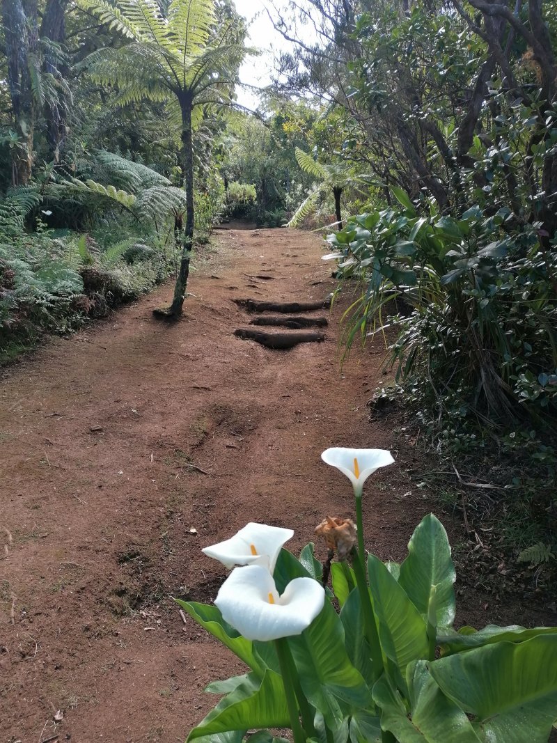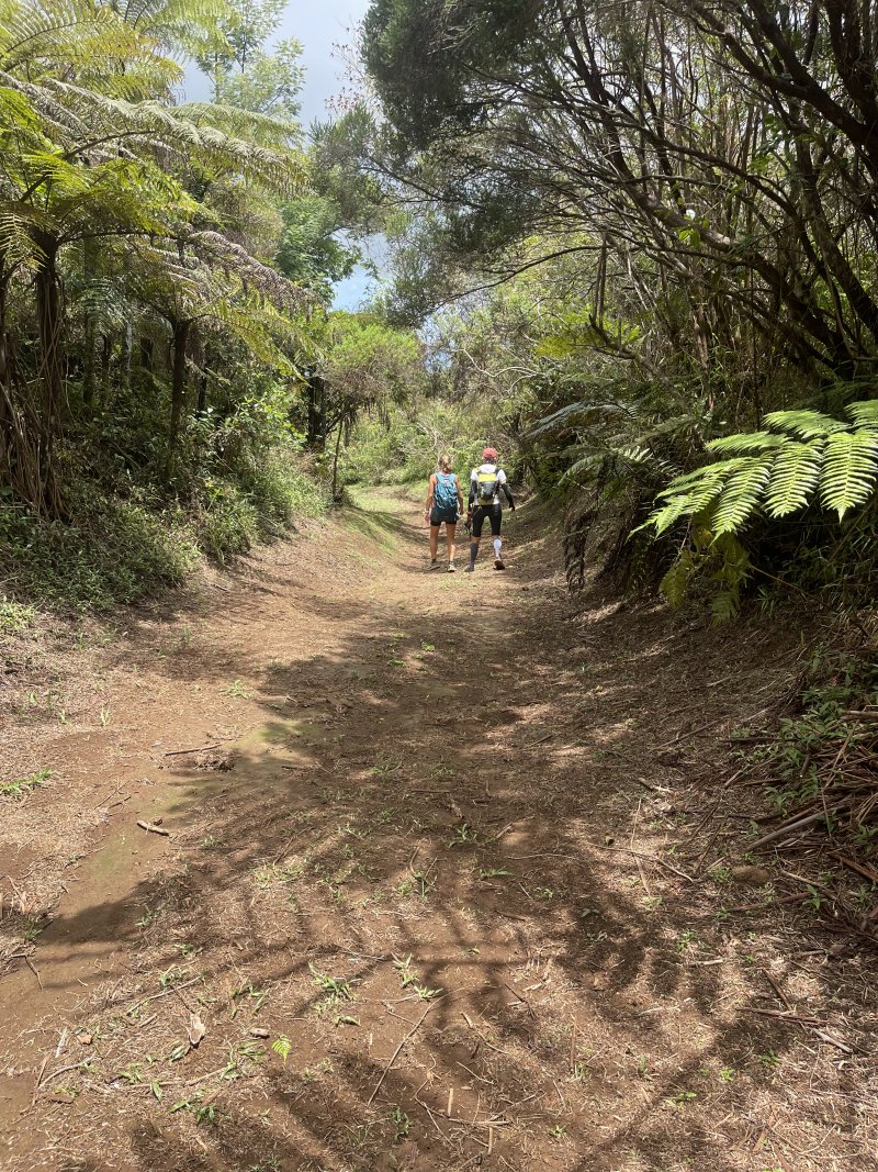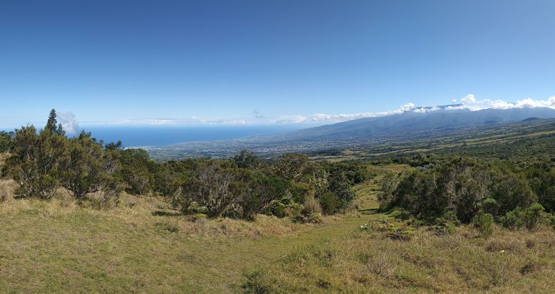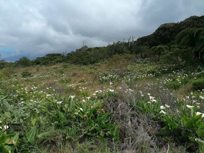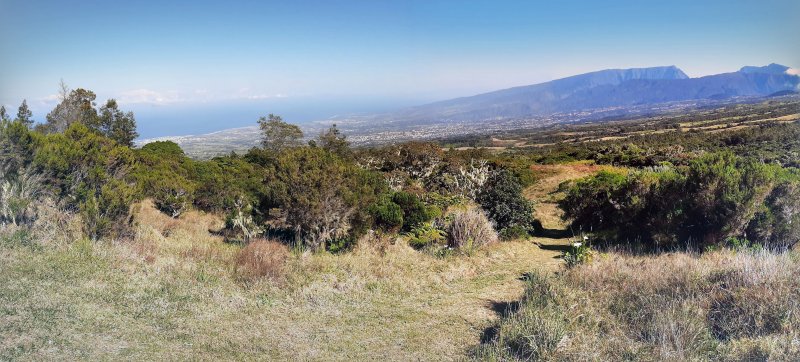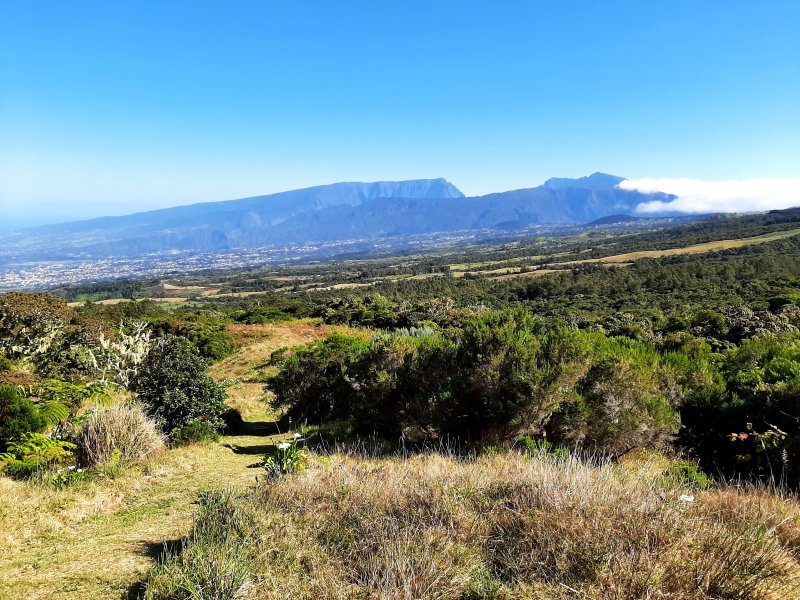 Voici une longue montée partant des hauts de Petite Île pour rejoindre le village de Notre Dame de la Paix. Ce circuit demande deux véhicules si on ne désire pas effectuer l'aller-retour. Il y a moins de 10 ans, un sentier partait du Relais de Petite Île et rejoignait Notre Dame de la Paix en traversant une belle forêt de bois de couleurs. Les pestes végétales, déjà nombreuses à l'époque, ont vite envahi le sous-bois, rendant impossible le circuit. C'est dommage car cette longue sortie permettait de mieux connaître les hauts boisés de Petite Île. Un contournement est utilisé depuis cette fermeture forcée et permet d'effectuer à peu près le même nombre de kilomètres en suivant quelques champs, traversant une belle forêt primaire, des prairies et en contemplant le fond de la Rivière des Remparts ou le Plateau de Grand Coude avant d'arriver au Sentier Botanique de Notre Dame de la paix. La sortie présente aussi l'avantage de rencontrer à peu près toute la végétation présente sur l'île. Quelques portions de route pour rallier Notre Dame de la Paix à partir de la fin la fin de la piste de la Forêt des Hauts de Montvert, viennent tout de même ralentir l'enthousiasme des marcheurs sans pourtant ôter celui des amoureux de la nature.