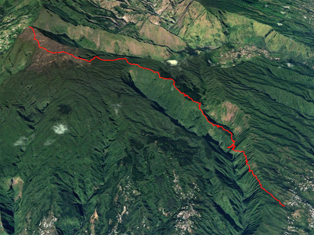 Bombseb : Si vous roulez jusqu'au bout de la RF, vous stationnerez au Kiosque d'Affouches. Marchez sur la route jusqu'à ce que vous rencontriez le sentier venant de l'Îlet à Guillaume. La trace téléchargée ci-dessus vous guidera pour la partie sentier. Vous n'en avez pas besoin pour la piste. Pour diminuer la longueur sur piste, emprunter le sentier rejoignant le Piton Grande Chaloupe puis descendez sur la piste par le premier sentier à gauche (voir carte ci-dessus en mode IGN). C'est d'ailleurs le raccourci pour éviter les chutes de pierres.