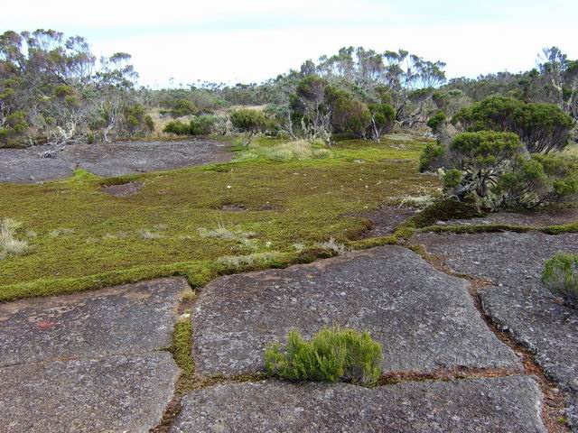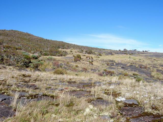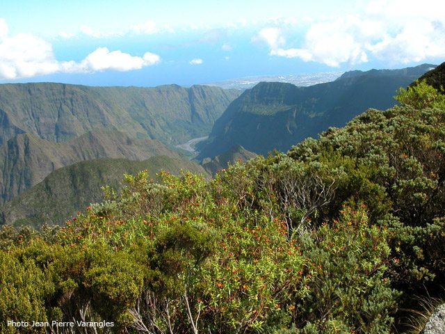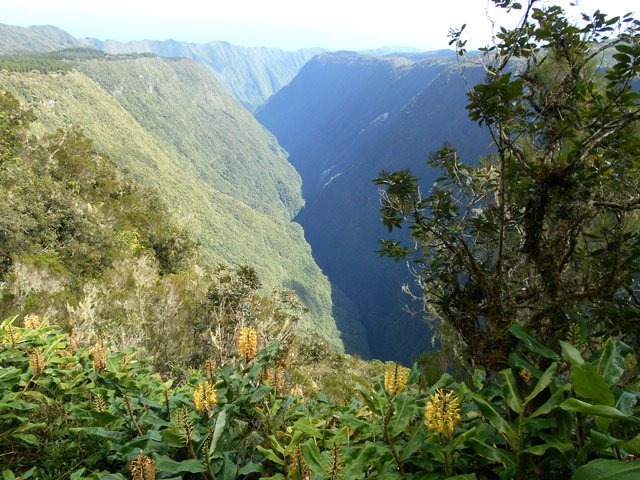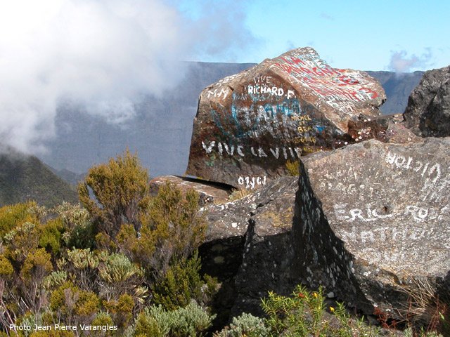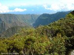 On arrive ainsi à la passerelle après avoir franchi de petits éboulis, des passages techniques ou vertigineux, des corniches plus ou moins abruptes, des lacets en suivant toujours la conduite métallique, aérienne ou enterrée (Photo 4). Un sentier part sur la gauche pour éviter d'emprunter l'édifice devenu fragile. Il descend rapidement à la rivière qu'il faut remonter sur moins de 100 mètres pour poursuivre vers la Roche Ecrite. Plus loin ce sont les bambous puis les eucalyptus qui bordent un sentier caillouteux. Le sentier s'élargit avant d'arriver à la pancarte puis à la ruine du pénitencier pour enfants de l'Îlet à Guillaume, totalement abandonné (Photo 6). Traverser cette clairière chargée d'histoire pour suivre une ancienne allée bordée de cryptomerias (Photo 7) qui mène à l'ancien cimetière, rénové et mis en valeur. Plus loin, on attaque la montée sous une forêt de camphriers pour retrouver une zone moins boisée, plus rocheuse où le cheminement s'effectue tout d'abord par des lacets puis en ligne de crête (Photo 8). Sur la droite, la profonde vallée du Bras Guillaume semble impressionnante (Photo 12). Certaines portions sont facilitées par des échelles et rambardes (Photo 10) et on arrive une première fois sur la Route Forestière de la Plaine d'Affouches (Photo 14). Le sentier, presque rectiligne poursuit sa montée en direction de la Plaine des Chicots traversant une longue forêt de cryptomerias (Photo 18) et en rencontrant par deux nouvelles fois la RF qui elle est très tortueuse. Ne pas manquer les trois tamarins des Hauts à un emplacement éponyme (Photo 19). Le sentier, étroit par moments est longuement envahi de longoses (Photo 22). Sur la gauche on admire la forêt de bois de couleurs qui a colonisé les flancs du cirque formé par la vallée de la Rivière Saint-Denis qui se termine par un cassé de 800 mètres d'où tombent de belles cascades par temps de pluie (Photo 21). La pente est loin d'être terminée et on s'approche doucement du GRR2 en provenance de Dos d'Ane. Les premiers tamarins des hauts indiquent l'arrivée proche au Gîte de la Plaine des Chicots. Le sentier est agréable, parfois un peu boueux et il faut se baisser pour passer sous des troncs de tamarins qui créent des arches naturelles. Si le temps commence à s'ennuager, tenter un petit écart du sentier vers un point de vue sur Mafate (1829 m) pour se régaler des panoramas sur le cirque et les pitons qui l'entourent. S'il fait beau il faut économiser le temps car on aura les mêmes panoramas à la Roche Ecrite. Passer le gîte (Photo 23) puis poursuivre vers la Caverne Dufour, moins connue que celle du gîte du Piton des Neiges. Les tamarins ont disparu sans transition et on marche sur un terrain presque désertique bordé de branles verts mélangés aux carcasses de ceux qui ont brûlé il y a quelques années. Le paysage est parfois bouché ou les panoramas ne donnent que sur la Plaine des Chicots (Photo 25). Rejoindre la Roche Ecrite sur une pente agréable passant le plus souvent sur de grandes plaques de lave, de mousse, de terre et proche d'une végétation de plus en plus rase (Photo 24). Au sol, les traces de peinture blanche sont de plus en plus rapprochées et se multiplient au sommet au point de tout recouvrir. Ces tags sans intérêt ne doivent pas faire oublier que le but de cette ascension est de se gaver de panoramas tous aussi sublimes les uns que les autres sur les deux cirques. Comme le départ a eu lieu depuis plus de 6 heures, les nuages, hélas, ont déjà souvent pris possession des lieux. C'est pourquoi beaucoup de randonneurs effectuent la montée un jour pour redescendre le lendemain. Comme on dort à 3 kilomètres seulement du sommet, on peut y arriver tôt quand aucun nuage n'est venu s'installer sur le Piton des Neiges. Ce n'est pas le cas aujourd'hui où le retour a été prévu dans la même journée et il ne faut pas trop s'éterniser pour rejoindre le véhicule à Saint-Bernard. La descente, beaucoup plus rapide permet de terminer cet aller-retour en une dizaine d'heures à condition de ne jamais flâner. C'est pourquoi cette randonnée s'adresse surtout aux sportifs dans le cadre de leur entraînement aux trails.