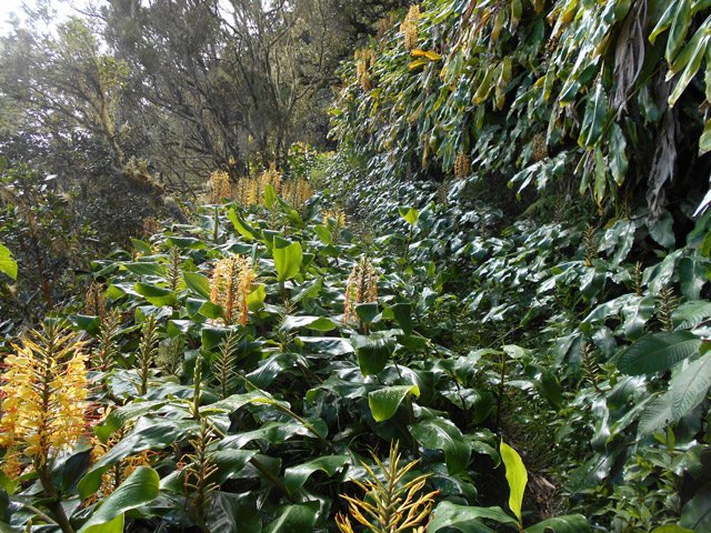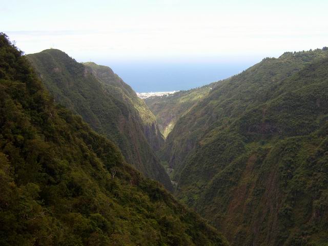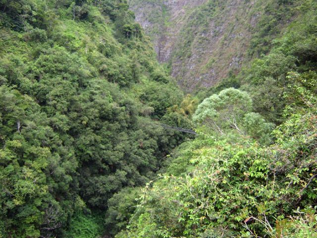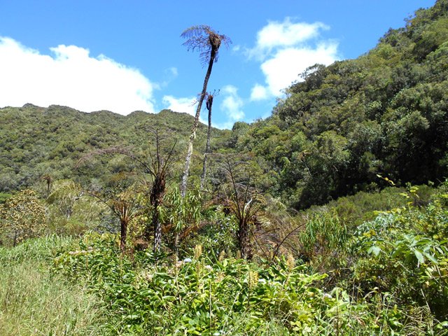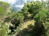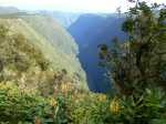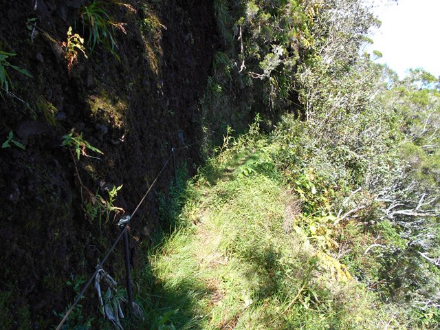 J'ai effectué une partie de cette randonnée en perspective du trail DTour 71 en faisant le tour de la Rivière St-Denis, de la Redoute jusqu'au boulevard de la Providence. Je ne connaissais pas encore la partie haute de la RF, du Kiosque Plaine d'Affouches jusqu'au GR2, j'ai été servi ! La route forestière est praticable jusqu'au moment où on la quitte pour prendre le sentier vers la gauche. La première partie se fait dans la forêt de Cryptomerias où il est très difficile de retrouver la trace et comme souvent il faut faire appel à son instinct, les longoses qui font 1,50 m ont envahi le sous-bois ! On est rassuré quand on longe ensuite le rempart de la rivière st-Denis jusqu'au cassé et la fin de la vallée. Le sentier est toutefois encombré de longoses et dangereux car il y a parfois des branches qui sont cachées dans la végétation et qui barrent le sentier, attention aux tibias ! La remontée est usante et difficile, on est content quand on arrive au GR2. C'est à ce croisement qu'un panneau indique finalement que le sentier est actuellement fermé... Cette information ne figurait pas au début du sentier du côté de la RF. Par contre un panneau indiquait la fermeture du sentier à partir du kiosque Plaine d'Affouches qui mène vers piton Batard pour rejoindre Roche Vert Bouteille. L'organisation du DTour a donc été obligée de proposer un nouveau tracé pour relier le gîte des Chicots.