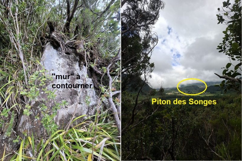 La 1ère part à gauche et mène au sommet mais il faut, entre autres, contourner un "mur" avant d'y parvenir (photo 1A) ; elle offre une vue sur le Piton des Songes (photo 1B).