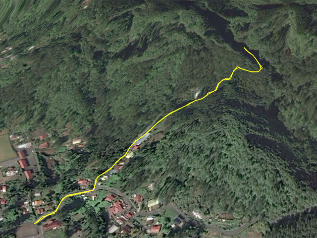 La randonnée débute dans le village de Hell Bourg pour plus de facilités de stationnement. Un long emplacement se trouve un peu après le Relais des Gouverneurs sur la route en direction de Salazie. Marcher en direction de l'Îlet à Vidot, passer la ravine du Bras Sec entourée de chouchous (Photo 1) et rejoindre la route des Trois Cascades. C'est une rue bétonnée assez abrupte où les habitants doivent souvent vérifier l'état de leur frein à main ! (Photo 2) L'échauffement est immédiat. Le béton est remplacé par la terre dans une partie sous les filaos (Photo 3). Le sentier commence à droite à la fin de cette route fermée un peu plus loin d'une clôture. Il est très facile à repérer et chemine en montée entre une ravine et une canalisation de transport d'eau. Certains passages sont assez sportifs mais cette randonnée s'adresse pourtant à tous en raison de la très faible longueur de l'itinéraire. On commence par des cailloux avant de poursuivre sur de grandes surfaces de racines, glissantes par temps humide (Photo 8). On rencontre plus haut deux tuyaux et une première grosse touffe de hauts bambous. La pente diminue ou disparaît totalement pour un cheminement très agréable sous les grands filaos (Photo 13). En arrivant sous quelques goyaviers, on entend le bruit des petites chutes d'eau et on atteint enfin la rive de la Ravine des Trois Cascades où l'on effectue une brève visite à la Vierge-les-pieds-dans-l'eau (Photo 17)qu'on pourrait également baptiser la Vierge des Longoses, proche d'un gouffre ou se précipite la petite rivière (Photo 18). Attention à la glissade fatale pour en voir le fond. Les berges sont tellement envahies de longoses qu'il est désormais impossible de suivre la berge vers la plus belle cascade qui tombe de la falaise. Pour s'en approcher, reprendre le chemin inverse et rejoindre, la touffe de bambous à moins de 10 mètres et repérer le passage entre les énormes tiges de cette plante qui peut dépasser les 20 mètres à cet endroit (Photo 15). Une barrière, sensée interdire la passage, est contournée par un sentier créé par les centaines de passages. Cet étroit sentier rejoint en quelques mètres le bord de la ravine et une passerelle au-dessus d'un barrage de recueil des eaux (Photo 23). De cette passerelle, on voit mieux la cascade en amont (Photo 24). S'en approcher est devenu une aventure que seuls les randonneurs motivés pourront rejoindre en utilisant le fond de la ravine. Un bassin assez profond au barrage en découragera la majorité surtout que le spectacle de la petite chute est très agréable depuis la barrage. Le retour s'effectue par le même itinéraire qui peut s'avérer technique s'il a plu et que les pierres ou racines ont été rendues glissantes.