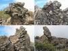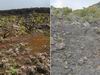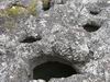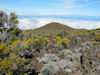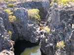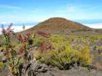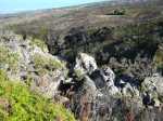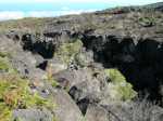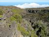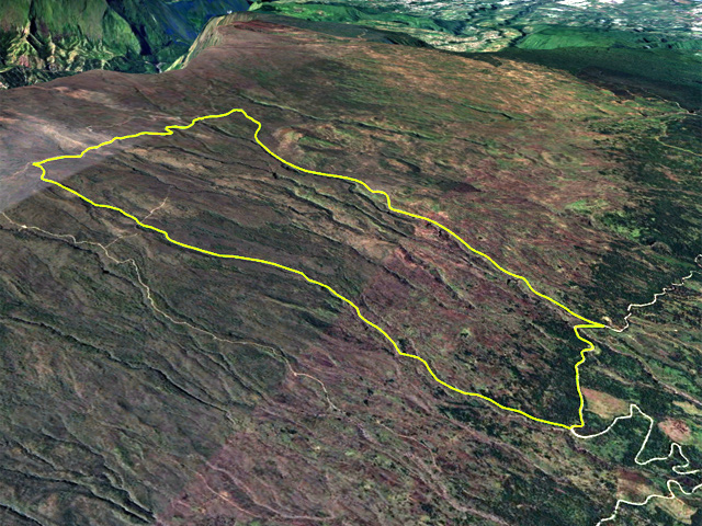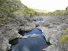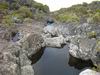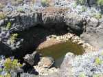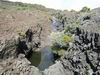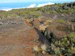 La randonnée peut débuter n'importe où sur la Route Forestière des Tamarins entre les deux ravines. Un emplacement très proche de la pancarte indiquant le sentier des Colimaçons fera très bien l'affaire. Le sentier commence par la seule difficulté de la boucle car il traverse après moins de 100 mètres une zone herbeuse où le sentier n'est pas marqué ou se confond avec les traces laissées partout par les bovins. Ne jamais perdre de vue qu'on suivra tout le temps la Ravine des Colimaçons et il faut donc marcher vers la gauche après cette zone de pâturage entourée de fougères (Photo 1). On domine toute la planèze et le regard porte jusqu'au lagon de l'Ermitage et Saint-Paul (Photo 2). Très vite on rencontre le premier cairn qui sert de balise et c'est en suivant ces petits tas de cailloux qu'on trouve les meilleurs passages (Photo 3). On marche toujours avec la ravine à vue sur la gauche (Photo 4). Que ce soit la rive droite ou la rive gauche, on est assuré de ne voir que de la roche qui borde la ravine (Photo 6). Un tuyau, désormais perdu dans la végétation qui a repoussé longe le sentier (Photo 7). Après une pluie, certains bassins et cassés doivent être magnifiques (Photo 9). La Ravine des Colimaçons alterne les partie très larges (Photo 10) et celle beaucoup plus étroites qui sont de véritables cassures dans le basalte (Photo 11). Le sentier passe également en bordure de véritables ravins profonds et dangereux où il est même impossible de descendre sans corde (Photo 13). Certaines portions comportent de profonds bassins sans possibilité de sortir si on venait à tomber dedans (Photo 15). La ravine devient de plus en plus petite, les canyons diminuent en nombre et en taille et on devine, devant soi, le Piton Rouge qui dépasse à l'horizon (Photo 16). Cette fiche ne prévoit pas d'y monter pour profiter des panoramas à 360° ou des sculptures de Gilbert Clain mais le détour prendra 30 minutes pour les curieux (Photo 17). Le sentier très connu qui sépare le Piton Rouge de la Glacière est une promenade bordée de points de peinture blanche qui manquent tant le long des deux ravines. Une piste a été créée mais il est plus agréable de suivre le sentier surtout qu'il est plus court. On arrive à la ravine du Fond de Simambry bien marquée par une cascade (à sec, bien sûr) et un bassin sur la gauche du sentier (Photo 18). Débuter la descente par la rive droite plus facile à cet endroit. Plus loin, on fait exactement ce qu'on veut ; soit par la rive droite, soit par la rive gauche mais surtout par le fond de la ravine qui permet de longer des dizaines de petites retenues d'eau donnant de belles occasions de photographies originales. On y rencontre plus de bassins que la Ravine précédente (Photo 19). Certains sont très difficiles d'accès et certainement dangereux (Photo 20). Des marmites par dizaines ont transformé le sol en gruyère. Avec de l'imagination, un clair de lune et un peu d'inquiétude, on pourrait être amené à trembler en découvrant certains formes (Photo 22). Il n'y a aucun danger de longer ces petits bassins car le sol est assez plat et les bassins peu profonds (Photo 23) et (Photo 24). C'est également un festival de sculptures de basalte érodées par le vent et la pluie (Photo 25). Arrivé à l'altitude de 2000 m (voir carte), prendre absolument la rive gauche afin de ne pas se retrouver coincé de l'autre côté de la ravine qui fait ici plus de 20 m de profondeur avec des parois abruptes. Le sol est plat, rarement recouvert de végétation gênante et la marche est rapide (Photo 26). On entend les véhicules passer sur la Route Forestière des Tamarins. La ravine est large, déchiquetée et on comprend pourquoi il fallait vite passer en rive gauche un peu plus haut (Photo 28). On rencontre la route dans un grand virage et le dernier kilomètre pour rejoindre le véhicule n'est qu'une formalité.