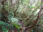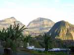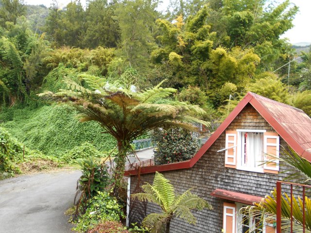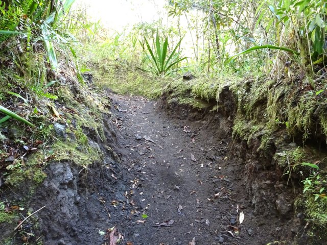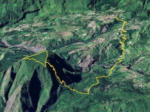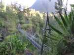 La randonnée débute ici à Hell Bourg afin de visiter la région et de rallonger un peu la distance. Elle peut très bien commencer au dernier parking, quelques dizaines de mètres avant la passerelle comme le font beaucoup de randonneurs. Le GRR1 emprunte la route depuis la Rue du Général de Gaulle jusqu'à la Rivière du Mât. Quitter la rue et partir en face vers la gendarmerie en suivant une petite route traversant le Bras d'Amales bordé de chouchous (Photo 1). La descente est rapide en suivant les panneaux installés tous les 100 m le long des escaliers en pierre (Photo 2). La visite des thermes peut se garder pour la fin même s'il y a assez peu à visiter et que les bâtiments sont en ruine (Photo 3). Poursuivre vers le Bras Sec, le traverser à gué et poursuivre par quelques lacets pour rejoindre la route de l'Îlet à Vidot (Photo 4). De la route, on bénéficie déjà de superbes panoramas sur le Cimendef, la Roche Ecrite et le Piton d'Anchain (Photos 5 et 6). Ce cheminement en descente douce permet de chauffer un peu les muscles pour les préparer à la montée raide qui se présentera un peu plus tard. L'habitat est isolé et on ne souffre nullement de cette marche sur route en descente. La circulation est faible, les jardins sont fleuris et quelques chiens aboient de temps en temps. Après avoir descendu la route départementale on se retrouve à la piste bétonnée du Chemin de Bras Marron qui descend tout d'abord entre de grosses touffes de bambous (Photo 7). Ces bambous se retrouvent d'ailleurs assez nombreux autour des cases qu'on aperçoit ça et là. La route est pentue, comporte plusieurs lacets serrés d'où l'on aperçoit encore les pitons du côté de Grand Îlet (Photo 8). Après avoir franchi le petit pont du Bras Marron, on longe des filaos puis on parvient à une bifurcation avec la route venant de Trou Blanc. Laisser le parking et marcher en direction de la passerelle sur un sentier assez rocheux et parfois en pente forte. Traverser sur la passerelle métallique grillagée qui laisse voir la rivière coulant en-dessous sans pour cela donner le vertige (Photo10). Poursuivre par les escaliers, laisser à gauche des cultures plus ou moins en friche et grimper par la piste au début du sentier du Piton d'Anchain reconnaissable à la culture de chouchou située au croisement. Du croisement, on a de belles vues sur le piton qu'on va pouvoir atteindre rapidement (Photo 11). Bifurquer alors sur la droite pour traverser quelques cultures et vergers d'agrumes avant de cheminer sous les filaos envahis de chouchous sur un sentier sans difficulté (Photo 12). Il est bordé le plus souvent de pestes et de goyaviers et propose déjà quelques grimpettes pour mettre dans l'ambiance (Photo 13). Les points de vue diminuent avec la végétation mais on peut tout de même profiter de vues sur le Gros Morne. Il faut traverser la Ravine Olivette avant de la longer en rive gauche. Le sentier, parfois creusé dans la terre, monte faiblement entre chocas, troènes et fougères (Photo 14). Plus haut, quelques bois de couleurs ont résisté à l'invasion des chocas et autres pestes (Photo 15). On rencontre quelques cultures sur la droite près d'une petite case. Le calvaire a beaucoup souffert des intempéries à la bifurcation vers Grand Îlet. Cet oratoire marque le début de l'ascension du Piton. Elle débute par de larges marches faciles dans les jouvences et longoses (Photo 16). La pente est forte et ne faiblit jamais. Certains tronçons sont étroits et glissants sur de la terre humide ou des roches moussues qui dépassent (Photo 17). De nombreux lacets courts, aux marches hautes encombrées de racines de bois de couleurs imposent parfois d'utiliser les mains (Photo 18). Il faut compter environ 45 minutes pour atteindre le bord du plateau qui occupe le sommet du piton. La végétation est dense mais quelques trouées permettent d'admirer de nouveaux panoramas sur le Gros Morne (Photo 19). Le haut de cette pyramide est plat, dénudé par endroits et un sentier en fait le tour permettant plusieurs points de vue. Certains sont en partie cachés par les branches, d'autres, aménagés avec barrière en bois près d'une grande clairière (Photo 21). On peut, tout à loisir, profiter de ces magnifiques panoramas, différents en fonction des points d'observation. C'est bien évidemment le Gros Morne qui dépasse le plus et se remarque le mieux côté sud (Photo 22). De la clairière, ce sont tous les villages du cirque ou presque qu'on essaye de situer car il n'y a pas de table d'orientation (Photos 23 et 24). Plus loin, au nord, en montant sur un promontoire rocheux, on profite des villages de Mare à Martin ou de Grand Îlet au pied du Cimendef (Photos 25 et 26). Tous ces lieux d'observation se rejoignent par un sentier de bord traversant une belle forêt de bois de couleurs (Photo 27). Il faut descendre dans cette magnifique forêt puis remonter un peu pour terminer la boucle et retrouver le sentier emprunté pour l'ascension (Photo 2). Entamer la descente en gardant en mémoire les passages délicats rencontrés en montant. Il peut être prudent de s'appuyer au bâton pour ralentir les glissades fréquentes. La descente est rapide et l'on parvient à l'oratoire puis à la passerelle en moins de temps que lors de la montée. En fonction de l'heure, une balade sur les berges de la Rivière du Mât peut représenter un moment agréable. Les bus sont rares pour ceux qui ne voudraient plus affronter les kilomètres de goudron et de piste bétonnée ; voilà pourquoi le départ est les plus souvent donné au parking.