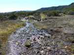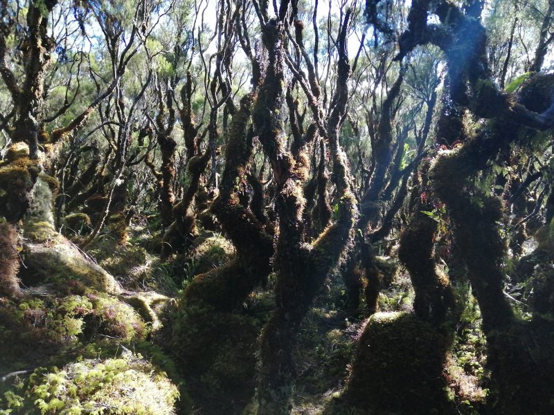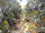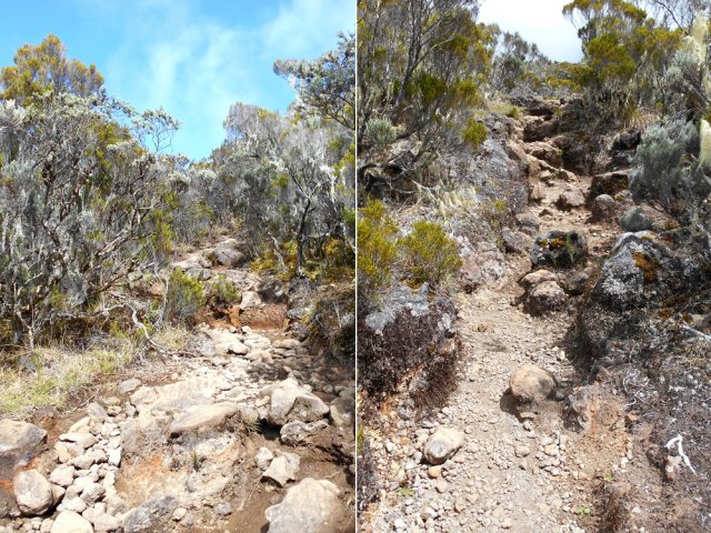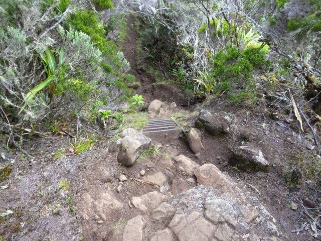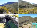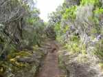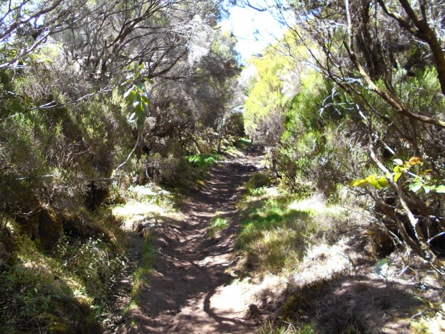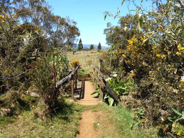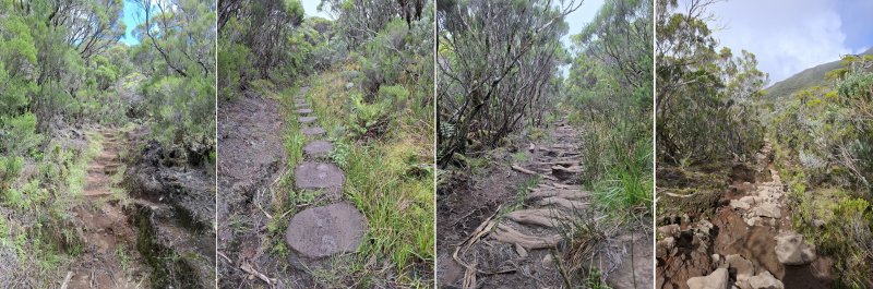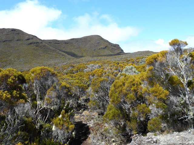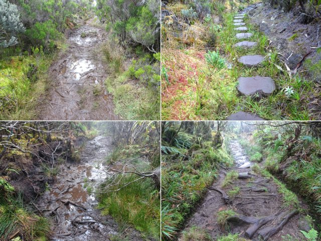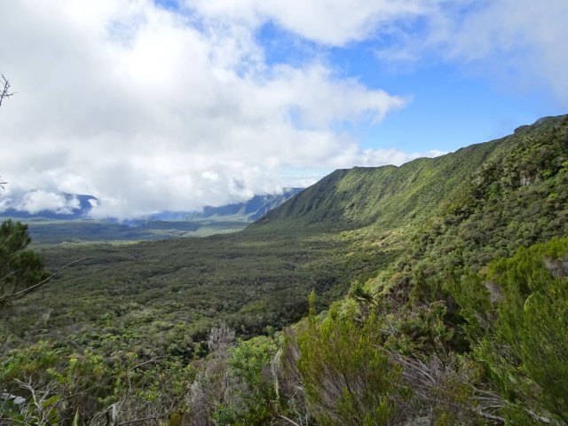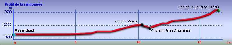 La randonnée débute à Bourg Murat et longe la RN3 jusqu'à la route de Mare à Boue. Effectuée dans le cadre d'un parcours isolé, les randonneurs se rendent directement à la Savane Mare à Boue. Ces trois kilomètres le long du goudron permettent déjà de se familiariser avec les vues sur le Piton des Neiges et la végétation de la Plaine. Les troupeaux vivent tranquillement dans ces vastes prairies qui peuvent être blanches de givre aux mois de juin ou juillet. La randonnée commence réellement au croisement du GR et de la Route de la Plaine des Palmistes. La petite route traverse les prairies avec, toujours en toile de fond le Piton des Neiges. Elle est étroite et presque plate mais peut paraître longue. Prendre à droite au premier croisement. Depuis la mare, on voit très bien le chemin à parcourir jusqu'au Piton des Neiges dépassant à l'horizon (Photo 1). On distingue également très bien le Piton Bleu et le Piton Lepervenche qu'on frôlera dans moins d'une heure (Photo 2). La route se transforme en piste de scories rouges puis, très vite, un premier embranchement se présente. On peut poursuivre tout droit sur une piste bétonnée vers le Col de Bébour et la Forêt de Bélouve. Prendre pourtant à gauche et poursuivre dans les prairies en longeant les barbelés (Photo 3). Le Piton des Neiges domine le demi-cratère du Piton Tortue bordé de hauts cryptomerias et de platanes qu'on ne voit pas encore (Photo 4Photo 5). Plus loin, après une échelle de franchissement de clôture, laisser à gauche le sentier Mollaret qui descend vers le Bras de Sainte Suzanne et Grand Bassin. La marche est très agréable entre les deux rangées de clôtures envahies de grands ajoncs d'Europe impossibles à éradiquer (Photo 6). Certains dépassent la taille humaine et peuvent même griffer quand le sentier est plus étroit (Photo 7). L'itinéraire effectue une grande boucle vers la gauche et passe entre le Piton Tortue et Lepervenche qu'on devine au-dessus des derniers pâturages (Photo 8). Il pénètre petit à petit dans de vastes étendues de branles verts qui longent le sentier large et encore assez propre (Photo 10). Mais il devient rapidement très boueux et il est de plus en plus difficile de marcher sereinement sans se remplir les chaussures de cette gadoue nauséabonde (Photo 11). Le vert et le rouge des sphaignes bordant le sentier font un peu oublier la boue (Photo 12). Comme on s'élève lentement, le sentier s'assèche et la marche peut reprendre un rythme plus régulier (Photo 13). On arrive sur la crête séparant la vallée du Bras de Ste-Suzanne et Duvernay. Une échelle facile à franchir marque le début de la descente du Coteau Maigre (Photo 14). Les points de vue sur le Sommet de l'Entre Deux et le Piton des Neiges apparaissent et font oublier la boue. Sur la droite, on embrasse du regard la Plaine des Marsouins vers Bélouve dominée par le Mazerin (Photo 15). A gauche, le panorama est impressionnant sur la profonde vallée du Bras de Ste-Suzanne, le village de Grand Bassin ou la Plaine des Cafres (Photo 16). La descente est courte et s'effectue facilement malgré quelques roches. Au bas de la pente, laisser à droite le sentier revenant vers Bébour (Photo 17 ). La végétation de cette portion de forêt primaire est magnifique avec les épiphytes partout jusqu'au sommet des arbres (Photo 18). Un poteau de l'ONF indique le Gîte de la Caverne Dufour à 3h30 de marche. Heureusement on peut y arriver en moins de temps. Les racines et les cailloux s'entremêlent. La pente est assez faible et l'on s'approche assez vite des cavernes du Bras Chansons. Prendre son temps pour visiter l'arche, les grottes et cavités (Photo 19). Il faut encore affronter les cailloux et des marches bordées de grands branles verts avant de parvenir au plateau (Photo 20). Puis le terrain devient plus plat. On se retrouve sur le Plateau Kerveguen dominé sur la gauche par le Sommet de l'Entre Deux (Photo 21). Il faut traverser de grandes étendues d'herbes humides entourées de touffes plus ou moins importantes de branles verts. La partie de faux plats est de courte durée au croisement caillouteux et herbeux du Sentier Jacky Inard qui vient du Sommet de l'Entre Deux. Les branles ne peuvent plus pousser en raison de l'humidité constante du sol (Photo 22). Certaines mares peu profondes demeurent même une grande partie de l'année (Photo 23). La pente reprend doucement jusqu'au sentier de la Mare à Joseph en traversant de nombreuses petites ravines parfois en eau après les pluies (Photo 24). On s'éloigne doucement du Sommet de l'Entre Deux. La pente s'accentue et les branles verts reprennent possession du terrain (Photo 25). Après le sentier repartant vers Bras Sec, le sentier se rapproche du rempart de Cilaos et devient de plus en plus caillouteux (Photo 26). Quelques petites sentes courtes permettant d'atteindre le bord du rempart pour de sublimes panoramas sur le Cirque de Cilaos (Photo 27). Les cailloux sont omniprésents et c'est en véritable cabri qu'on poursuit la montée. Plus haut, le sentier chemine au plus près du bord du rempart de Cilaos mais la végétation ne permet pas toujours de profiter du spectacle. La courte descente, toujours aussi caillouteuse, qui rejoint le sentier venant du Bloc sonne la fin très proche de cette longue traversée (Photo 28). Il suffit de rejoindre la petite ravine puis de remonter légèrement vers la Caverne Dufour pour trouver le gîte à une dizaine de mètres et sa terrasse de bois qui a déjà vu se poser des milliers de sacs à dos.
