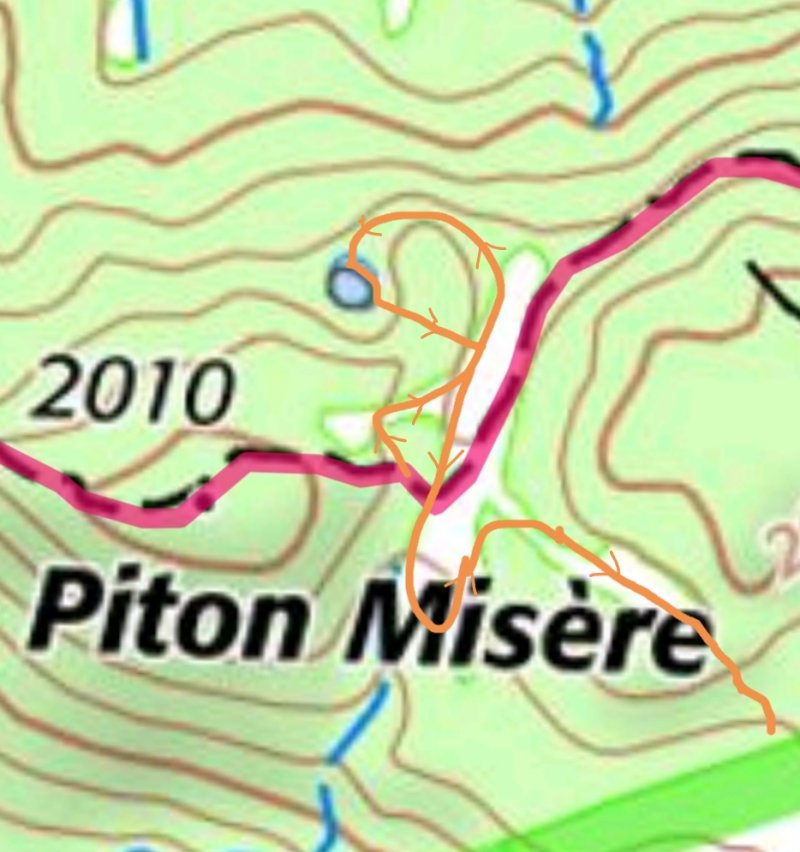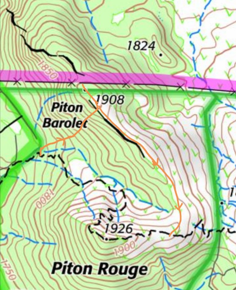 Cette boucle a accueilli durant quelques années le trajet emprunté par le GRR2. Les énormes quantités de boue piétinées par les randonneurs ne lui ont sans doute pas servi à pérenniser ce trajet. Le GRR2 est reparti dans les prairies de l'autre côté du Piton Rouge. Les branles verts l'emportent largement sur les autres plantes même si on aperçoit ça et là des bois de couleurs, surtout vers le Piton Rouge. Faire très attention aux chaussures à mettre ce jour là en raison d'une portion de 2 kilomètres très boueuse.