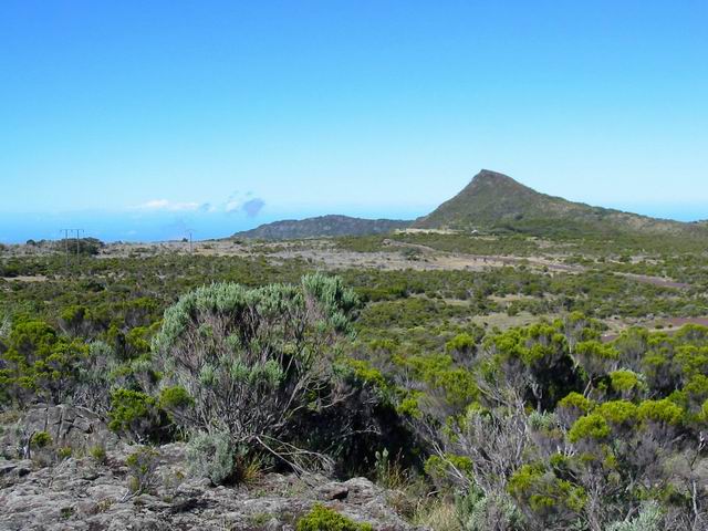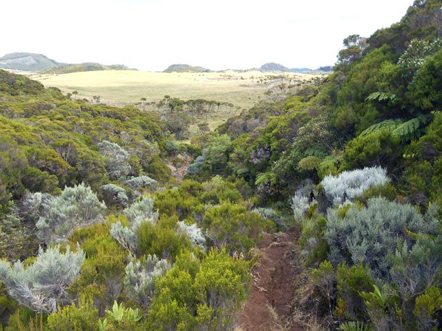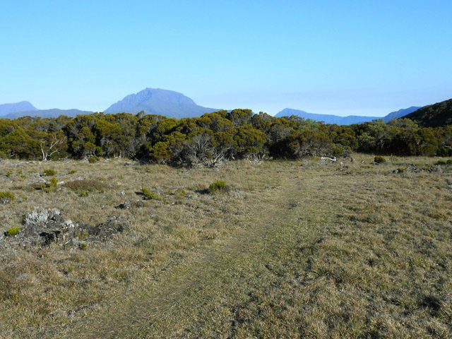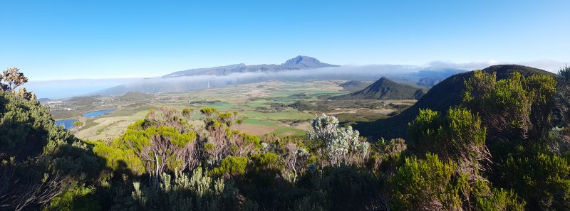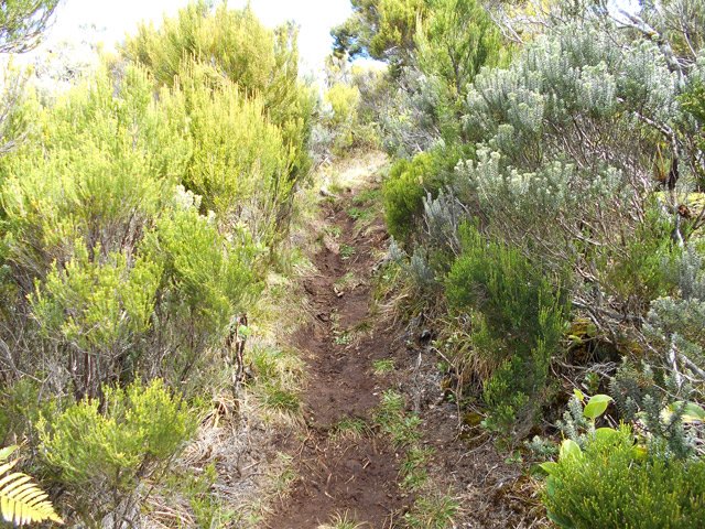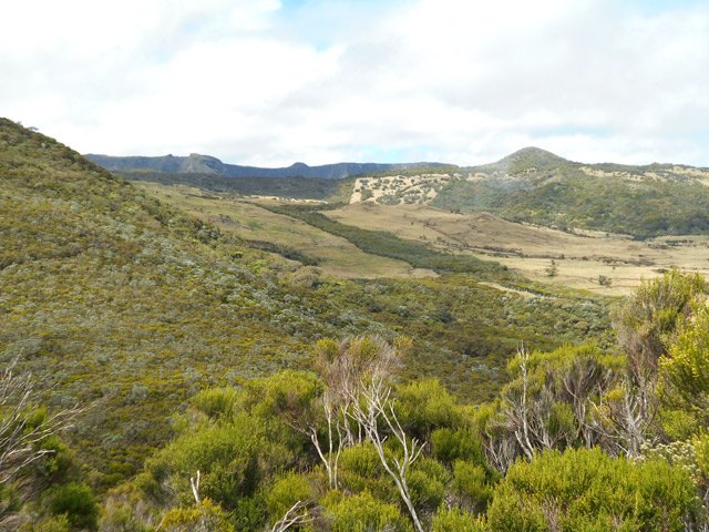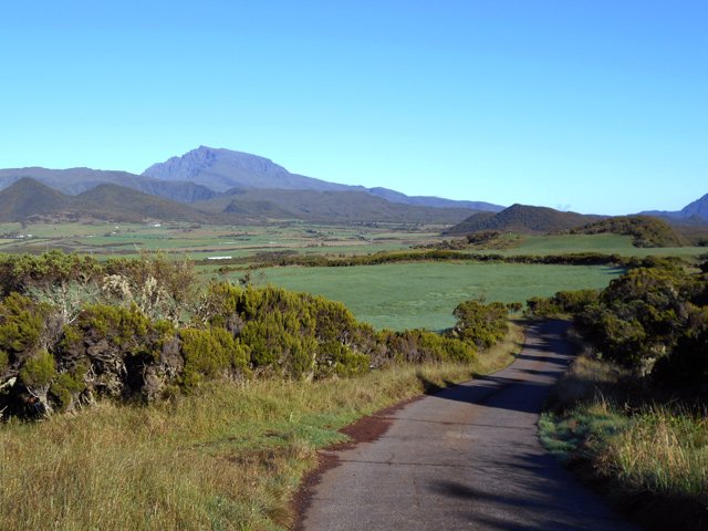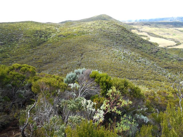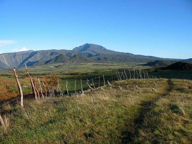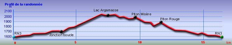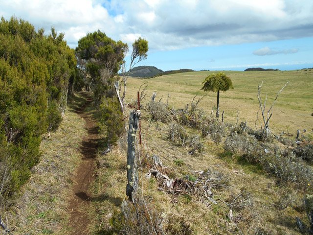 La randonnée débute à la route nationale de la Plaine des Palmistes où la très agréable aire de pique-nique du Pont de Trente permet de se garer avant de partir et de se reposer au retour. Après avoir longé la piste, traversé la route de Bourg Murat et rejoint le départ du GRR2, on longe la route du Chalet des Pâtres offrant de splendides panoramas de soleil levant sur le Piton des Neiges (Photo 1). La pente est tout d'abord faible dans les pâturages puis monte un peu plus. La végétation est rare, faite de brandes ou d'ajoncs d'Europe avant de rencontrer quelques bois de couleurs moussus. Dans les prés, des tas de pierres amassées années après années entourent quelques arbres. Avant d'arriver au chalet, on laisse sur la gauche le terrain militaire de la Grande Montée, déjà effleuré lors de la montée au Piton Textor depuis le Piton Doré. Aux habitations du Chalet des Pâtres, prendre à gauche le sentier du GRR2 puis poursuivre par une montée assez raide sur des marches soutenues par des planches et entourées de hauts fanjans et des branles verts (Photo 2). Certaines zones sont déjà couvertes de branles verts qu'on quittera très peu durant la boucle (Photo 3). Plus haut, les clôtures qui entourent les prairies forment une protection barbelée autour d'un magnifique sentier rectiligne (Photo 5). Le sentier est agréable et facile, même s'il faut se méfier un peu des ajoncs qui le bordent parfois. On arrive ainsi au pied du Piton Rouge qu'on aperçoit depuis le départ sur la gauche et qu'on retrouvera en fin de parcours. Les chaussures sont mouillées par la rosée des herbes mais au retour, elles seront crottées et la rosée aura disparu pour les nettoyer un peu ! On domine quelques prairies pour des photos pastorales agréables avec le soleil levant puis on redescend pour longer ensuite toute une région d'élevage (Photo 6). Il faut franchir le Petit et le Grand Bras de Pontho ainsi que quelques affluents en incurvant la randonnée vers le Piton Rouge dont on contourne le pied par le Sud (Photo 1). Heureusement il n'y a jamais d'eau mais on peut remarquer ça et là des petites retenues indiquées sur la carte par des points bleus. On poursuit ces dents de scie avec parfois de petites pentes plus fortes que la moyenne mais de courte durée. Le sentier terreux est également herbeux puisqu'il a été tracé en pleines prairies. Le Piton Rouge s'éloigne et on monte pour mieux dominer toute la région (Photo 8). Les clôtures encadrent le parcours et il faudrait mettre beaucoup de bonne volonté pour s'égarer. Derrière les clôtures, des troupeaux paissent ou se reposent. Il n'est pas rare de voir une vache seule perchée sur un rocher qui dépasse de la prairie et qui semble guetter le reste du troupeau comme le ferait une sentinelle. Le sentier s'élargit, devient piste couverte de basalte et il faut passer quelques échelles. On arrive enfin au plus haut de la boucle où plusieurs sentiers partent dans tous les sens, en direction du Textor ou du Nez de Bœuf qu'on devine à travers les pâturages (Photo 9). La pente a disparu, pas les branles mais des clairières agréables permettent de se reposer de la montée (Photo 10). Pour ne pas manquer la direction du Piton et du Lac Argamasse, marcher sur le sentier jusqu'à une pancarte constituée de 3 planches dont l'une précise "Déviation GR R2" (Photo 11). Le sentier de l'Argamasse commence une quinzaine de mètres avant la pancarte. Il devient alors moins pastoral et traverse les branles verts et les herbes jusqu'au lac. Cette retenue d'eau, très peu profonde, fait penser à une tourbière mais peut être très belle par beau temps surtout si le Piton Argamasse s'y reflète. (Photo 12). La boucle se poursuit en effectuant le tour du lac et en remontant vers le Piton Misère et le Piton Rouge. La montée est tout d'abord très douce et agréable dans les branles verts, gris et velours blancs sur un sentier herbeux. Les panoramas changent un peu avec la forêt de Bélouve et le Mazerin à l'horizon (Photo 13) ou la Plaine des Palmistes qui apparaît du côté de la Petite Plaine (Photo 14). On laisse sur la droite le Piton des Herbes Blanches puis on se rapproche du Piton Misère. L'humidité, constante dans ces régions, favorise la pousse des mousses sur les troncs (Photo 15). Après avoir passé le Piton Misère, il devient une horreur boueuse extrêmement glissante (Photo 16). Il faut constamment chercher les rares cailloux, les racines ou les joncs pour tenter de passer sans trop remplir les chaussures. Heureusement, certaines parties sont plus propres et l'herbe peut même servir à nettoyer les semelles (Photo 17). Après 2 kilomètres d'équilibre instable et de risques de chutes, on attaque la montée du Piton Rouge. On retrouve un peu de gadoue mais rien de comparable. Le sentier est en règle générale facile et propre entre les branles verts (Photo 19). On atteint le sommet du Piton Rouge après une dernière montée assez forte. En se retournant, on distingue bien le sentier qu'on vient d'utiliser (Photo 20). La descente par de nombreux lacets est aussi rapide mais la boue a presque totalement disparu, rendant le cheminement agréable (Photo 22). A l'horizon, la retenue des Herbes Blanches annonce la fin proche de la boucle (Photo 23). On passe une grande clairière (Photo 25) qu'on rejoint par un sentier qui est resté sec et agréable (Photo 26). La dernière descente, un peu forte également, ramène aux prairies qu'on devine depuis le haut (Photo 27). Le sentier oblique à gauche et repart plein sud pour contourner le piton et se termine près de platanes qu'on a du mal à reconnaître s'ils n'ont pas leurs feuilles tant il y a de mousses et de fougères sur leurs ramures (Photo 28). On retrouve avec plaisir le sentier du départ pour rejoindre assez vite le Chalet des Pâtres, protégé par les clôtures latérales. On ne voit pas les chiens mais ils nous font savoir bruyamment qu'i