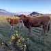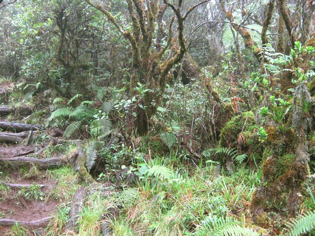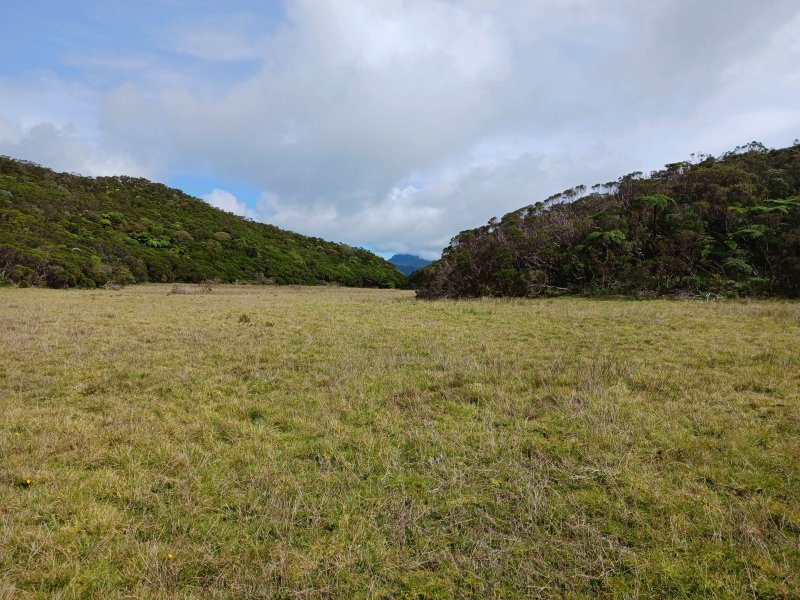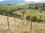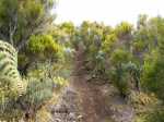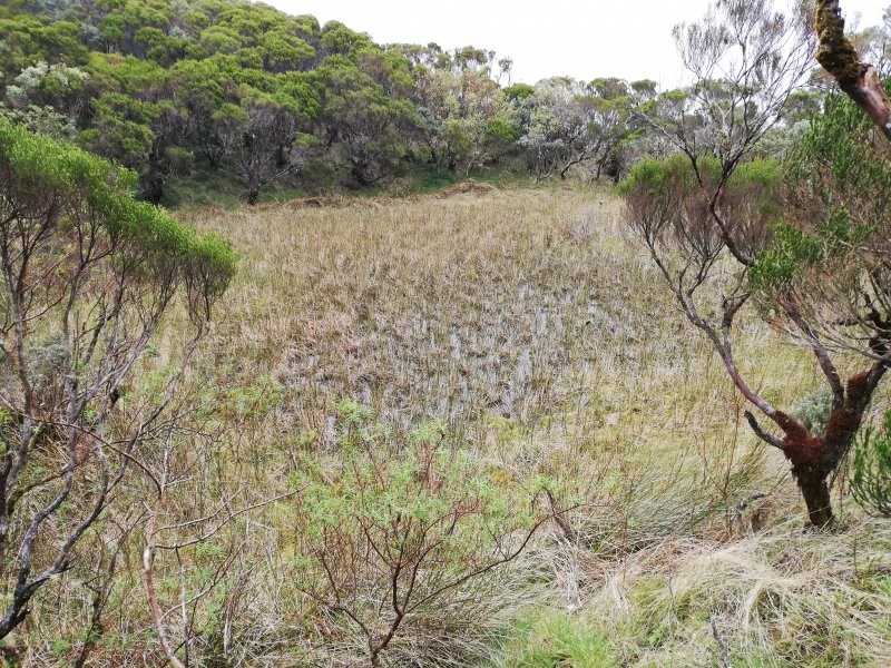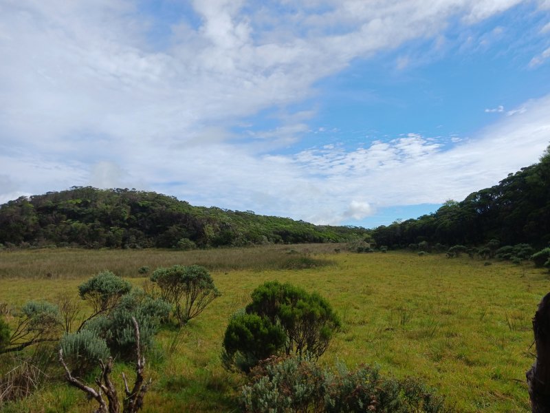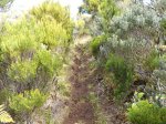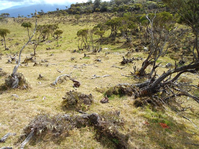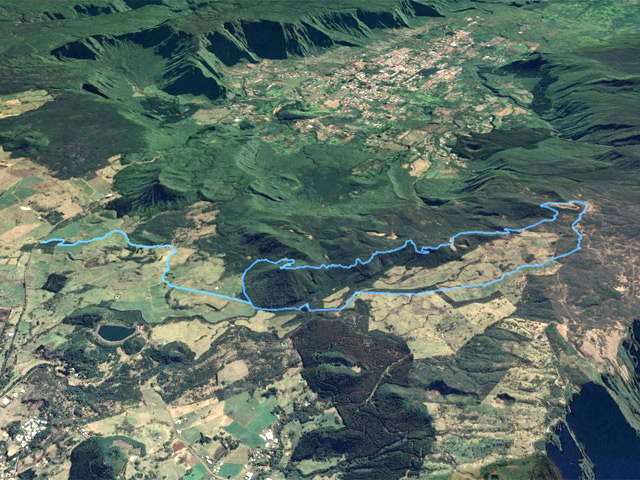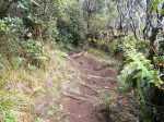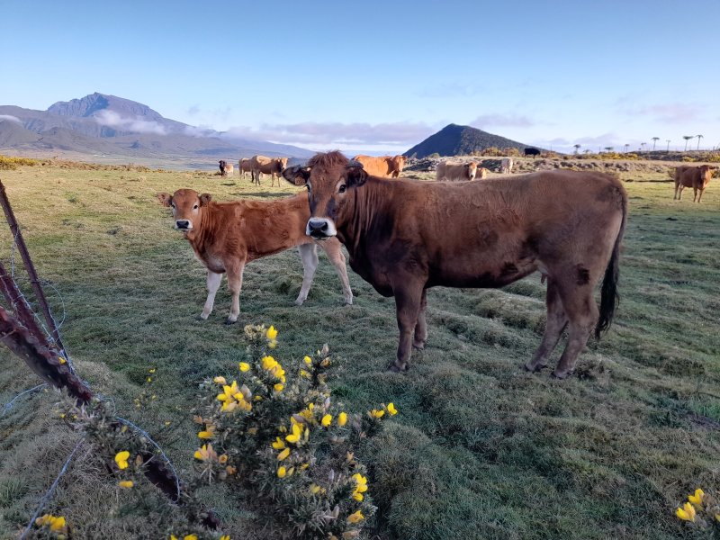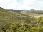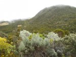 La randonnée débute à la route nationale de la Plaine des Palmistes où la très agréable aire de pique-nique du Pont de Trente permet de se garer avant de partir et de se reposer au retour. Après avoir longé la piste, traversé la route de Bourg Murat et rejoint le départ du GRR2, on longe la route du Chalet des Pâtres offrant de splendides panoramas de soleil levant sur le Piton des Neiges (Photo 1). La pente est tout d'abord faible dans les pâturages puis monte un peu plus. La végétation est rare, faite de brandes ou d'ajoncs d'Europe avant de rencontrer quelques bois de couleurs moussus. Dans les prés, des tas de pierres amassées années après années entourent quelques arbres. Avant d'arriver au chalet, on laisse sur la gauche le terrain militaire de la Grande Montée, déjà effleuré lors de la montée au Piton Textor depuis le Piton Doré. Aux habitations du Chalet des Pâtres, prendre à gauche le sentier du GRR2 puis poursuivre par une montée assez raide sur des marches soutenues par des planches et entourées de hauts fanjans et des branles verts (Photo 2). Certaines zones sont déjà couvertes de branles verts qu'on quittera très peu durant la boucle (Photo 3). Plus haut, les clôtures qui entourent les prairies forment une protection barbelée autour d'un magnifique sentier rectiligne (Photo 5). Le sentier est agréable et facile, même s'il faut se méfier un peu des ajoncs qui le bordent parfois. On arrive ainsi au pied du Piton Rouge qu'on aperçoit depuis le départ sur la gauche et qu'on retrouvera en fin de parcours. Les chaussures sont mouillées par la rosée des herbes mais au retour, elles seront crottées et la rosée aura disparu pour les nettoyer un peu ! On domine quelques prairies pour des photos pastorales agréables avec le soleil levant puis on redescend pour longer ensuite toute une région d'élevage (Photo 6). Il faut franchir le Petit et le Grand Bras de Pontho ainsi que quelques affluents en incurvant la randonnée vers le Piton Rouge dont on contourne le pied par le Sud (Photo 1). Heureusement il n'y a jamais d'eau mais on peut remarquer ça et là des petites retenues indiquées sur la carte par des points bleus. On poursuit ces dents de scie avec parfois de petites pentes plus fortes que la moyenne mais de courte durée. Le sentier terreux est également herbeux puisqu'il a été tracé en pleines prairies. Le Piton Rouge s'éloigne et on monte pour mieux dominer toute la région (Photo 8). Les clôtures encadrent le parcours et il faudrait mettre beaucoup de bonne volonté pour s'égarer. Derrière les clôtures, des troupeaux paissent ou se reposent. Il n'est pas rare de voir une vache seule perchée sur un rocher qui dépasse de la prairie et qui semble guetter le reste du troupeau comme le ferait une sentinelle. Le sentier s'élargit, devient piste couverte de basalte et il faut passer quelques échelles. On arrive enfin au plus haut de la boucle où plusieurs sentiers partent dans tous les sens, en direction du Textor ou du Nez de Bœuf qu'on devine à travers les pâturages (Photo 9). La pente a disparu, pas les branles mais des clairières agréables permettent de se reposer de la montée (Photo 10). Pour ne pas manquer la direction du Piton et du Lac Argamasse, marcher sur le sentier jusqu'à une pancarte constituée de 3 planches dont l'une précise "Déviation GR R2" (Photo 11). Le sentier de l'Argamasse commence une quinzaine de mètres avant la pancarte. Il devient alors moins pastoral et traverse les branles verts et les herbes jusqu'au lac. Cette retenue d'eau, très peu profonde, fait penser à une tourbière mais peut être très belle par beau temps surtout si le Piton Argamasse s'y reflète. (Photo 12). La boucle se poursuit en effectuant le tour du lac et en remontant vers le Piton Misère et le Piton Rouge. La montée est tout d'abord très douce et agréable dans les branles verts, gris et velours blancs sur un sentier herbeux. Les panoramas changent un peu avec la forêt de Bélouve et le Mazerin à l'horizon (Photo 13) ou la Plaine des Palmistes qui apparaît du côté de la Petite Plaine (Photo 14). On laisse sur la droite le Piton des Herbes Blanches puis on se rapproche du Piton Misère. L'humidité, constante dans ces régions, favorise la pousse des mousses sur les troncs (Photo 15). Après avoir passé le Piton Misère, il devient une horreur boueuse extrêmement glissante (Photo 16). Il faut constamment chercher les rares cailloux, les racines ou les joncs pour tenter de passer sans trop remplir les chaussures. Heureusement, certaines parties sont plus propres et l'herbe peut même servir à nettoyer les semelles (Photo 17). Après 2 kilomètres d'équilibre instable et de risques de chutes, on attaque la montée du Piton Rouge. On retrouve un peu de gadoue mais rien de comparable. Le sentier est en règle générale facile et propre entre les branles verts (Photo 19). On atteint le sommet du Piton Rouge après une dernière montée assez forte. En se retournant, on distingue bien le sentier qu'on vient d'utiliser (Photo 20). La descente par de nombreux lacets est aussi rapide mais la boue a presque totalement disparu, rendant le cheminement agréable (Photo 22). A l'horizon, la retenue des Herbes Blanches annonce la fin proche de la boucle (Photo 23). On passe une grande clairière (Photo 25) qu'on rejoint par un sentier qui est resté sec et agréable (Photo 26). La dernière descente, un peu forte également, ramène aux prairies qu'on devine depuis le haut (Photo 27). Le sentier oblique à gauche et repart plein sud pour contourner le piton et se termine près de platanes qu'on a du mal à reconnaître s'ils n'ont pas leurs feuilles tant il y a de mousses et de fougères sur leurs ramures (Photo 28). On retrouve avec plaisir le sentier du départ pour rejoindre assez vite le Chalet des Pâtres, protégé par les clôtures latérales. On ne voit pas les chiens mais ils nous font savoir bruyamment qu'i