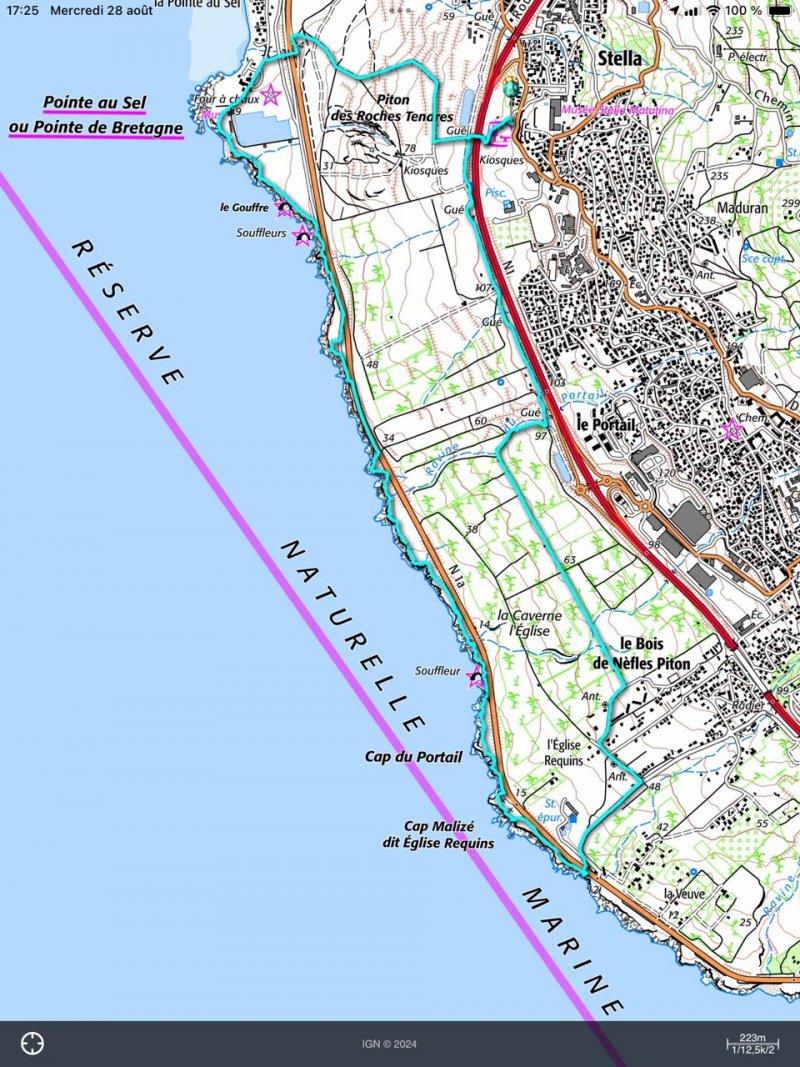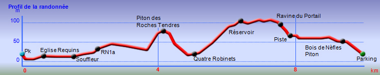 Quitter la Route des Tamarins à l'échangeur de l'Etang Salé ou de Stella et rejoindre la RN1a qui longe le littoral – Rouler jusqu'à la route de Bois de Nèfles Piton et stationner aussitôt à l'aire de pique-nique – Rejoindre la mer et l'Eglise Requins (Cap Malizé) – Suivre le sentier littoral durant 2 km puis traverser la route au moment où le sentier disparaît – Récupérer la piste parallèle à la RN1a qui se transforme en sentier – Effectuer une exploration du Piton des Roches Tendres puis se rapprocher de la Route des Tamarins – La longer jusqu'à la Ravine du Portail – Marcher vers la mer et bifurquer à gauche sur la dernière piste rejoignant Bois de Nèfles Piton – Tourner à droite sur la route pour rejoindre le véhicule.