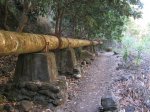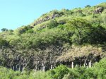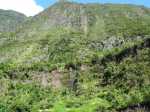 La randonnée débute en rive droite de la Rivière Saint-Etienne par quelques dizaines de mètres qui permettent de rejoindre les berges par la ruine d'un très ancien pont (Photo 1). Après cette ruine, la meilleure solution consiste à se rapprocher du milieu du lit qui est extrêmement large à cet endroit pour bifurquer à gauche et suivre les traces des pistes qui ont longuement été utilisées pour les longs travaux de réhabilitation ou de construction du nouveau pont. Les 4 km qui suivent sont les moins agréables de toute la sortie car le climat est chaud, la poussière omniprésente, les hautes herbes chargées de graines qui viennent se piquer dans les vêtements (Photo 2) et le paysage est sans intérêt. On a cependant quelques vues sur le Piton des Neiges et les crêtes du Dimitile. Près de Bois d'Olive, la vallée se rétrécit et on profite alors de belles zones de rivière et de berges rocheuses (Photo 3). Un ilot de pouzzolane couvert de végétation et de chocas donne une idée de l'éruption qui en est à l'origine (Photo 4). La rivière s'est chargée de le séparer durant des millénaires des longues falaises qu'on a de l'autre côté de la route. Quand on parvient à une falaise léchée par le courant, il est temps de viser le Bras de la Plaine (Photo 5). On arrive à la rencontre du confluent qui unit le Bras de Cilaos et le Bras de la Plaine tout près d'une aire de pique-nique surchauffée, très sale et peu attirante malgré le canal qui coule tout près. En partant sur la droite on a peu de mal à trouver un passage entre les hautes cannes fourragères entre deux piliers (Photo 6). Un sentier passe en dessous et la seule difficulté consiste à le repérer car trop à droite amène à l'aire de pique-nique ou trop à gauche vers le radier du Ouaki. Quand ce pont métallique sera franchi, on peut dire que marcher jusqu'à Grand Bassin sera une partie de plaisir malgré la longueur du circuit. Ce parcours est d'ailleurs le plus pratiqué à partir de ce pont. La remontée du bras débute dans les hautes cannes mais les passages, mêmes rares, permettent de trouver la trace. On frôle tout d'abord l'impressionnante chute provenant de l'usine hydroélectrique (Photo 7). Les grandes herbes diminuent, le sable et les galets sont de plus en plus visibles. On aperçoit déjà le pont de l'Entre-deux sous-lequel on passera dans 10 minutes (Photo 8). Il est imposant lorsqu'on le visite depuis la route en se rendant à l'Entre Deux. Vu du bas, on se demande comment il peut tenir lorsqu'un lourd camion franchit le canyon (Photo 9). 5 minutes plus tard on passe près de l'îlet abandonné de Mahavel où trône encore une grande roue à aube faisant, à l'époque, tourner un moulin (Photo 10). Plus on monte et plus la vallée se rétrécit. On alterne toujours les portions sableuses pour emplir les chaussures de sable et les traversées de rivière pour bien loger le sable entre les orteils ! Il faut donc s'arrêter de temps en temps pour rincer pieds et chaussettes. Le bruit d'une chute permet de repérer sur la gauche de superbes "pisse en l'air" qui rafraichissent de leurs embruns (Photo 11). Bien étudier au passage l'ingénieux système qui permet de faire passer l'eau d'un rempart à l'autre par une tuyauterie totalement verticale qui franchit la rivière sur une passerelle l'éloignant des crues en cas de cyclones. Tout près, une falaise d'orges basaltiques attire le regard (Photo 12). Les remparts continuent de se rapprocher et on peut marcher dans l'eau qui coule calmement une bonne partie du temps (Photo 13). La hauteur d'eau étant faible, la marche est relativement rapide. Au loin, la passerelle du Bras de la Plaine se devine et elle grandit au fur et à mesure qu'on approche (Photo 14). La meilleure manière de la passer est de grimper sur les plaques de basalte en rive gauche et utiliser le petit sentier pour atteindre le pont. On retrouve quelques mètres plus loin une sente qui rejoint la berge. Le cheminement est toujours le même : sable, galets et gués. Il y a déjà longtemps qu'on ne les compte plus. On passe au plus près de l'arche naturelle la plus connue de l'île pour arriver, un peu plus loin, aux magnifiques gorges du Bras de la Plaine (Photo 15). Remonter ces gorges spectaculaires en prenant bien son temps car c'est le clou de la journée. Elles sont tellement étroites par endroits qu'on a l'impression que les bords vont se toucher (Photo 16). Une bonne partie de la remontée s'effectue sur les galets qui bordent le cours d'eau (Photo 17). On longe les falaises qui supportent l'îlet Tata dont on aperçoit l'ancienne passerelle (Photo 18). Il est même possible d'éviter une longue portion de gorges en effectuant tout le trajet de l'Îlet Tata. C'en est fini de ces gorges lorsqu'on aperçoit la Caverne de la Petite Ravine. La vallée redevient plus large sur ce circuit déjà décrit pour venir du Bras de Pontho et rejoindre Grand bassin. Emprunter un sentier en rive gauche qui évite pour un temps de se mouiller les pieds (Photo 19). Il longe souvent une canalisation (Photo 20) ou la domine sur d'étroites passerelles avant d'arriver au barrage. La vallée est plus large qu'en aval et l'on aperçoit enfin les pentes qui ramèneront à Grand Bassin (Photo 21). Plusieurs îlets sont encore habités, du moins occasionnellement, le long des berges ou dans les premières pentes. Presque tous se sont transformés en gîtes. Ils se traversent ou se rejoignent par un étroit sentier qui emprunte une partie du rempart en évitant la rivière. Après le gîte de l'îlet Boulon, le sentier redescend vers les berges et la fin de la remontée s'effectuera sur sable, galets et dans l'eau. Quelques cascades coulent des remparts du côté de l'Îlet Cicelle (Photo 22). Le Contour Vaquérois est quant à lui totalement inhabitable tellement les falaises sont verticales. Lorsque cette nouvelle petite gorge est franchie, on aperçoit déjà le Voile de la 