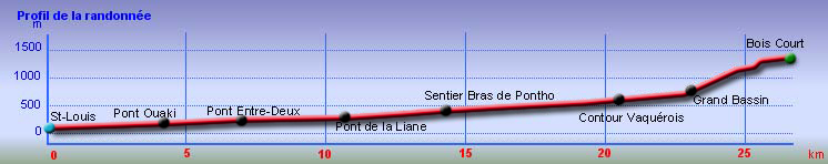 Voici plus de 25 km très aquatiques pour relier Saint-Louis à Grand Bassin par une pente faible mais les pieds souvent dans le fond de la rivière ; les deux km restants sont en montée assez forte pour rejoindre Bois Court. La difficulté provient de l'absence de sentier qui rend le trajet très aléatoire dans un lit de rivière qui avoisine parfois le kilomètre de large en aval. On emprunte au départ une large piste ayant servi aux camions du chantier de construction du nouveau pont. Hélas, même si cette piste est poussiéreuse, elle est relativement courte et il faut ensuite chercher le passage le plus plat, soit sur les galets, soit dans les hautes herbes, soit carrément dans le lit de la rivière. On aperçoit ça et là des traces de pistes oubliées ou de sentiers de pêcheurs qui permettent de marcher sur des surfaces plus planes. Les rares randonneurs tentant cette remontée débutent au pont métallique du Ouaki pour gagner en kilomètres, en temps et en sérénité. On franchit une trentaine de gués jusqu'au Voile de la Mariée et il est fortement conseillé de se chausser et se vêtir en conséquence. C'est un peu la journée des ponts : on emprunte tout d'abord un ancien pont en ruine, on longe le viaduc de la RN, on passe sous le pont métallique près du Ouaki, sous le pont de l'Entre-deux érigé plus de 60 mètres au-dessus, sous une passerelle portant un impressionnant tuyau de transport de l'eau. Le dernier pont, celui de la Liane, peut se franchir par dessus ou par dessous en fonction de la saison qui peut faire varier la hauteur d'eau sous l'ouvrage. C'est compter sans les passerelles situées au-dessus des gorges.