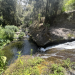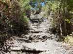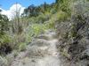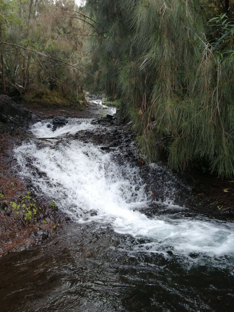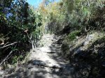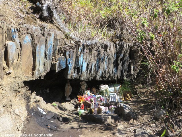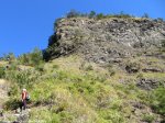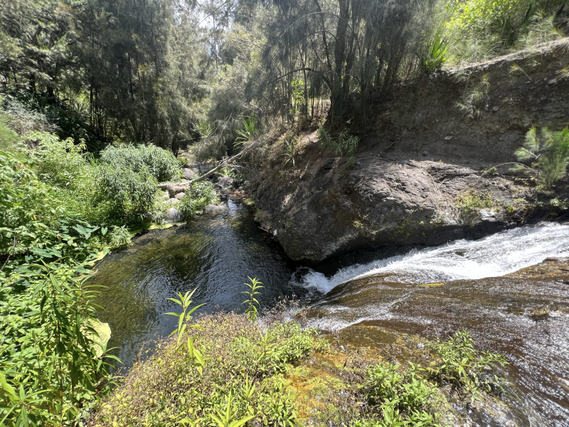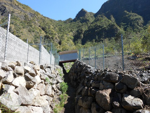 Piton Gros Galet : Le sentier du Piton Gros Galets débute à deux pas du pont où est garé le véhicule, à gauche, 50 mètres après le radier, sur la route de l'Îlet à Calebasse (Photo 15). Il chemine directement dans une végétation plus haute et plus dense que sur le Piton Morel. On grimpe parfois assez fortement mais le sentier est correct même s'il comporte parfois de gros cailloux (Photo 16). La montée, aussi forte que la précédente mais un peu plus longue comporte des marches soutenues par des rondins coupés au plus proche, d'autres taillées à même le sol ou des éboulis contournés, etc. Les panoramas sont nombreux sur Palmiste Rouge tout en marchant ou en se reposant un peu à un belvédère péi (Photo 17). Les lacets passent sous une multitude d'eucalyptus dont l'odeur agréable est remplacée un peu plus haut par celle du mimosa (acacia noir). Quelques pieds de bibasse poussent le long du sentier proche de l'emplacement de ce que fut l'Îlet de Gros Galet. Plus haut, ce sont des points de vue en direction du Bonnet de Prêtre et de la vallée de la Ravine des Calumets qui s'observent en se retournant (Photo 18). Un autre petit belvédère, installé il y a quelques années vieillit mais propose toujours de belles vues sur le Morne de Gueule Rouge (Photo 19). Le sentier oblique vers la droite après avoir parcouru le piton par quelques boucles et montées ou descentes successives, principalement sur des hautes marches (Photo 20). On rencontre un nouveau sentier partant vers la gauche en direction du sommet. La pente est forte mais il est possible de rajouter cet aller-retour un peu sportif et très caillouteux. Terminer la descente sur un sentier plus plat et facile (Photo 22). On rejoint la route de l'îlet dans un lacet où passe le Bras de Calebasse pour rejoindre plus bas la Ravine des Calumets. L'îlet à Calebasse est un peu éloigné de tout et on a peu l'occasion de s'y rendre souvent, autant donc en faire un petit tour avant de rentrer. Pas d'itinéraire précis proposé ici ; il suffit de se rapprocher des habitations et de suivre la route qui chemine entre les cases ou les champs pour apprécier le calme de l'endroit (Photo 24). On peut y faire des rencontres intéressantes dont un spécialiste des bonsaïs. Le retour est facile sur le goudron et peu dangereux car la circulation y est presque inexistante. Après avoir passé le lacet d'où surgit le sentier pris en descente, repérer, 200 mètres plus loin, le sentier du Bois Rouge qui file vers la Ravine des Calumets (Photo 26). Il longe de nouveau le Bras de Calebasse puis la Ravine des Calumets avant de retrouver la route, évitant ainsi quelques centaines de mètres de macadam. On peut repartir à gauche pour une courte boucle passant par le bois rouge centenaire et sa table de rondins (Photo 27). Une fois sur la route, rejoindre l'aire de Fond de Galet par la route ou en osant une balade vers les bassins de la Ravine des Calumets en empruntant le premier sentier rencontré sur la gauche (Photo 28). Par temps chaud, le maillot sera même le bienvenu.