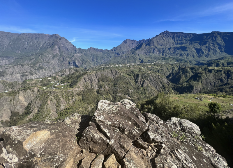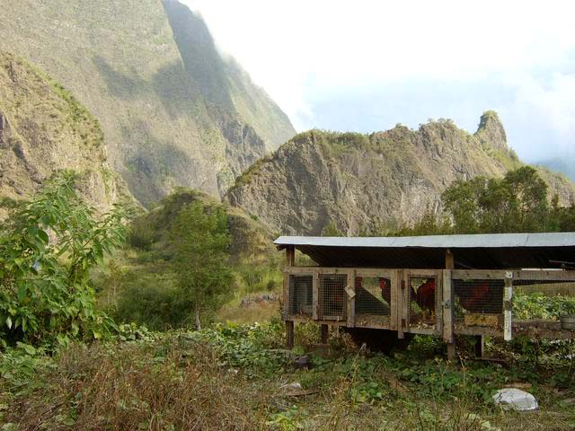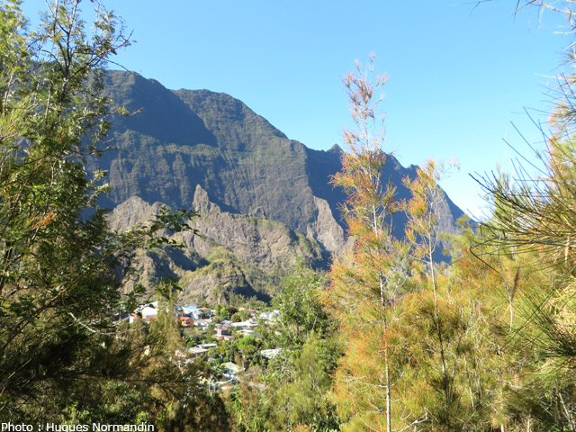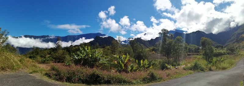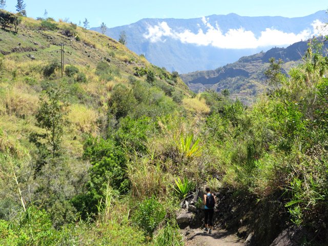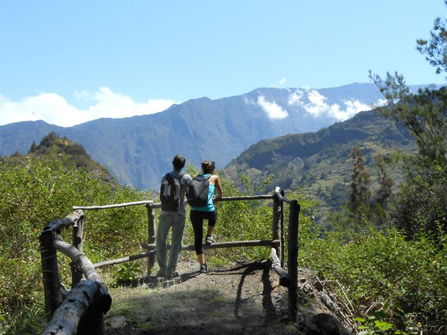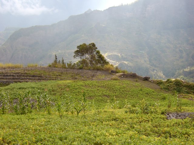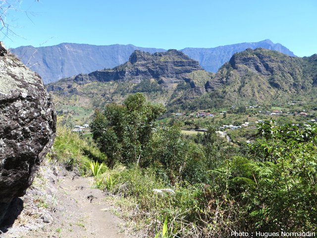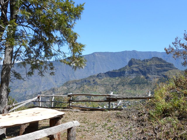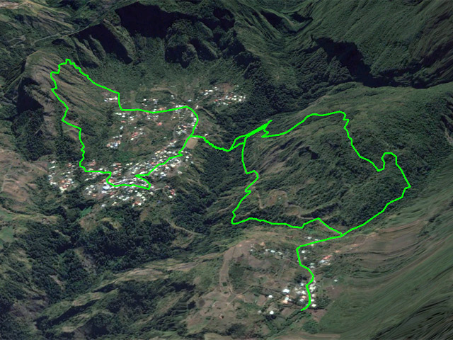 Piton Morel : La randonnée débute près du pont sur la Ravine des Calumets afin de terminer la deuxième boucle près de l'aire de pique-nique. Il est bien sûr possible de stationner au centre ville et d'adapter cette sortie en fonction. Longer le ruisseau vers l'aval en empruntant le sentier qui lui est parallèle en rive gauche. Traverser la ravine aux croisements de sentiers et emprunter le premier à droite remontant vers le stade de Palmiste Rouge. Il est assez raide sur des lacets sableux mais relativement court. Prendre à gauche le Chemin Papaye et regagner le centre ville avec ou sans les raccourcis (Photo 1). Marcher vers Cilaos, franchir le Bras Morel et tourner immédiatement à droite sur le sentier du Piton Morel. Le sentier grimpe d'abord sous les filaos avant de rejoindre des zones de végétation plus basse (Photo 2). La pente est régulière sans piège particulier (Photo 3). Plus on monte et plus les paysages vers le village ou en direction de l'Îlet à Calebasse s'élargissent (Photo 4). Un belvédère sur la gauche permet d'admirer ces paysages en soufflant un peu. Une partie des flancs du piton est cultivée et le sentier traverse un champ pentu de lentilles. Une portion plus pentue débute à l'approche d'une barre rocheuse qui imposera de se pencher un peu vers l'avant (Photo 5). Certaines parties du sentier sont de bonne qualité et la grimpette s'effectue assez rapidement avec toujours ces beaux panoramas (Photo 6). Le sentier traverse plus loin une zone instable où les petits éboulis fréquents créent des tas de sable glissants (Photo 9). On arrive au croisement avec le sentier remontant vers l'Îlet de Gueule Rouge et celui descendant à Palmiste Rouge. Si le chrono le permet, prendre à gauche et attaquer une très forte pente jusqu'au point de vue du Piton Morel. L'effort est important mais le résultat fait tout oublier d'un coup (Photo 10). Hormis un pan du Grand Piton, on a une vue circulaire sur l'ensemble du cirque de Cilaos. Reprendre en descente le sentier du point de vue et rejoindre le croisement. Tourner à gauche et entamer la courte descente vers le village. On emploie quelques lacets en bord de falaise sécurisé par les rambardes (Photo 11). La descente, assez caillouteuse traverse des zones couvertes de galaberts, de cannes fourragères et de chocas (Photo 12). Le sentier, bordé de pierres sèches au milieu des cultures annonce la fin proche de la descente (Photo 13). Le village, du côté du Chemin Morel est bordé de grands champs de lentilles (Photo 14). Prendre à gauche en arrivant à la route et rejoindre le terrain de sport de plusieurs manières possibles (par la route ou en empruntant un raccourci à la fin du Chemin du Bassin). On se retrouve alors sur la portion de sentier qui montait tellement au départ vers Palmiste Rouge. C'en est fini de la première boucle au moment où on rejoint le véhicule après cette descente.