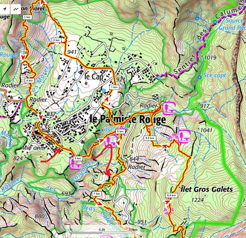 Cet agréable circuit permet de tourner autour de Palmiste Rouge en effectuant deux boucles. La première escalade les flancs du Piton Morel qui domine le village tandis que l'autre grimpe les pentes du Piton Gros Galets par un sentier parfois escarpé. Il ne figure sur aucune carte mais est facilement repérable, sur la gauche de la route de l'Ilet à Calebasse, quelques mètres après le radier de la Ravine des Calumets et son aire de pique-nique de Fond de Galets. Il attaque directement la pente du Morne Gros Galets sans en atteindre le sommet puis bifurque à droite pour rejoindre la route de l'Ilet à Calebasse. Quelques raidillons parmi les eucalyptus, acacias, bois de couleurs ou fougères cassent un peu les jambes mais sont très courts. Il permet à de nombreux endroits d'admirer le Cirque de Cilaos sous un angle inhabituel. Durant la montée on profite du panorama depuis un belvédère aménagé près d'une table de pique-nique, vers le village de Palmiste Rouge alors que la descente est plus bouchée mais donne une vision impressionnante du rempart des pentes du Sommet de l'Entre Deux. L'ilet à Calebasse, bien qu'éloigné de tout, ne donne pas l'impression d'être isolé ; ceci est dû sans doute à de belles et grandes demeures qui cohabitent avec les cases habituelles mais surtout le panorama autour qui permet d'un seul regard d'embrasser le cirque. Le sentier du Piton Morel, quant à lui, déjà pratiqué pour faire découvrir les cascades de la Ravine des Calumets est également en bon état. Il permet aussi de splendides panoramas sur le Dimitile et le village de Palmiste Rouge.