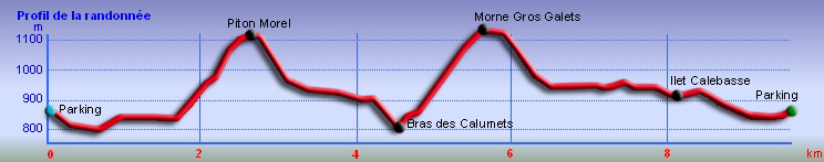 Se rendre à Palmiste Rouge, avant Cilaos - Traverser le village en direction de l'ilet à Calebasse - Franchir la Ravine des Calumets par le radier bétonné et stationner dix mètres plus loin à l'aire de pique-nique sur la gauche de la route - Marcher en direction de l'Ilet à Calebasse sur 20 mètres puis prendre à droite le sentier qui longe le torrent - Traverser l'eau au gué et remonter la ravine jusqu'au premier sentier à droite qui rejoint le bas de Palmiste Rouge en arrivant au terrain de sport - Traverser le village en passant devant l'église et la mairie annexe et poursuivre vers Cilaos - Aussitôt la Ravine Morel traversée, obliquer à droite et suivre le sentier qui mène presque au sommet du piton Morel - Depuis le sommet, rejoindre Palmiste Rouge et atteindre le stade de football qu'on contourne par la gauche pour reprendre le sentier pris à l'aller - Rejoindre puis traverser la Ravine des Calumets au même gué qu'à l'aller - Remonter à la route par le sentier direct et marcher en direction du véhicule - Repérer, à 50 mètres du radier, le sentier qui part en direction du sommet du Piton Gros Galets - Effectuer la montée puis la descente - Rejoindre l'Ilet à Calebasse, le visiter (ou non) et rejoindre le véhicule en suivant la route puis le sentier de Bois Rouge qui démarre à gauche de la route et rejoint plus loin un lacet de la route.