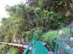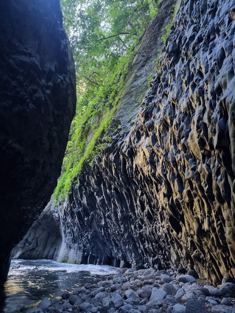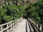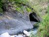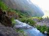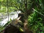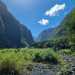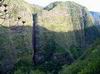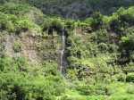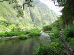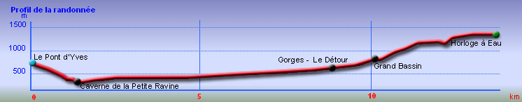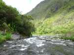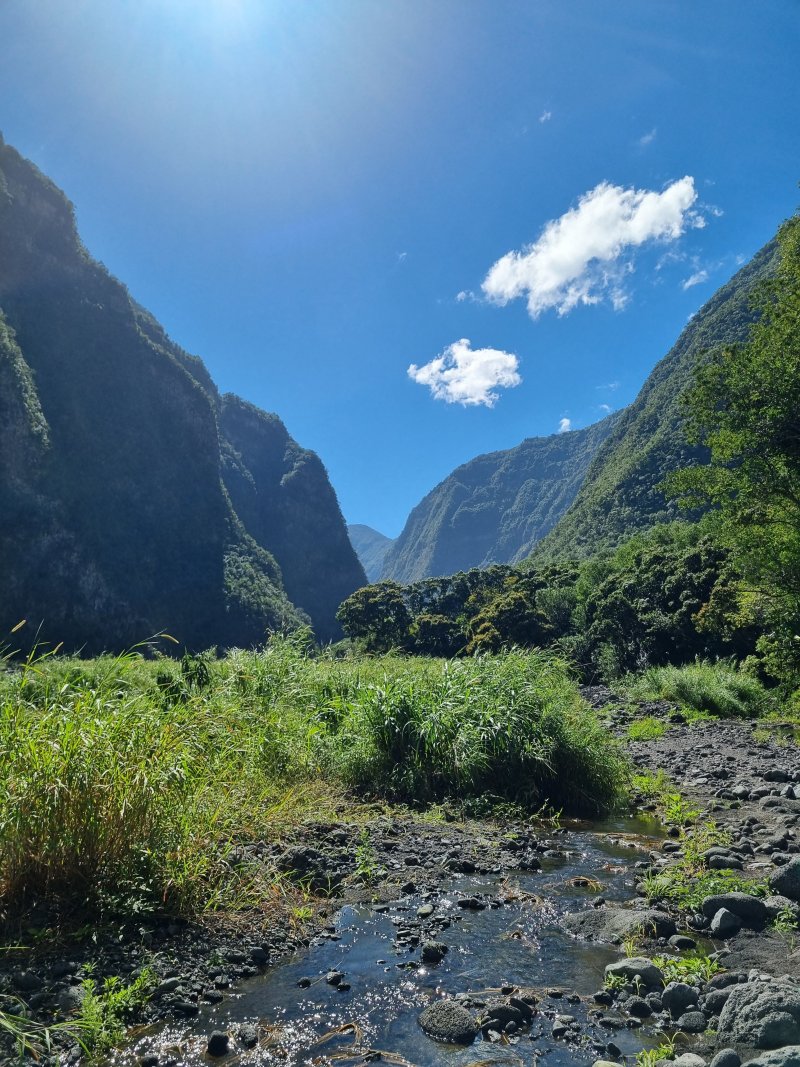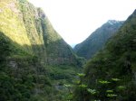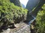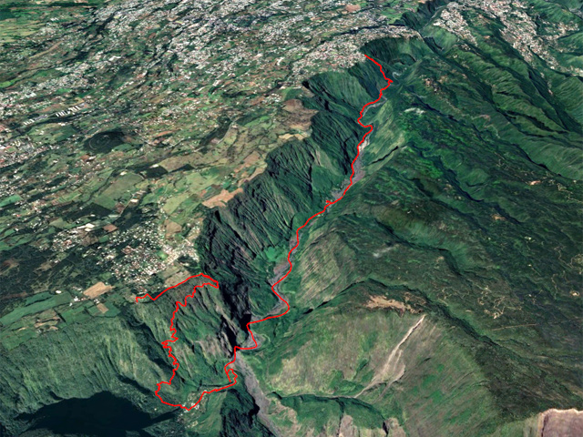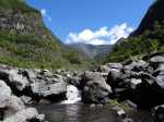 La randonnée débute à Pont d'Yves avec très peu de place pour garer un véhicule au fond de la petite impasse. Le sentier, assez abrupt, descend à flanc de falaise (Photo 1) jusqu'à la rivière, un peu en amont de la Caverne de la Petite Ravine en alternant terre, marches plus ou moins hautes et rondins sans oublier les grosses pierres (Photo 2). Il donne une bonne idée de celui qu'il faudra remonter à partir de Grand Bassin pour terminer la sortie en forte pente. La végétation pauvre en bois de couleurs mais riche en pestes de toutes sortes empêche souvent les points de vue sur la vallée. Quand on peut voir au loin, c'est pour se retrouver face à une falaise coupée verticalement par la très haute chute de la Ravine de l'Argamasse (Photo 2) qui arrive du hameau du même nom, déjà visité par les Sentiers des Trophées Mondiaux ou Le Doyen. On arrive en une vingtaine de minutes de descente continue aux berges du Bras de la Plaine qu'on entend couler depuis le sommet (Photo 4). A gauche débutent les itinéraires vers les gorges ou l'Îlet Tata. A droite, suivre la piste détruite ayant servi à la réfection du barrage. Plus loin, marcher aux meilleurs endroits du terrain en longeant au plus près le torrent. Dans un virage de la rivière vers la gauche, en face, ne pas manquer le départ du sentier repérable à la peinture blanche sur les galets. Dès qu'on a franchi la butte très glissante constituée de sable et de galets mélangés, le sentier, de très bonne qualité apparaît (Photo 6). Il chemine à l'ombre de faux poivriers le long d'une canalisation qui est soit aérienne, soit enterrée et recouverte du sentier lui-même, donc droit et plat. Les petites ravines sont traversées par des passerelles qui soutiennent le tuyau et on les franchit (Photo 7). Prendre à droite pour éviter l'édifice rouillé et traverser le Bras Sec. On passe également une large passerelle en bois (Photo 8) d'où l'on bénéficie de beaux points de vue sur la rivière (Photo 9). A Grand Coin, le sentier se sépare en deux : à gauche, marcher sur la passerelle pour avoir un point de vue sur le barrage du Bras de la Plaine puis revenir à droite pour emprunter le sentier désormais officiel. Il est étroit, bordé de chocas et domine le précipice vers la rivière, monte en pente légère et finit en haut du barrage, en rive gauche. Profiter du mur bétonné pour étudier les installations et poursuivre vers l'amont. Quatre kilomètres de rivière attendent le marcheur pour rejoindre le pied de la cascade de Grand Bassin. Certaines traces sont bien visibles le long de la rivière et des barres rocheuses qui la longent (Photo 10). Marcher quelques minutes au plus près de l'eau avant d'emprunter le sentier qui part sur la droite en longeant une nouvelle canalisation (Photo 11). Passer une nouvelle fois la rivière et suivre les traces de peinture de plusieurs couleurs sur les galets vers le prochain gîte (Photo 12). On remarque plusieurs habitations dans la verdure des berges dominant le bras. Puis, après un bassin, traverser pour rejoindre le l'Îlet Paradisiaque pour s'y désaltérer si les installations sont ouvertes au public (Photo 13). L'endroit est effectivement charmant et incite à y venir passer une nuit. Sinon, poursuivre pour retrouver un nouveau sentier qui grimpe sur la falaise dans une végétation touffue (Photo 14). On frôle une adorable petite case blanche dans les bananiers avant de parvenir aux tentes de l'Îlet Boulon. Le sentier se poursuit encore quelques centaines de mètres pour se terminer sur la berge. On alterne alors entre les parties larges remplies de galets et de sable, les zones étroites et encaissées, les hautes herbes, les touffes de bois de chapelets, les gués plus ou moins larges et l'on voit se rapprocher les hautes falaises vers Grand Bassin. La rivière est toujours aussi fougueuse (Photo 15). Les falaises abruptes du Contour Vaquérois au pied du Piton Petit Louis se passent tout aussi facilement que la rivière en se mouillant les pieds si nécessaire (Photo 16). Une petite canalisation subsiste sur la paroi verticale mais ne doit plus avoir d'eau depuis longtemps (Photo 17). Sur la gauche coulent de petites cascades (Photo 18). Traverser le Bras des Roches Noires au fond plus rocheux que tout ce qu'on vient de remonter (Photo 19) et marcher en direction de la cascade du Voile de la Mariée en franchissant une surface importante de hautes herbes, longoses et cannes fourragères (Photo 20). La baignade est très souvent possible et représente une agréable récréation en saison chaude. Le sentier qui remonte à Grand Bassin grimpe fortement au départ et devient plus plat à la hauteur du haut de la chute. On peut s'approcher du haut de la falaise mais attention de ne pas glisser des rochers pour une autre vue de cette belle chute (Photo 21). La remontée à Grand Bassin puis Bois Court, très classique à la Réunion, passe par un sentier qui franchit un gué du Bras de Sainte-Suzanne, traverse quelques champs et vergers microscopiques avant d'arriver dans les "rues" étroites du village, bordées de murs en pierres sèches (Photo 22). Sèches n'est pas toujours l'adjectif qui convient car la mousse et l'humidité de ce fond de vallée les rendent souvent humides ! Partout dans le village, des gîtes permettent de se ravitailler ou se désaltérer avant d'attaquer la forte pente maintes fois décrite vers le belvédère de l'Horloge à Eau. La remontée est longue, comporte de hautes marches et semble ne jamais finir. D'importants travaux d'aménagements hydrauliques ont un peu modifié le paysage mais des escaliers et passerelles évitent de les enjamber (photo 23). Les lacets sont nombreux, souvent caillouteux mais en prenant son temps on est certain d'arriver sans trop de fatigue. Les points de vue sur Grand Bassin ou les vallées sont nombreux (Photo 24). Le plus agréables de tous et de pouvoir revoir de haut la cascade qui a marq