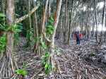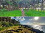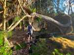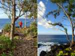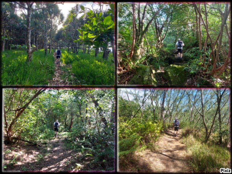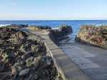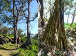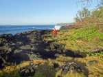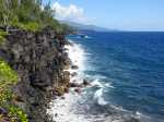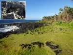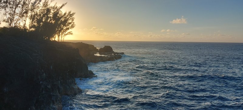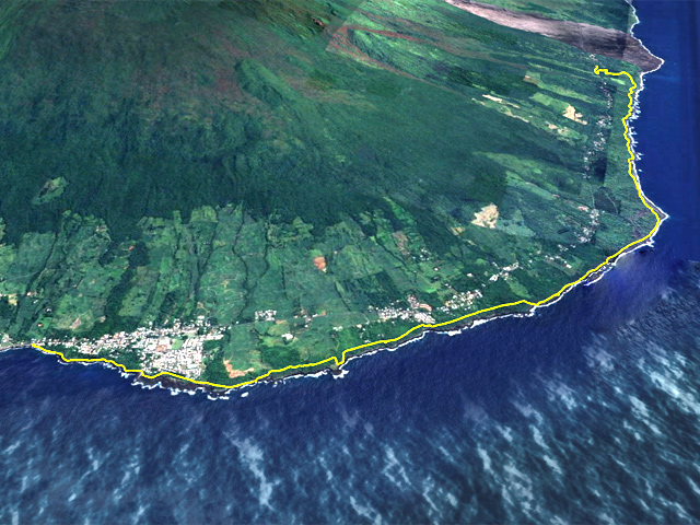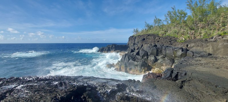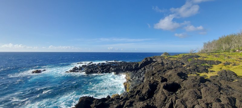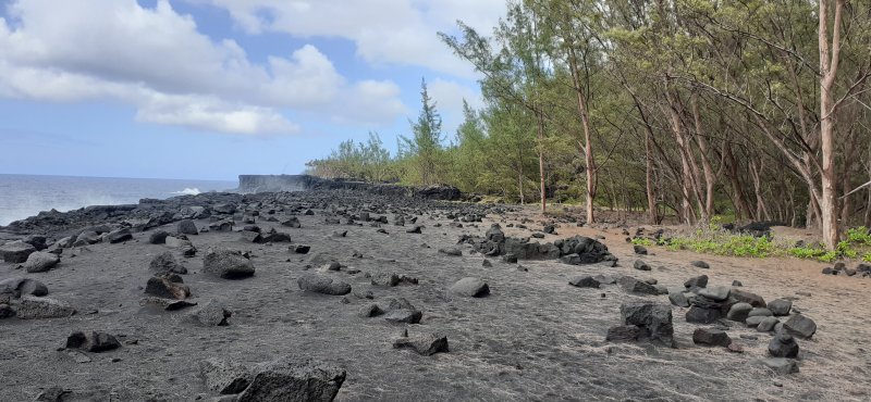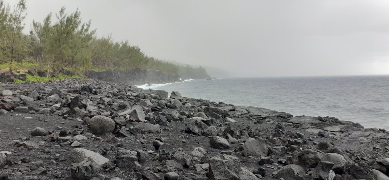 La randonnée débute à Mare Longue, à l'arrêt de bus situé près de la Mer Cassée et de son petit restaurant créole. Saint-Philippe se rejoint après un kilomètre d'un petit sentier littoral qui passe au plus près de la falaise. La plage de gros galets de la Mer Cassée ne se prête pas du tout à la baignade mais donne l'occasion de superbes photos par mer forte. Partir en se rapprochant déjà très près de la mer sur un sentier sous les vacoas (Photo 1). Ils sont partout et on en verra jusqu'à l'arrivée. L'étroit sentier se rapproche très vite des premières falaises sous les filaos (Photo 2). Les pothos (Epipremnum pinnatum) aux feuilles en forme de cœur, vertes striées de jaune, occupent presque tout le sol par endroits. Mais ce sont surtout les pandanus (vacoas à La Réunion) qui dominent. Cet arbre emblématique des régions tropicales a longtemps été utilisé dans toutes sortes de fabrications artisanales. La marche s'effectue totalement à plat. Partout, les falaises sont éclaboussées par les vagues (Photo 3). Ne pas s'en approcher en période de houle. La falaise s'effrite d'année en année. Le sel et les vents tuent les arbustes les plus proches du rivage d'où l'on peut apercevoir les pentes boisées en direction du Volcan (Photo 4). Une bonne partie de la marche se fait sur le gazon bord de mer (Zoysia tenuifolia) qui supporte très bien les embruns salés (Photo 5). Les premiers filaos terrassés font leur apparition (Photo 6). Leurs racines étalées sur le basalte ne les retiennent pas des forts coups de vent. Il y en aura bien d'autres jusqu'à l'arrivée. La marche se poursuit sans difficulté, parfois très proche du bord de la falaise (Photo 7). Lorsque le sentier s'en éloigne, on marche à l'ombre des vacoas sur d'épaisses couches de feuilles sèches (Photo 8). Cet agréable tronçon prend fin à la petite Place du Warren Hastings et son monument, souvenir du naufrage du vapeur en janvier 1897. La placette est occupée par de jolies barques de pêcheurs (Photo 9). C'est tout près qu'elles sont mises à la mer par une marine protégée des vagues par les rochers (Photo 10). Partir par la marine et traverser une zone rocheuse où les filaos encore vivants tentent de survivre sur leurs énormes racines (Photo 11). Rejoindre la Rue de la Pompe puis marcher à l'ombre des vacoas jusqu'au premier virage à gauche. Filer tout droit et traverser un petit parc offrant de nouvelles belles vues sur les pentes (Photo 12). Franchir la passerelle en bois et entamer la deuxième partie jusqu'à la Pointe de la Table (Photo 13). On retrouve les mêmes paysages qu'avant la ville. On entre ici dans la réserve biologique littorale qui est une zone préservée. Lorsque cela est possible, choisir entre les parties ombragées sous les vacoas ou se rapprocher du littoral pour fouler le gazon (Photo 14). Le bruit des vagues est constant et l'envie d'effectuer tout le trajet au plus près de l'eau est tentante. Mais le sentier officiel, balisé de bleu, est quand même le but de la randonnée. Pourtant, plus loin, un petit sentier de pêcheur sur la droite redonne envie de se rapprocher du Quai d'Henri Dalleau et d'y trouver l'arche basaltique (Photo 15). De retour sur la trace, on rencontre de plus en plus souvent de longues parties herbeuses qui nécessiteraient un peu de tonte (Photo 16). Une première échelle, toute neuve, permet de descendre une barre rocheuse. Il y en aura une autre plus loin pour la remonter (Photo 17). Le paysage change très peu, le sentier également. On foule tour à tour la traînasse, des parties encombrées de racines ou de roches avec très peu de hautes marches (Photo 18). Côté sous-bois, en plus des vacoas et des filaos on trouve de plus en plus des goyaviers qui se sont installés aux abords. De magnifiques bois de chandelle devaient, à l'origine, délimiter des parcelles. Quelques bois de couleurs demeurent et on passe sous de splendides baringtonias (bonnets de prêtres) laissant au sol leurs fruits carrés caractéristiques (Photo 19). On voit aussi, ça et là, des lianes de vanille devenues sauvages. Après de nouvelles incursions vers l'océan pour retrouver de magnifiques filaos (Photo 20) ou des quais battus par les vagues (Photo 21) on s'approche du premier kiosque près du parking du Puits Arabe. La troisième partie débute par la traversée de la Pointe de la Table en suivant les points d'exclamation rouges des balises . On passe ainsi devant les panneaux pédagogiques de cette boucle, près de la grotte ou de la fin du tunnel de la rivière de lave jusqu'à la RF3 de Takamaka. A partir de la piste, le sentier est toujours aussi agréable malgré la présence de racines (Photo 22). Contrairement à la 2ème partie, le sentier passe souvent en bord de mer et permet d'admirer les falaises impressionnantes et même apercevoir au loin l'épave du Tresta Star encastrée dans la coulée de 2007 (Photo 23). La partie de fin de randonnée, identique aux autres déjà parcourues, est un peu plus envahie de traînasse, de tabac bœuf ou de fougères mais jamais on ne se pose la question sur la direction (Photo 24). On quitte rarement les vacoas même si l'on rencontre quelques arbres caractéristiques dont de très nombreux takamakas laissant leurs grosses graines au sol (Photo 25). Le dernier km est beaucoup plus rocheux. Il faut souvent descendre de hautes marches pour les remonter aussitôt ou franchir de petites ravines au fond moussu (Photo 26). Après plus de 4 heures de marche, on frôle un arbre énorme sur la gauche qui annonce l'arrivée prochaine à la RF du Vieux Port (Photo 27). Après les derniers slaloms entre les goyaviers, le sentier se termine au parking du Vieux Port. Il est possible de rejoindre la Nouvelle Plage du Tremblet en filant à droite. Sinon, prendre à gauche et remonter la seule pente de 100 m de la journée pour atteindre la RN2. Bordée de forêts, elle serpente à l'ombre et l'on croise les 
