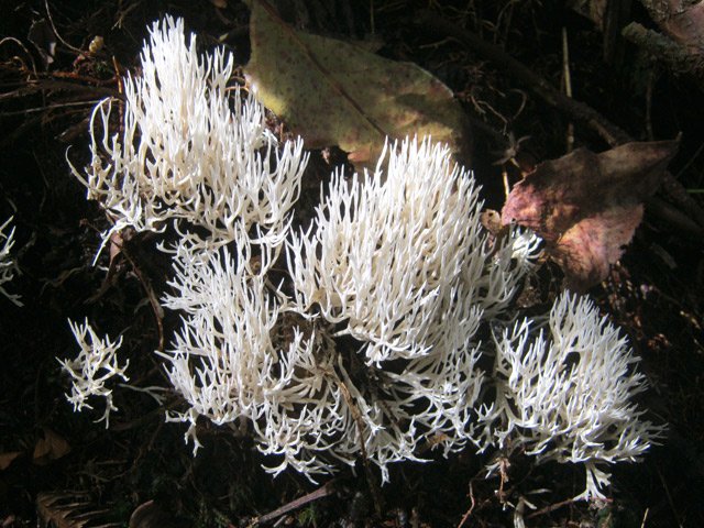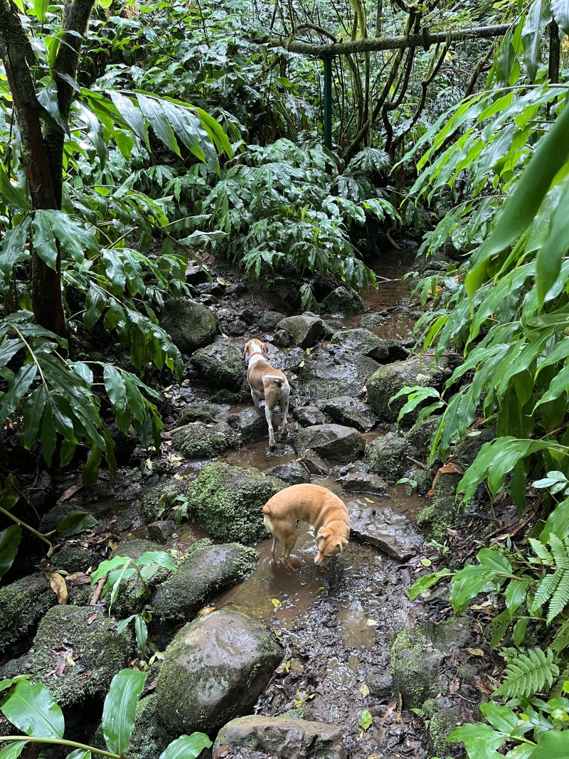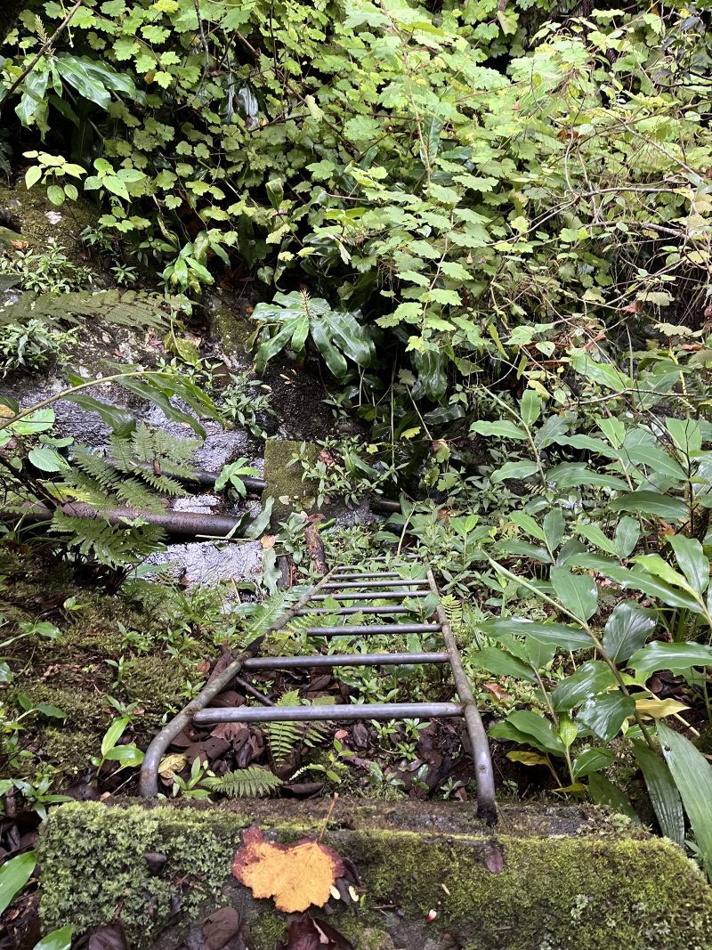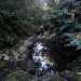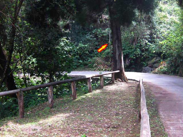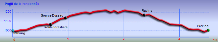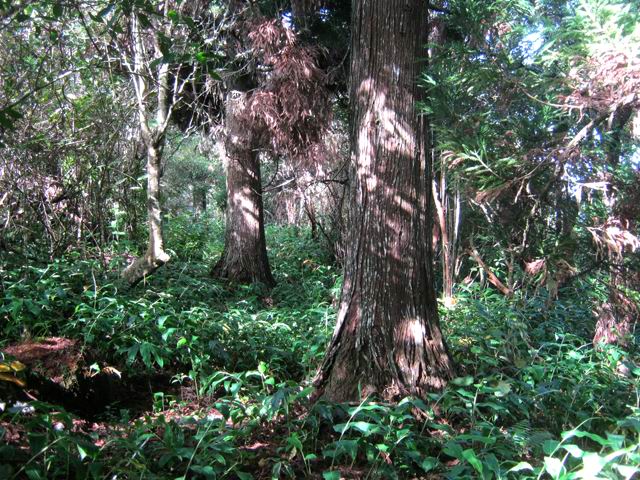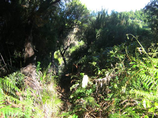 Lorsqu'on regarde la carte au nord du Tévelave on est frappé par le nombre important de cercles bleus représentant chaque fois une source. En y regardant de plus près on remarque également des pointillés indiquant que quelques sentiers sont répertoriés. Le sentier emprunté sur cette page n'apparaît pas sur la carte. La région est effectivement très humide et malgré la végétation parfois dense, il est pratiquement impossible de s'y perdre car on rencontre à tout bout de champ des tuyaux en fonte ou en plastique dans lesquels on entend l'eau circuler ou s'enfuir par de petites ou grosses fissures. On remarque également sur la carte des traits verts. Quand on arrive sur l'emplacement, on remarque très vite que ce sont de larges allées qui ont été plantées d'une seule rangée d'arbres, très souvent des cryptomerias. Entre les troncs souvent envahis de longoses on remarque pourtant des sentiers étroits montrant que quelqu'un passe ici de temps en temps. La randonnée de la Source Dussac permet de rencontrer 5 prises d'eaux sur de petits cours d'eau qui, à eux seuls, ne pourraient pas alimenter les populations des bas.