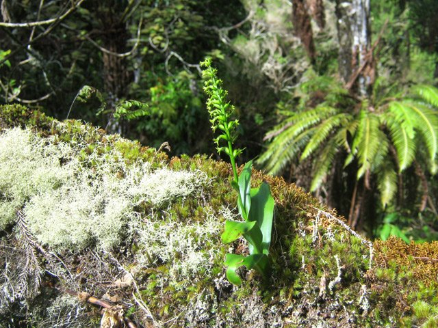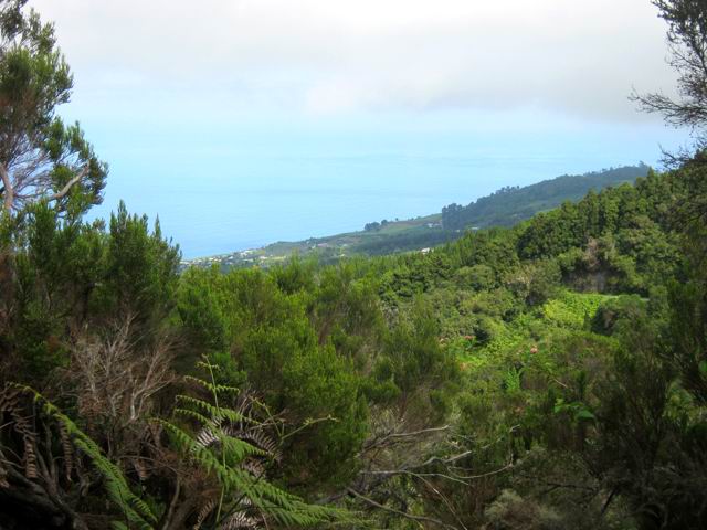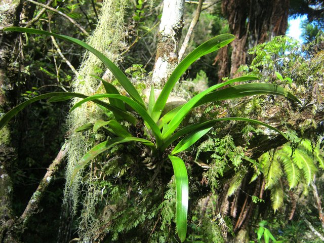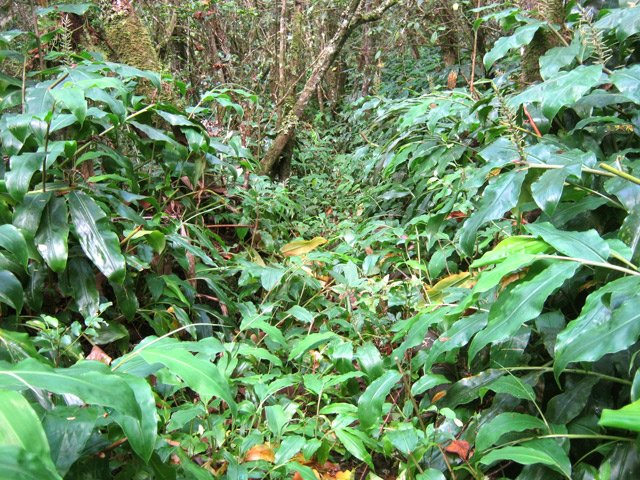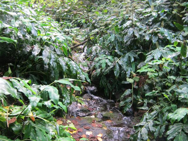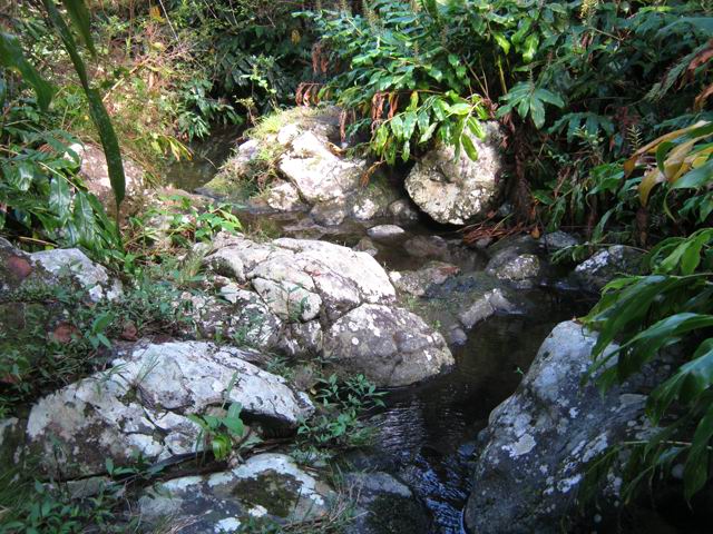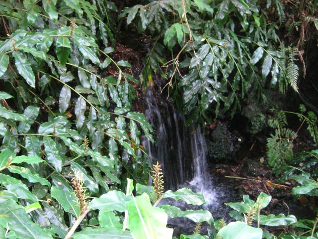 Le sentier commence au départ du sentier des Ouvriers car la balade seule dans les longoses des sources serait trop courte. On profite au début des explications sur la vie des ouvriers sur des pancartes qui se salissent vite ou se couvrent de mousses. Après une partie ombragée sous le couvert de la végétation, on utilise un sentier de bonne qualité constitué de terre et de quelques marches. Les cryptomerias annoncent l'arrivée proche de la route bordée de plusieurs aires de pique-nique. Il faut marcher une petite centaine de mètres sur la route en direction du Maïdo pour trouver le sentier des sources sur la droite de la route juste après le virage vers la gauche (photo 3). Il est étroit et bien marqué puis monte rapidement mais sans effort sur les flancs du Piton Monty, dans les bois de couleurs envahis de fougères et longoses. Très vite on rencontre une première prise d'eau puis une seconde. Le sentier se rétrécit un peu, il est bordé de fougères plus nombreuses et bien sûr de goyaviers. On entend ci et là le bruit de petites chutes d'eau (photo 5) qui sont chaque fois reliées par d'étroits sentiers. C'est le royaume humide des orchidées dont on rencontre plusieurs spécimens différents. Outre les longoses, la forêt de bois de couleurs n'a rien d'exceptionnel hormis quelques gros spécimens pas toujours facile à nommer. On rejoint plus haut la plantation d'une rangée de cryptomerias (photo 6) qu'il est très facile de suivre même si elle est parfois encombrée de quelques lantanas griffus ou de plus en plus de longoses. On chemine ainsi de tuyaux en tuyaux pour arriver à une profonde ravine où coule un affluent du Bras de Jeanne (photo 11). La descente est courte (5 à 6 m) mais très raide ; la remontée est tout aussi raide mais plus longue (20 m) et il faut bien s'accrocher aux branches. On poursuit plus haut, toujours sous les cryptomerias et on visite ainsi, comme un employé chargé de l'entretien du sentier, toutes les sources de la région. Le retour s'effectue par le même itinéraire. Mais il est également possible de suivre cet itinéraire jusqu'à la route où l'on retrouve le sentier des Ouvriers ce qui permet de poursuivre une visite des lieux sans avoir à passer deux fois par le même endroit. Le circuit reconnu (carte) est facilement repérable sur le terrain. C'est en revanche plus difficile pour rejoindre la route sans se griffer ou glisser dans les longoses.