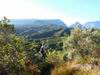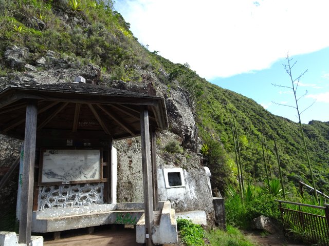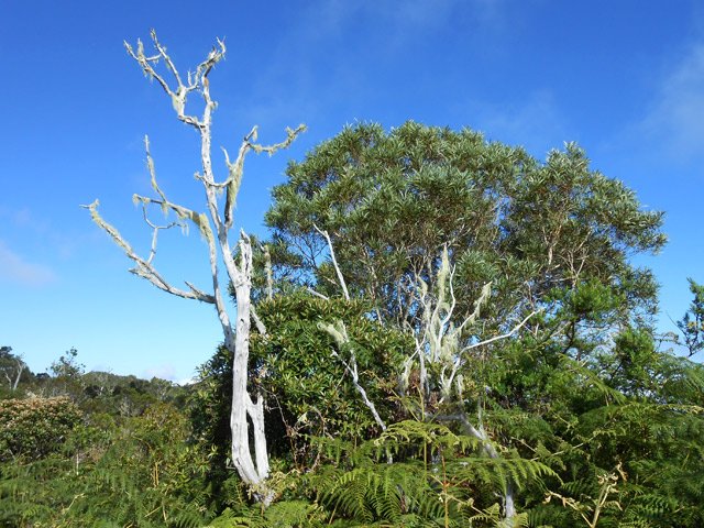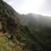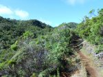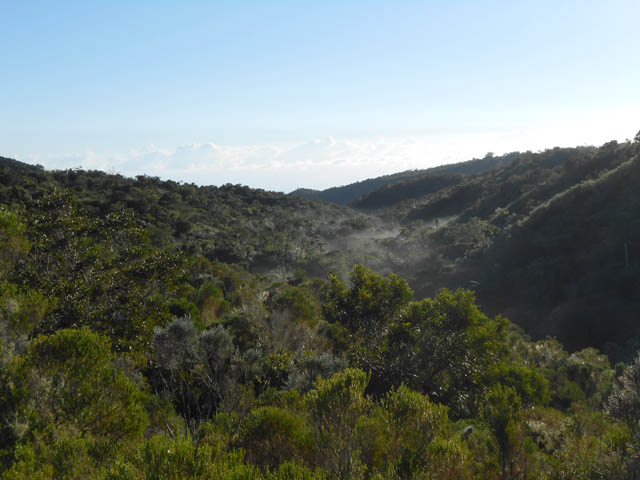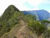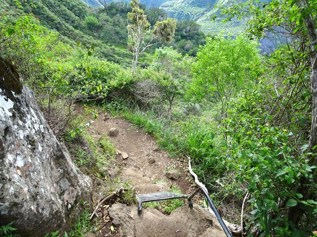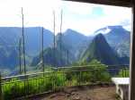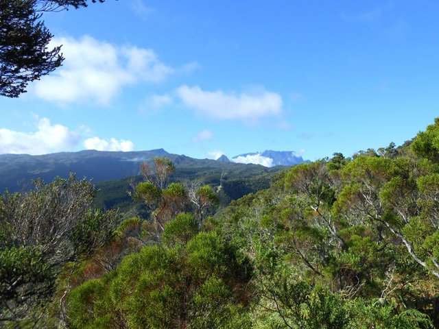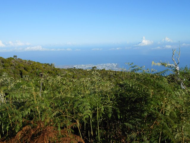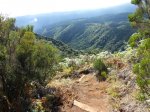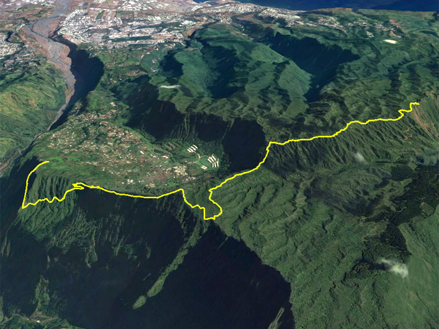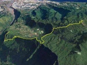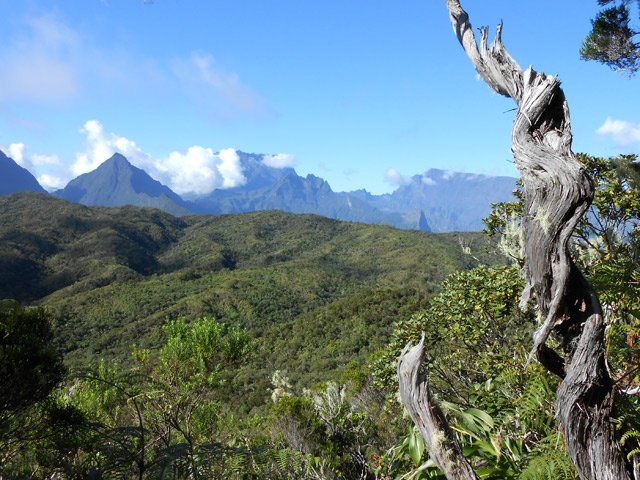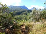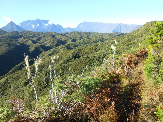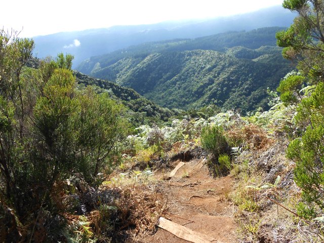 La randonnée débute à la fin officielle de la Route Forestière de la Plaine d'Affouches qui se poursuit longuement après la barrière qui interdit l'accès en raison des chutes de pierres fréquentes. Un kiosque marque le départ du sentier. On y trouve une pancarte explicative puis deux départs de sentiers (Photo 1) ; celui de droite est le Sentier des Lataniers qui rejoint Dos d'Ane par des dizaines de contournements de ravines et celui de gauche qui ira presque en ligne droite rejoindre le Rempart de Mafate à 5 km du kiosque. Avant de partir, ne surtout pas manquer le superbe point de vue sur l'Îlet à Guillaume d'où l'on peut apercevoir les restes de la grande case centrale dans son écrin de verdure jaunie par le feuillage des camphriers. On attaque immédiatement par une pente assez forte qui fait craindre le pire (Photo 2). Très vite, après quelques lacets, la pente se calme et on chemine à l'ombre d'une forêt de bois de couleurs. Le sentier glissant est couvert d'herbe très verte et il comporte des racines qui obligent à lever le pied et regarder où on les pose. Sans grande transition, on arrive au Piton de la Grande Chaloupe et les branles verts et fougères remplacent les bois de couleurs (Photo 3). Le sentier est magnifique et très facile malgré la pente moyenne (Photo 4). Certains passages usés par les semelles sont assez glissants mais le vide à côté n'est jamais dangereux (Photo 5). Les premiers tamarins des Hauts font leur apparition mais n'atteignent pas des tailles extraordinaires (Photo 6). Les larges panoramas englobent toute les forêts alentour (Photo 7). Sur la droite, à moitié cachée par les Fougères, la ville du port apparaît à l'horizon (Photo 8). On commence alors à cheminer en ligne de crête sur un sentier en pente douce qui domine la Plaine d'Affouches (Photo 9). Pas de grands affouches dépassant de la forêt mais une mer de verdure avec, sur la gauche, la vallée encaissée de la Rivière Saint-Denis (Photo 10). Les premiers pitons de Mafate se montrent à l'horizon et plus on va vers le Sud, plus ils grandiront (Photo 11). Le sentier est toujours aussi exceptionnel malgré son étroitesse et la marche est un réel plaisir (Photo 13). Quelques petites pentes ou descentes amènent tranquillement au sommet du Piton Batard qui permet des vues à près de 360° un peu masquées par la végétation des branles verts (Photo 14). Profiter du vaste panorama avant d'entamer la descente (Photo 15 et ( 16). La seule difficulté de la matinée se présente alors par la descente de ce piton pourtant très discret. Le sentier y est étroit, envahi de cailloux et de racines, bordé de beaux bois de couleurs et de jouvences humides. La boue est très fréquente mais c'est surtout la pente qui pose problème car elle est assez abrupte par moments (Photo 17). Heureusement c'est de courte durée. Le sentier va longer sur un kilomètre le cirque de Dos d'Ane qu'on devine à travers les brandes (Photo 18). On retrouve le plat et on poursuit vers le Sud. 200 mètres après la fin de la descente, les plus curieux chercheront des yeux, sur la droite, le départ très discret du sentier qui rejoint Grand Coin. On arrive ainsi à l'approche du Piton Fougères mais il faudra auparavant effectuer un détour de 400 mètres vers l'Est. Inutile, sur les 10 hectares qui arrivent, de se poser la question de savoir comment ce piton a pu être baptisé ainsi : les fougères y sont tellement serrées qu'on aurait du mal à les traverser sans coupe-coupe. Une aire circulaire, vestige d'un ancien kiosque, marque la fin de ce sentier qui vient de rejoindre le GGR2. A partir de cette petite clairière, on aura sur le Cirque de Mafate les plus beaux panoramas sur les Crêtes d'Aurère et de la Marianne. On voit très bien la Roche Ecrite, le Cimendef et bien sûr le Gros Morne ainsi que presque tous les îlets du cirque. Poursuivre en cheminant à plat pour un temps sur un GR de très bonne qualité malgré quelques portions boueuses (Photo 19). Très vite, le sentier se met à descendre de plus en plus au milieu des nombreuses pierres qui semblent parfois barrer le passage. Les vues sur Trois Bras et la Roche Verre Bouteille sont vertigineuses (Photo 20). La végétation rend moins vertigineux les points de vue sur le village de Dos d'Ane (Photo 21). Faire attention sur certaines portions non protégées du vide où une glissade n'aurait rien de ludique. On arrive ainsi à la Roche Verre Bouteille (Photo 22).Après une visite ou un tour du monolithe, prendre le sentier de gauche et marcher en direction de Cap Noir. Le sentier est tout d'abord plat et facile (Photo 23). Les panoramas sur Mafate sont encore plus grandioses qu'au Piton Fougères car on a les crêtes toutes en longueur (Photo 24). Le sentier devient de plus en plus pentu, rocheux et technique. Heureusement, plusieurs échelles permettent de passer les obstacles les plus difficiles (Photo 25). On domine longuement l'Îlet Nourry et Deux Bras (Photo 26). Le sentier s'assagit et passe au plus près du kiosque pour profiter de la table d'orientation (Photo 27). Celle donnant sur le cirque a été effacée par le soleil mais on repère vite les lieux caractéristiques (Photo 28). Une rambarde borde le vide au départ du sentier vers Dos d'Ane qui effectue ensuite quelques courtes montées et descentes sur un sol terreux et le plus souvent caillouteux. On parvient au croisement avec le sentier venant de la Roche Verre Bouteille et une courte mais forte descente mène à la route et au parking. Retrouver un véhicule laissé là ou descendre vers Dos d'Ane par le Chemin de Cap Noir pour emprunter un bus ou faire demi-tour jusqu'au kiosque d'Affouches, mais attention à la fatigue pour remonter au Piton Fougères.