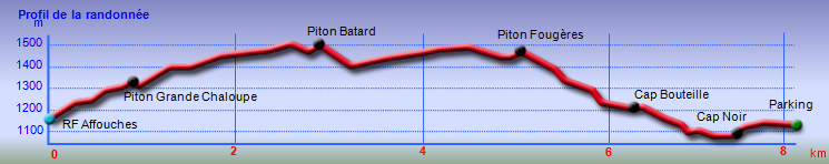 Deux sentiers relient le Kiosque d'Affouches à Dos d'Âne ; celui de droite rejoint le Piton Grand Bazard par d'interminables lacets à plat dans la forêt de bois de couleurs des Lataniers ; celui de gauche longe de manière assez rectiligne la ligne de crête qui rejoint le Piton Fougères. Un simple coup d’œil sur la carte permet de les différencier. Le premier est peu fréquenté mais le second est usé par les passages incessants des randonneurs ou des coureurs qui aiment à le parcourir en petite foulée. S'il est autant connu c'est surtout pour la qualité du sentier mais également pour les panoramas rencontrés tout au long du parcours. C'est tout d'abord la vallée de la Rivière Saint-Denis vers le Sentier de la Canalisation de l'Îlet à Guillaume, puis la Forêt de la Plaine d'Affouches avant d'arriver vers Mafate et de se régaler de tous ces pitons qui surgissent entre les îlets. Les zones humides traversées montrent bien que la pluie est beaucoup plus fréquente sur les hauteurs que quelques kilomètres plus bas vers la Rivière des Galets. Comme d'habitude le mieux est donc de partir tôt pour effectuer cette courte balade familiale mais sportive qui dépasse tout de même les 600 mètres de grimpées cumulées. On rencontre deux portions plus sportives pour la descente du Piton Batard puis une nouvelle descente vers la Roche Verre Bouteille (voir étymologie sur la fiche du Cap Noir). Comme il est toujours difficile de gérer l'organisation d'une sortie en aller simple ou de prendre les bus plus ou moins nombreux en fonction de l'heure, la meilleure solution, non proposée sur la carte et le profil ci-dessous, consiste à faire demi-tour par le même itinéraire ou par l'autre partie de la Boucle du Cap Noir et enfin pour les plus sportifs, prendre la troisième solution, la plus longue, qui consiste à revenir par le Sentier des Lataniers.