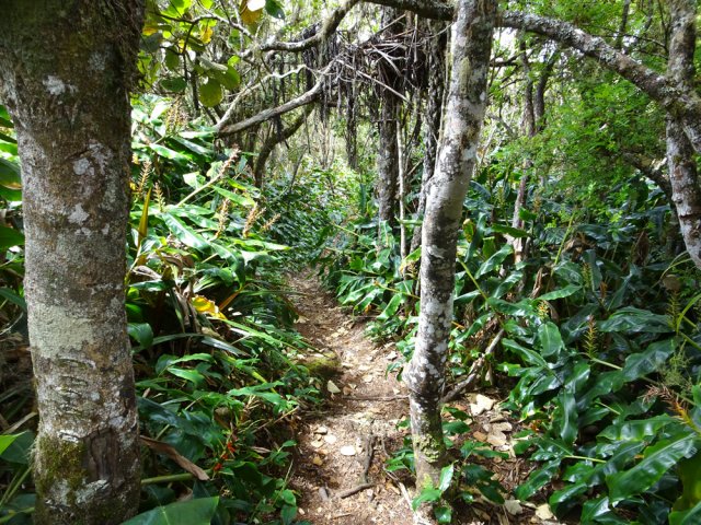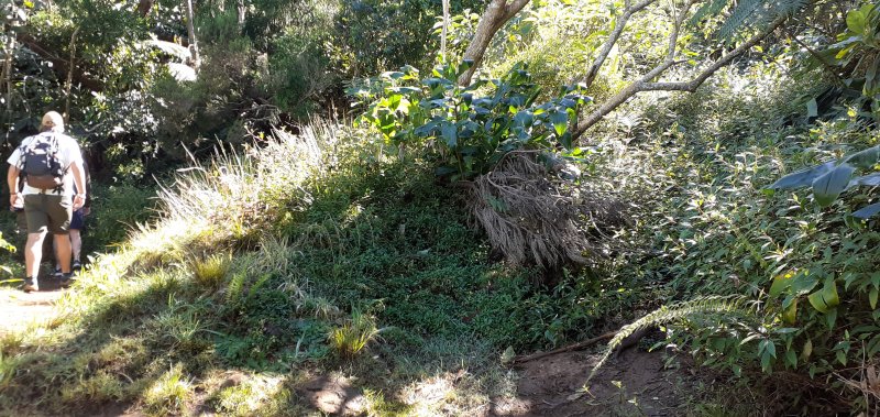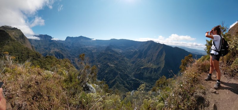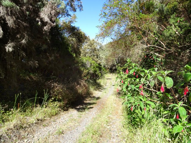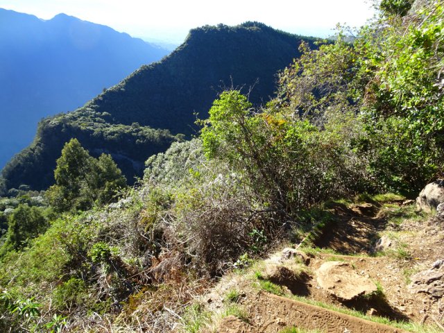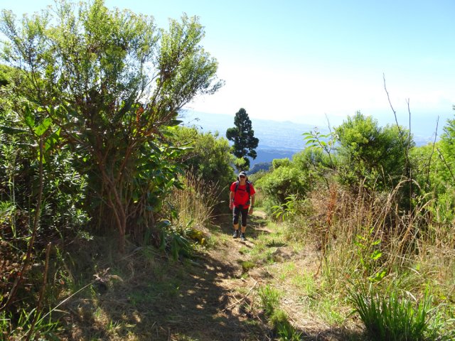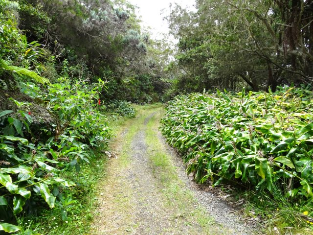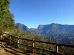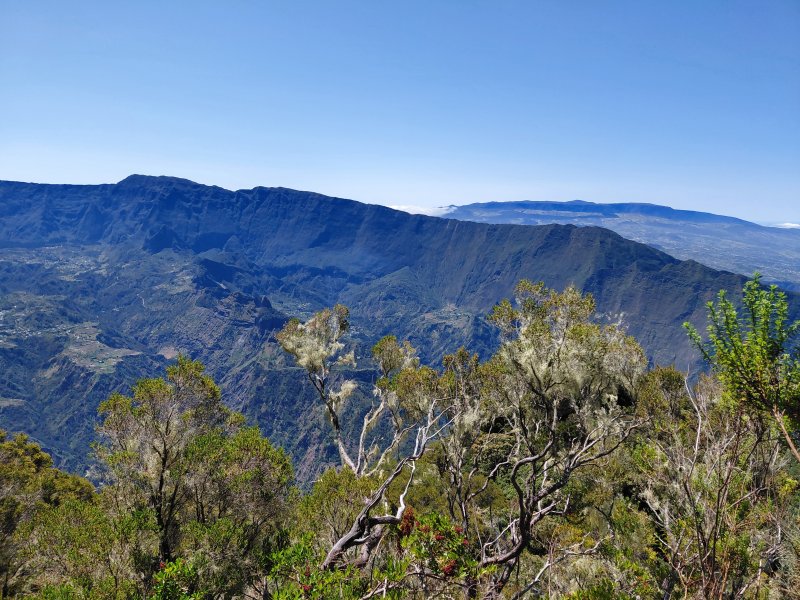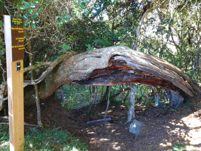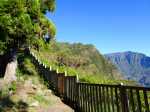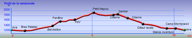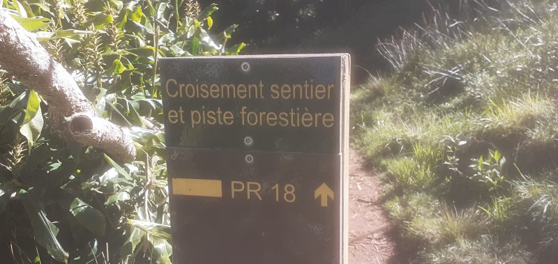 La randonnée débute à la grande aire de pique-nique fleurie érigée le long de la Route Forestière des Makes aux environs du Bras Patates. On a rencontré déjà d'autres aires aussi fleuries depuis les Makes mais plus petites. Celle-ci, de plusieurs hectares, est très bien entretenue et fleurie toute l'année. On peut commencer à marcher sur n'importe quel sentier puisqu'ils finissent tous par se rejoindre en aval près d'une piste de service. Poursuivre en faible descente jusqu'au premier croisement de sentiers, quelques mètres avant de franchir la ravine (Photo 1). Partir à gauche et longer le Bras Patates, tout proche, qu'on ne peut apercevoir au fond du talweg à cause de la végétation. Le sentier dans les bois de couleurs comporte quelques cailloux, des racines et surtout beaucoup de longoses (Photo 2). Plus loin, il est droit et assez plat mais parfois boueux, toujours dans les longoses. Un petit raidillon à mi-pente, assez caillouteux, ralentit à peine la progression (Photo 3). On parvient en une trentaine de minutes au premier croisement occupé par un belvédère en bois pour de belles vues sur le Cirque de Cilaos (Photo 4). On ne se lasse jamais de ce magnifique spectacle qu'on retrouvera souvent dans la montée. Entamer sur la gauche le sentier qui monte vers les antennes de la Fenêtre des Makes. Il est assez étroit, rocailleux et envahi de racines sur une pente souvent forte (Photo 5). Il grimpe en deux séries de lacets serrés séparés par un replat permettant à peine de souffler. Les paysages vers le cirque sont possibles depuis le sentier en bord de rempart (Photo 6). En se retournant, on profite également de vues sur le Piton Cabris (Photo 7). Les antennes et leurs petits bâtiments signent la fin de cette première montée sérieuse. Nouveau belvédère pour admirer le cirque déjà bien éclairé par les rayons de soleil (Photo 8). Après avoir repéré les principaux sommets, îlets ou villages, remonter tout le long de la barrière et poursuivre vers le Petit Mapou par la route de La Fenêtre puis en obliquant aussitôt à droite sur une large piste dans les cryptomerias (Photo 9). La pente est correcte et la marche facile malgré les racines de ces grands conifères (Photo 10). Plus haut les arbres ont disparu, coupés et aussitôt remplacés par les d'envahissantes (Photo 11). On frôle l'unique cryptomeria laissé par les forestiers et l'on regrette qu'il n'y en ait pas plus (Photo 12). On côtoie, tout au long de la montée, les troncs souvent empilés en train de pourrir. L'absence de cryptomerias permet de voir jusqu'à la côte à peine cachée par la Chaîne du Bois de Nèfles. Si la déforestation est agréable pour admirer les panoramas, il en est autrement de l'occupation des sols après la coupe. Toutes sortes d'envahissantes prennent possession des sols qui ne tarderont pas à se recouvrir de longoses. Les bois de couleurs prennent le relais avec une majorité de mahots et des mapous qui ont donné leur nom au petit piton, tout proche (Photo 14). Le sentier ombragé est assez facile avec marches, portions larges souvent bordées de beaux spécimens (Photo 15). L'humidité à cette altitude favorise la pousse des mousses et lichens dont les longues barbes de Jupiter. On rencontre plusieurs bifurcations. Toutes finissent sur le sentier principal et il est possible d'emprunter celui que l'on veut. L'itinéraire présenté utilise chaque fois le sentier partant sur la droite au plus près du rempart qu'on ne voit pas en raison de la forêt. Après un dernier point de vue sur Cilaos et le Gros Morne qui se rejoint en trente mètres, la montée reprend avec quelques raidillons (Photo 16). La pente cesse au col du Piton du Petit Mapou (Photo 17). Du col, on devine le sentier remontant encore un peu pour rejoindre Camp 2000 (Photo 18). On parvient, un peu plus bas, au croisement surmonté d'un grand tamarin tombé qui crée une arche végétale où débute la piste herbeuse en direction de la RF du Haut des Makes (Photo 19). Cette piste plate repose de la dernière montée en mouillant un peu les pieds avec la rosée mais elle s'est transformée en sentier agréable dans la verdure (Photo 20). A la citerne qui marque la fin de la piste, marcher 400 m sur la très agréable route forestière entourée de tamarins et de fuchsias (Photo 21). Ne pas manquer le sentier bifurquant à gauche en direction du Camp Montplaisir. Il plonge dans les bois de couleurs en direction d'une nouvelle citerne. La pente y est parfois forte et la descente peut être glissante mais il est tellement beau qu'on oublie l'effort (Photo 22). Les longoses, hélas, ont débuté leur colonisation qui détruira tout sur leur passage (Photo 23). On les retrouve d'ailleurs le long de la route forestière bordée tout de même de beaux tamarins (Photo 24). Le jeu consiste désormais à rejoindre le point de départ sans manquer un seul de la demi-douzaine de raccourcis entre les lacets. Le passage fréquent de randonneurs empêche, pour un temps, les longoses de les recouvrir (Photo 25). On retrouve plus bas les bois de cryptomerias près d'une aire pour parapentistes (Photo 26). A la Source Soulayre, les lacets sont de plus en plus courts mais les raccourcis, faciles à deviner, subsistent (Photo 27). Cette longue descente prend fin sur la Route Forestière de la Scierie qui frôle une réserve d'eau en face de l'accrobranche de Makes Aventure (Photo 28). La zone peut être très bruyante des cris enfantins selon le jour de la semaine. Le véhicule est facile à retrouver en partant sur la droite et en longeant la route des Makes jusqu'à l'aire de pique-nique, fin de la boucle.