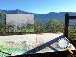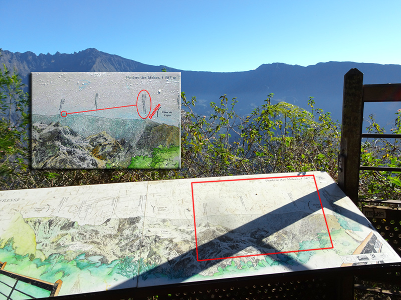 Cette large plaque de céramique couverte de rosée le matin comporte une petite erreur entourée ici de rouge. Le sommet du Dimitile a été remplacé par le Sommet de l'Entre Deux. Ce dernier, situé plus près de Bras Sec que de Palmiste Rouge est repéré sur la photo par le petit cercle rouge. Erreur sans grande importance mais difficile à effacer après cuisson au four !