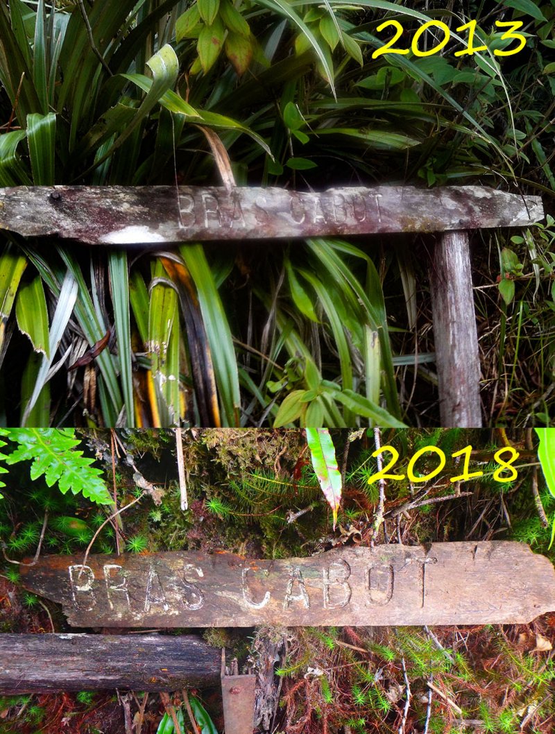 Le sentier de Bras Cabot est officiellement fermé suite à un important éboulis comme le précise la pancarte placée au début du circuit. Cette randonnée, effectuée déjà avec difficulté en juillet 2007, avait été maintenue sur le site afin de proposer quelques bribes d'informations pouvant aider ceux ou celles qui auraient malgré tout aimé aller y jeter un coup d'oeil ; une personne avertie en valant en général deux. L'article en place n'avait pourtant qu'un seul but : empêcher quiconque d'aller se griffer pour ne même pas voir la vallée du Bras Cabot. L'organisation, en octobre 2013, d'une sortie dans la zone a permis de constater que ce sentier avait été bien réhabilité jusqu'à la Source Cresson et dégagé de ses pestes jusqu'à la Ravine Pavée par un inconnu courageux. Nous avons poursuivi son oeuvre et dégagé une portion qui va de cette ravine jusqu'au bord du rempart vers le Bras Cabot.