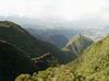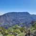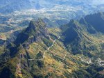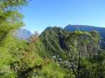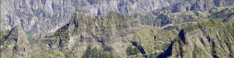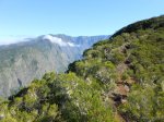 La randonnée débute ici au Bras de Cilaos mais peut tout aussi bien commencer à trois autres points précis de l'Entre Deux afin de diminuer les distances et grimpettes. Il n'y a pas de trace au départ dans le Bras de Cilaos (elles sont en revanche bien portées sur les cartes IGN) mais le sentier qui monte à l'Entre-Deux est facile à trouver. La mise en jambe est alors sérieuse mais sera nécessaire à cette belle ascension. Le sentier, très large, frôle l'Îlet Rolland et monte assez sérieusement sous les manguiers, poivriers ou bambous avant de franchir plusieurs lacets et terminer à la réserve d'Eau de Coteau Sec (Photo 1). Longer la ruelle du château d'eau et prendre immédiatement à gauche pour remonter la rue et passer près de plusieurs réservoirs d'eau (Photo 2). La montée sur béton ou goudron est assez rude et ne permet pas de se reposer pour poursuivre vers le Sentier du Coteau Sec (Photo 3). Ce sentier, large et bien réhabilité monte très légèrement sous des filaos puis des bambous et se termine par une forte descente à la Rue Corré, proche d'une dernière citerne. Profiter, durant cette descente sous quelques manguiers et filaos, pour déjà apprécier le chemin restant à parcourir vers le Dimitile (Photo 5). On ne marche que quelques mètres sur la route car le sentier Bayonne débute à gauche. Un panneau indique la distance et la difficulté de la sortie quand il ne précise pas une fermeture provisoire, souvent difficile à justifier. On marche tout d'abord dans l'herbe sur un sentier en pente douce (Photo 7). Il s'assombrit plus haut en passant sous les jamrosas du Plateau Raisin. Les premiers panoramas font ensuite leur apparition. On voit bien l'Ilet à Furcy et le Petit Serré mais on a du mal à distinguer les belles gorges à cause de la végétation (Photo 6). Elles sont parfois presque sous les pieds des marcheurs tant la falaise est verticale. Le sentier est parfois très étroit et totalement en ligne de crête (photo 9 ou 10) : attention de ne pas glisser car la chute peut être brutale. Plus on monte et plus le sentier chemine sur la ligne de crête donnant des panoramas de plus en plus larges (Photo 12). Quand on arrive à la verticale du Pavillon, on aperçoit très bien la route tortueuse filant vers Cilaos (Photo 14). En face, on distingue la Fenêtre des Makes couverte de cryptomerias ainsi que le Piton Cabris qui la domine (Photo 15). Il faut hélas effectuer de nombreuses descentes et remontées pour franchir en fin de parcours les dents de scie du Dimitile (Photo 16). En se retournant, on peut admirer les crêtes vers la Jument et le Zèbre ou la Bras Long (Photo 1) ainsi que les villes du littoral du côté de Saint-Pierre et Saint-Louis (Photo 19). Il faut encore employer des sentiers en fortes montées sur de nouveaux pitons (Photo 23) ou en fortes descentes glissantes sur un sol sableux (Photo 25) pour se rapprocher du sommet du Dimitile. Mais, comme d'habitude, le spectacle du Cirque de Cilaos depuis la table d'orientation, déjà aperçu avant d'arriver au belvédère permet d'oublier tous les efforts fournis jusque là. Cette alternance de montées, de descentes, crêtes, ravines, zones sèches ou humides, escaliers de rondins, échelles ou pentes douces font paraître le sentier plus long qu'il n'est réellement.