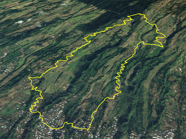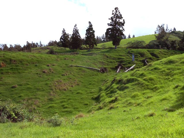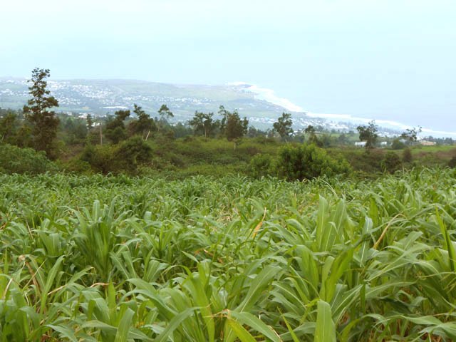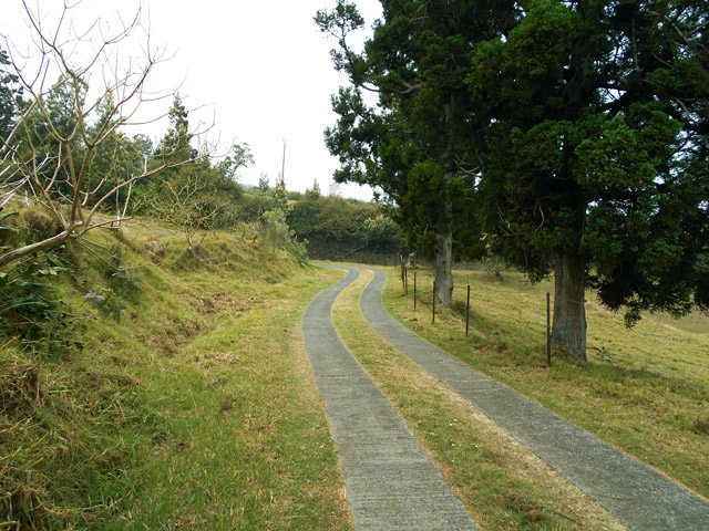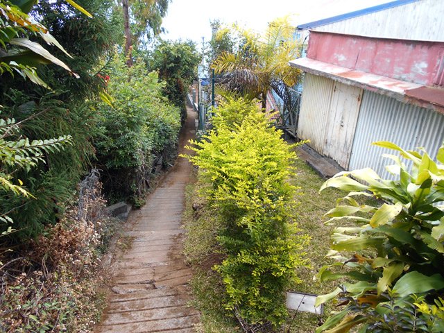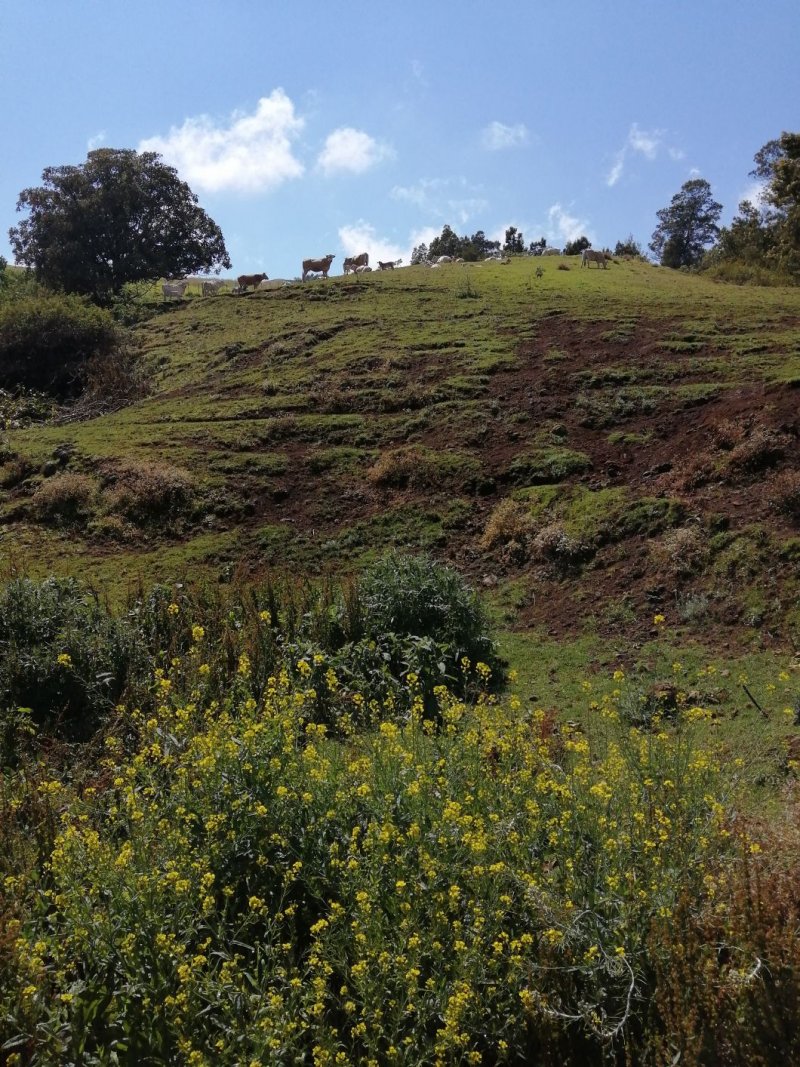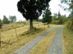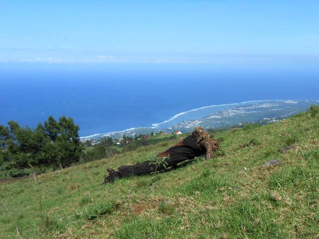 La boucle débute sur la rue Alexandre Bègue, près de la chapelle et de l'école, afin d'entamer la traversée de Notre Dame des Champs avec une circulation moyenne mais des trottoirs assez larges pour marcher sans danger. Marcher et chercher sur la gauche le départ du Sentier Roullin qui débute par une volée de courtes marches entre les clôtures des habitations (Photo 1). Les marches sont remplacées un peu plus haut par un sol bétonné qui traverse les jardins fleuris en longeant quelques cases entourées de grillages (Photo 2). Il est toujours agréable de prendre ces raccourcis étroits pour mieux saisir l'atmosphère d'un village (Photo 3). Heureusement, les meutes de chiens habituels sont plus rares. Il se transforme encore en sentier étroit, bordé de grands galaberts, glissant si mouillé et comportant quelques marches taillées à même la terre (Photo 4). Il rejoint des habitations qu'il faut contourner par la gauche avant de reprendre à droite en direction de la Route Emmanuel Payet sur des portions qui ont souffert de l'invasion de longoses, galaberts et vigne marronne (Photo 5). Fermer les yeux à certains endroits pour ne pas voir les ordures mais les ouvrir tout de même pour ne pas marcher dessus ! Le franchissement du Bras Mouton, étroit et rocailleux, s'effectue également au milieu des vignes marronnes (Photo 1). La route bétonnée qu'on découvre est étroite et également bordée de ces plantes souvent piquantes (Photo 7). Elle est tout en lacets courts qui traversent les prairies, longent les petites fermes, champs ou cases sur une pente raisonnable (Photo 8). Les panoramas sur l'océan sont nombreux surtout en direction de la Saline et de l'Ermitage (Photo 9). Les acacias noirs bordent le plus souvent le chemin lorsqu'il n'y a pas de prairies et leur odeur agréable se repère de très loin (Photo 10). Le regard porte aussi vers Saint-Leu, au-dessus des champs (Photo 11). Les troupeaux sont partout et ne semblent pas effrayés par le passage des randonneurs (Photo 13). Il faut dire qu'à 1000 m d'altitude, la température est idéale pour l'élevage et qu'ils vivent ici sereinement. La route devient plate à un moment, avant de rencontrer la Route Vaudeville qu'on emprunte en partant à gauche au croisement. La pente n'en est pas terminée pour autant. On se retrouve en face d'une pancarte de rue indiquant le Chemin des Cryptomerias. Prendre à gauche et passer plusieurs fermes ou un centre équestre ainsi que des ravines dont celle des Colimaçons (Photo 16). La pente cesse, longe encore quelques prairies et la route descend doucement dans un bois de cryptomerias (Photo 17). Une aire de pique-nique constituée de tables et kiosques occupe le couvert des arbres autour d'un croisement, lieu idéal pour une pause après cette longue montée de 600 m (Photo 18). Prendre la première route sur la gauche (Photo 19) qui descend vers quelques fermes puis se transforme en deux bandes de roulement bordées de pelouse plus ou moins haute en fonction de la saison (Photo 20). La pente est faible, les troupeaux sont nombreux dans les prés (Photo 22), l'herbe est omniprésente (Photo 21) et les panoramas très larges sur la Saline les Bains. Les bandes de roulement sont parfois soulevées par les racines des cryptomerias poussant à leur côté et le passage des véhicules en dehors des bandes a tendance à abîmer cette belle route. Mais en règle générale, ce long tronçon de route pastorale est un vrai plaisir de calme et de solitude (Photo 23). Quelques cryptomerias et de longues clôtures bordent cette route originale (Photo 24). Les lacets sont nombreux et les raccourcis rares mais on ne fournit aucun effort hormis celui de regarder autour de soi les belles prairies vallonnées (Photo 27). Ne chercher aucun raccourci car toutes les pistes rencontrées se terminent en terrain privé sauf une en fin de parcours dont l'état n'est pas toujours excellent. Guetter seulement la grande réserve d'eau circulaire située dans un lacet vers la droite. C'est là que commence le Chemin Auguste Bourdon qui ramène sans problème à la Route Hubert Delisle à deux pas de la Ravine des Colimaçons au fond constitué de larges plaques de basalte (Photo 28). Il ne faut que deux minutes pour rejoindre véhicule garé dans le village de Notre Dame des Champs.