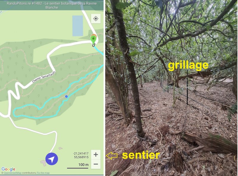 Photos 1 & 2 : sur le plan, la trace telle qu'indiquée par mon GPS, ne peut être suivie. Sur le terrain, la question ne se pose pas : il suffit de suivre le sentier (indiqué "sentier botanique de la Ravine Blanche" sur openstreetmap).