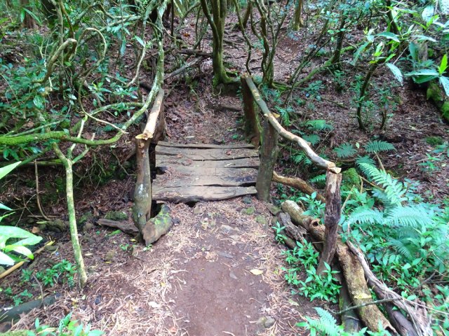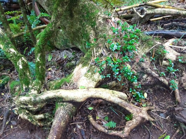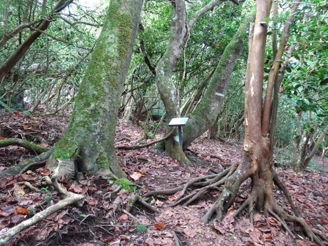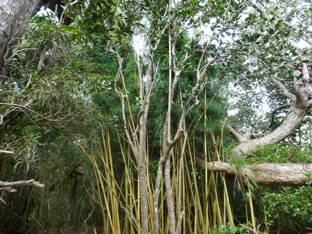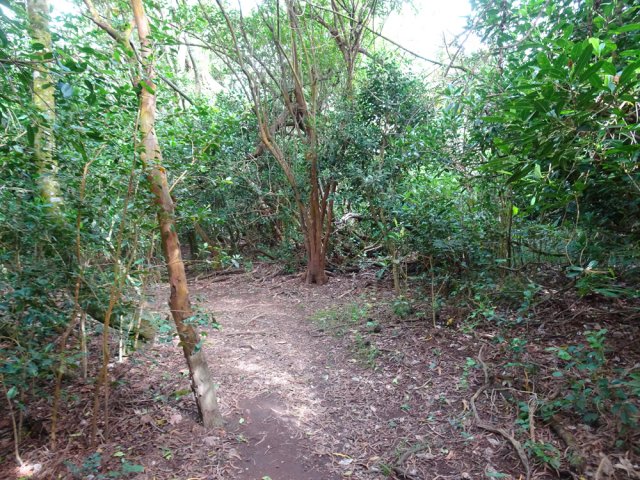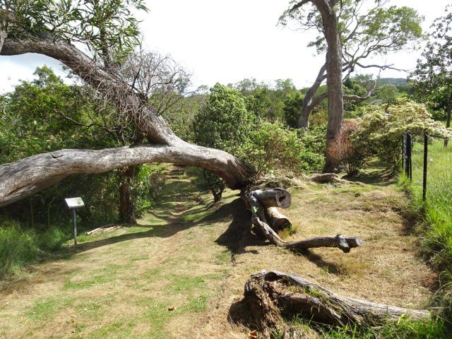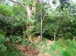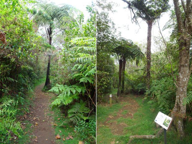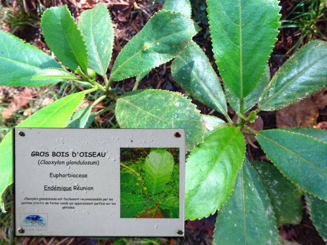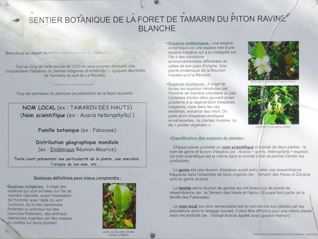 Il est toujours difficile de présenter un sentier botanique souvent très vite saccagé et les descriptions d'un moment ne sont plus valables peu de temps après. Souhaitons que celui-ci, situé assez près des habitations du village de la Ravine Blanche, garde encore longtemps ses petites pancartes descriptives même si elles se recouvrent très vite de mousse, rendant difficile la lecture des noms de plantes. La région est pauvre en essences de bois de couleurs car le tamarin des hauts domine. Si le sentier est autant tortueux par moments c'est qu'il a fallu zigzaguer d'arbre en arbre pour les présenter. La trentaine de petits panneaux explicatifs n'ayant jamais été nettoyés, il est souvent difficile de lire le nom de la plante concernée. Lorsque les explications sont lisibles, c'est la plante elle-même qui a disparu ! Insuffisant donc pour se cultiver sur la flore réunionnaise mais un pur plaisir de balade en sous-bois après une boucle plus aérée sous les tamarins du circuit pédestre, marmaille ou de santé de la forêt de tamarin du Piton de la Ravine Blanche.