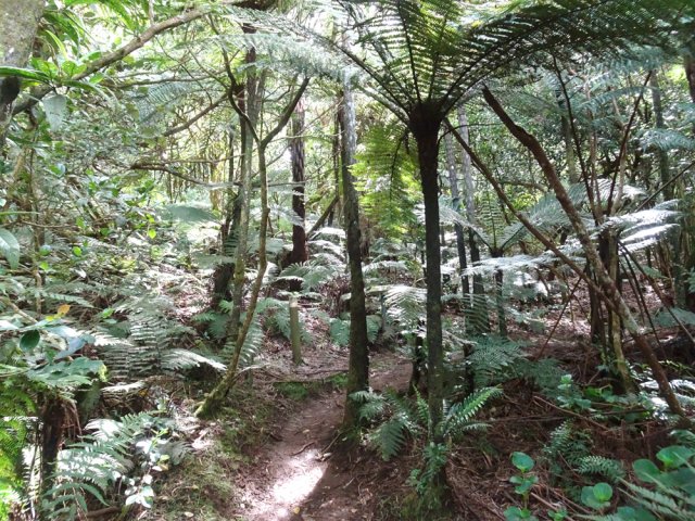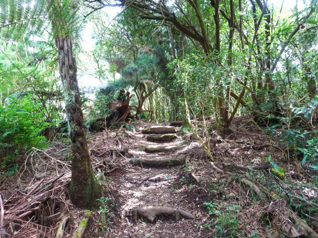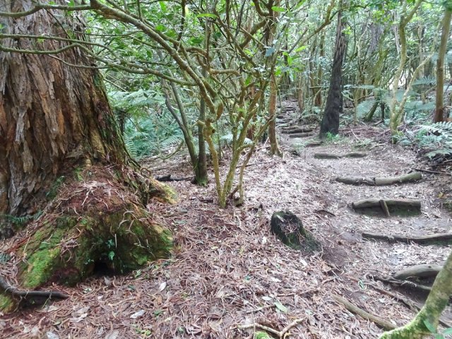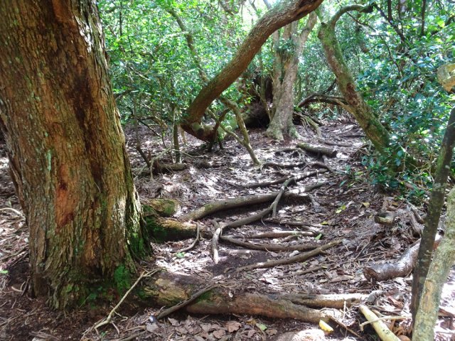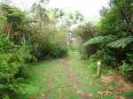 La randonnée débute sur l'un des parkings de la tamarinaie de la Ravine Blanche. Celui proche de la réserve d'eau permet de beaux points de vue sur l'océan et les cirques avant de se lancer sur la petite boucle. Suivre plein sud la petite route qui se termine rapidement en cul de sac, fermée par une barrière. Le sentier partant à droite est commun sur une dizaine de mètres au circuit pédestre et au sentier botanique. Un panneau confirme la bonne direction (Photo 1). Il explique la différence entre plantes exotiques, indigènes ou endémiques et leur classification (Photo 2). Très vite, le premier panneau explicatif arrive près d'un tamarin des Hauts bordant le très agréable sentier herbeux (Photo 3). On pénètre ensuite dans le sous-bois constitué essentiellement de bois de couleurs (Photo 4). Certains sont de bonne taille et comportent de belles racines (Photo 5). Quelques panneaux encore lisibles renseignent sur le nom de l'espèce. Ils se multiplieront durant le trajet et permettront de différencier les essences rencontrées, dont certaines sont peu communes (Photo 6). Le sentier est beaucoup plus végétalisé que les autres parcours autour de la Ravine Blanche. Comme toujours en sous-bois, on marche sur des racines ou de la terre, plus rarement dans la boue. Par temps de pluie, certaines portions seront plus grasses. La descente est faible et comporte peu de difficultés. Il faut franchir parfois quelques ravines si petites qu'elles ne figurent même pas sur les cartes IGN (Photo 7). Leur lit rocheux au fond moussu suffit pourtant à les classer en ravines. Quelques touffes de calumets poussent ça et là (Photo 8). Le sentier est le plus souvent tortueux, sans doute pour se rapprocher de certains spécimens. On rencontre même des portions planes mais elles sont rares (Photo 9). Les fanjans (fougères arborescentes) sont très reconnaissables à leur hauteur qui peut être impressionnante dans certaines régions humides (Photo 10). Les tamarins sont plus rares que sur les circuits plus au nord (Photo 11). Le sentier frôle à un moment un énorme tronc de tamarin des Hauts qui a fini au sol depuis la création de la boucle (Photo 12). Plus on descend et plus les fougères arborescentes bordent le sentier (Photo 13). A l'approche de la route, on passe au plus près du clou de cette petite boucle. C'est le tamarin le plus intéressant du circuit ; il comporte même une cavité entre deux de ses troncs principaux qui peuvent amuser les enfants (Photo 14). Après cette longue descente, le sentier fait une épingle à cheveux vers la gauche pour remonter vers le point de départ. Ne pas hésiter à emprunter le petit sentier qui mène au Chemin Tamar'Haut situé à moins de 10 mètres. Depuis la route, on profite d'un superbe panorama verdoyant sur les prairies et massifs. On aura à peu près les mêmes depuis le parcours qui longe les clôtures des prairies d'élevage (Photo 15 et 16). Reprendre le sentier puis entamer la remontée sous quelques tamarins procurant une ombre agréable. Remarquer au passage les longues lianes tortueuses de plusieurs mètres de hauteur et repérer leur feuillage qui recouvre la cime des arbres (Photo 17). Impossible de s'égarer sur la droite car on est immédiatement stoppé par le grillage (Photo 18). Il est même fréquent d'y voir les bestiaux rechercher de l'ombre (Photo 19). On retrouve la même végétation que lors de la descente puisque le premier sentier est à une vingtaine de mètres (Photo 20). La montée s'intensifie mais des marches la facilitent (Photos 21 et 22). Il reste des tamarins qui se raréfient et l'on en rencontre de plus en plus couchés sur le sol (Photo 23). Si presque tous les arbres meurent une fois au sol, le tamarin a cette particularité de pouvoir vivre des décennies après la chute si une partie des racines subsiste. On en rencontre un peu partout. Certains sont là depuis si longtemps qu'on ne voit plus leur tronc recouvert d'épiphytes, de mousses et de fougères. Certaines racines méritent une courte halte (Photo 24). Les calumets morts et branches coupées ont été laissés là pour mieux délimiter le sentier pourtant très visible (Photo 25). On retrouve quelques tamarins âgés toujours debout. L'un d'entre eux présente d'énormes racines pouvant servir de siège pour se reposer de la montée (Photo 27). La fin du parcours s'approche lorsque le sentier redevient plus plat entre les branches couchées au sol. L'arrivée au panneau s'effectue en légère descente passant sous un tamarin (Photo 28).