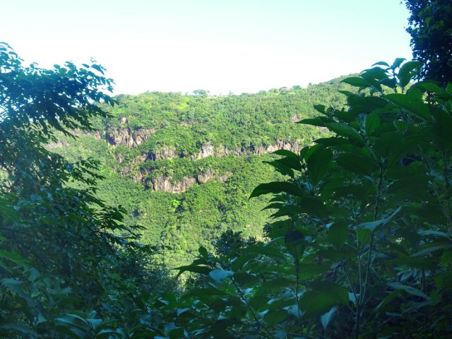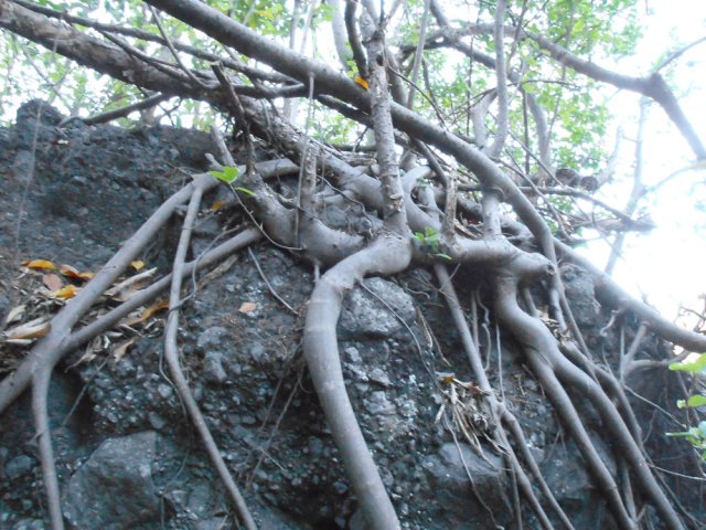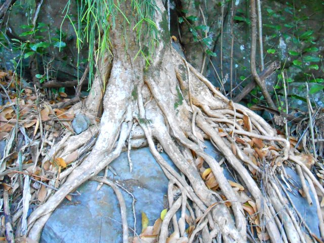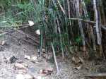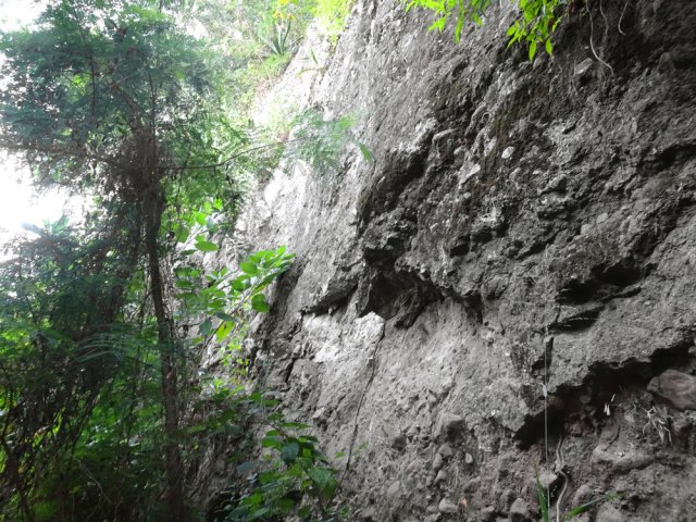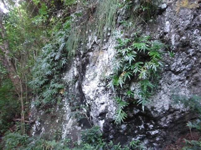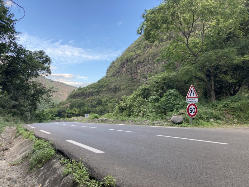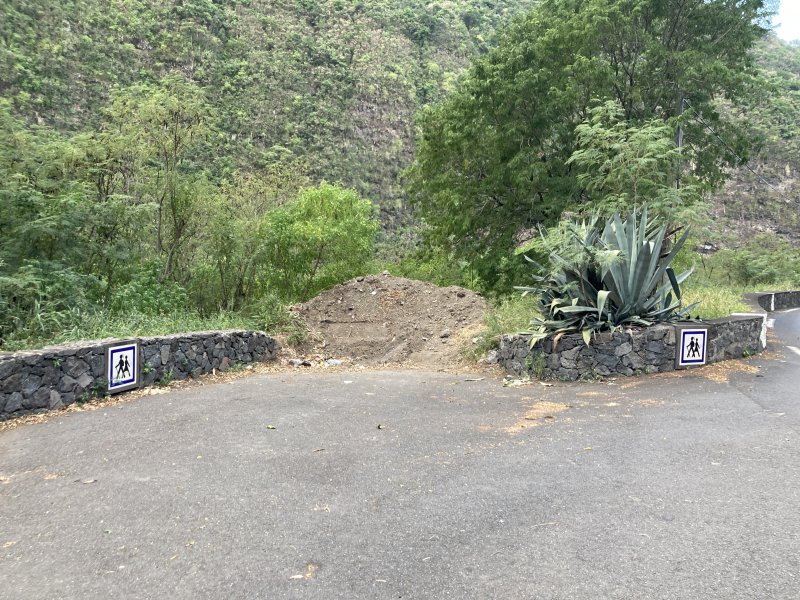 Le sentier est parfois étroit et glissant, et j'ai même traversé un petit pont bricolé en rondins de bois- photo 1. Arrivée à la propriété privée à Ilet à Rolland, j'ai débouché sur une piste forestière qui descend tranquillement au Bras de Cilaos. On y croise une grotte de bonne taille - photo 2. Cette piste est en amont de la trace et atteint la route de Cilaos pratiquement à la jonction de l'ancienne N5 et la nouvelle portion de N5 par une petti bout de sentier. Les photos 3,4 et 5 montrant l’endroit où le sentier rejoint la N5, face à un petit parking et près du nouveau radier sur la N5. J'ai donc profité pour aller voir l'ancienne N5, fermée à la circulation et jonchée de pierres tombées. J'ai traversé le petit pont pour me retrouver et visiter un bout du Petit Serre. A tout hasard, j'ai cherché un sentier qui me permettrait de faire un bout de boucle au dessus de la N5 et éviter la circulation. Rien. Demi tour par le même chemin déjà parcouru…commentaire édité, voir le suivant.